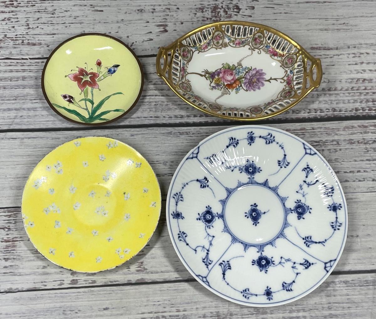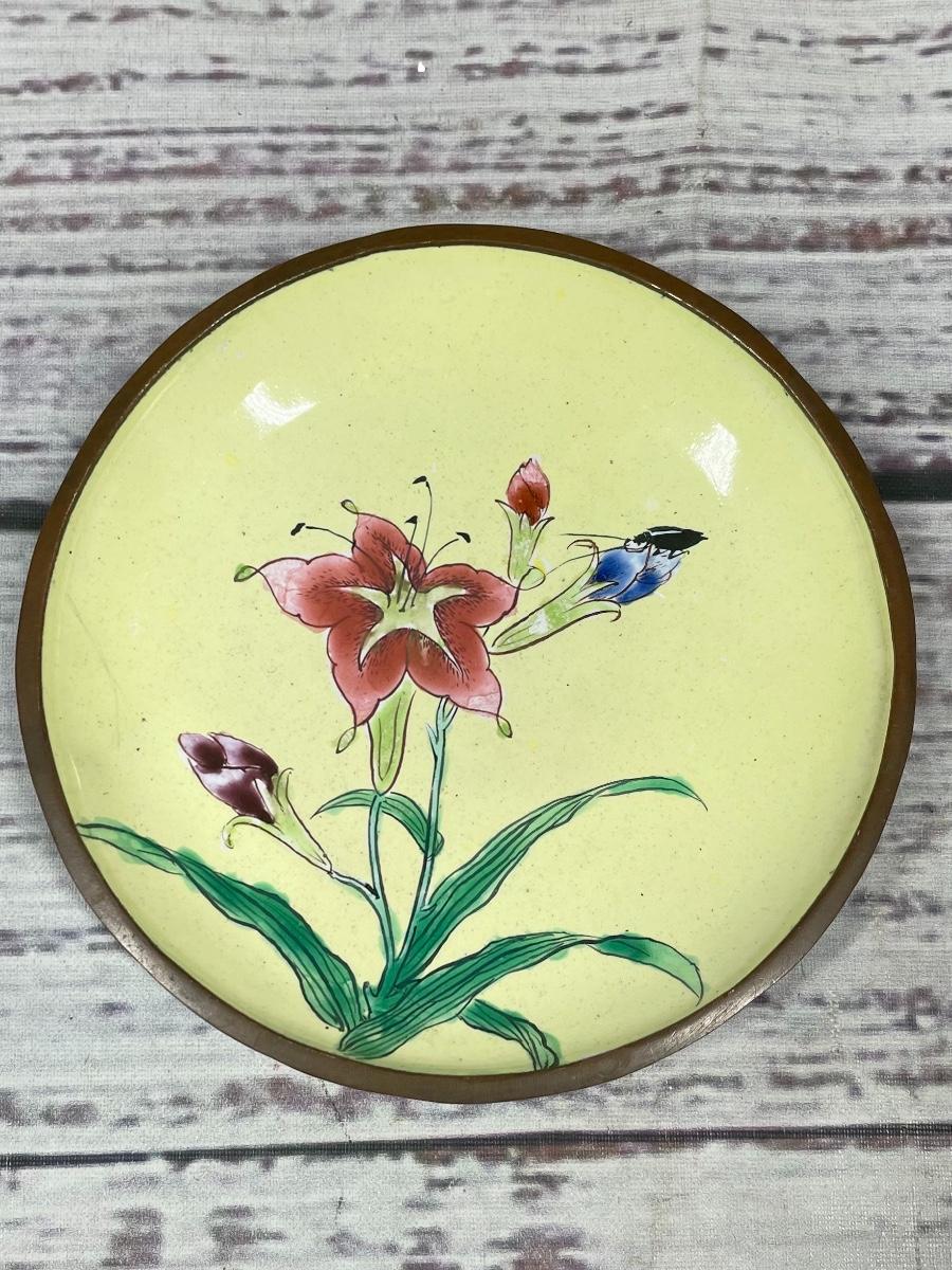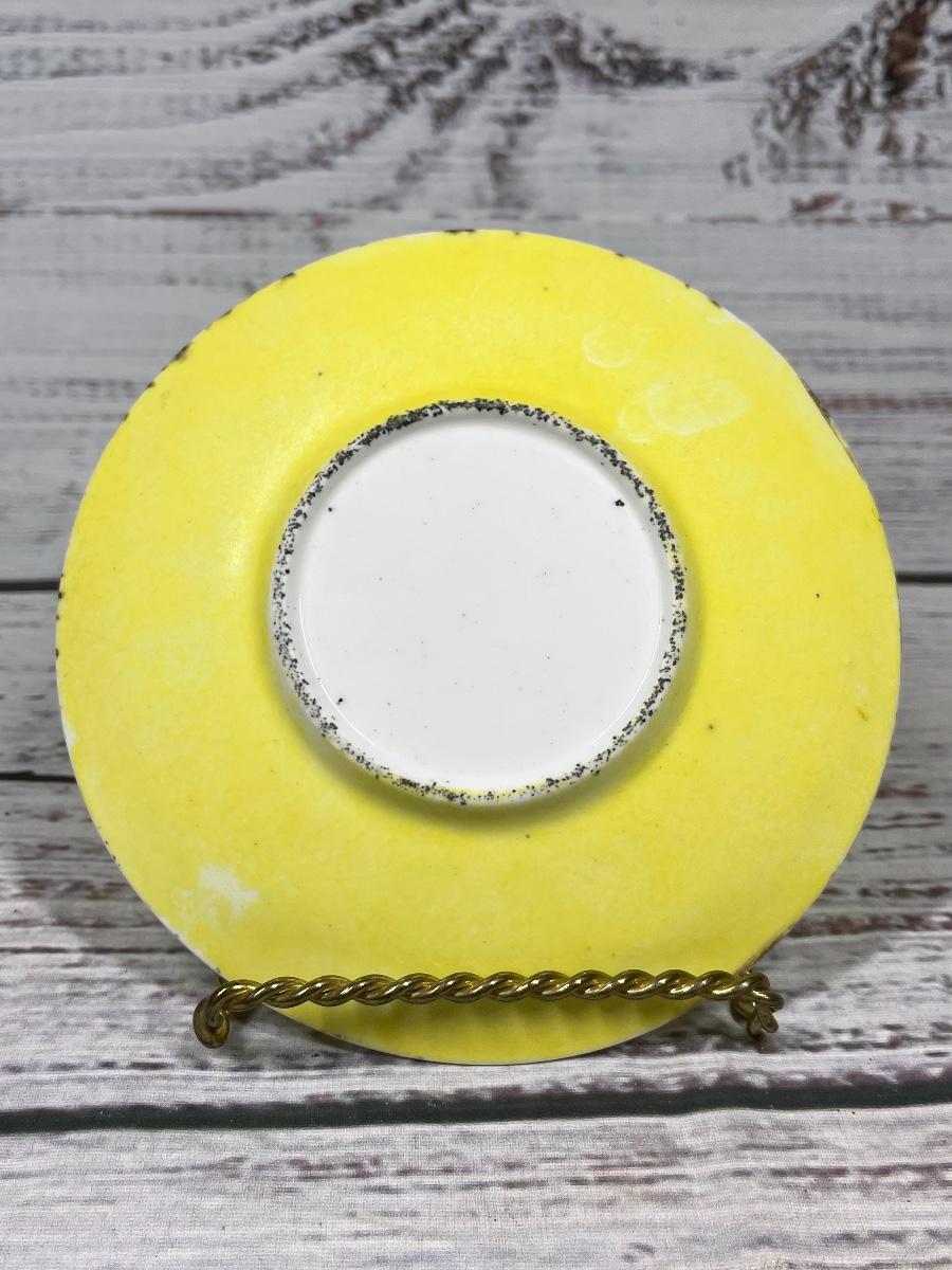 All items are in decent condition. The blue and white plate has a small chip on the side. The bigger yellow plate has some scratches and discoloration.