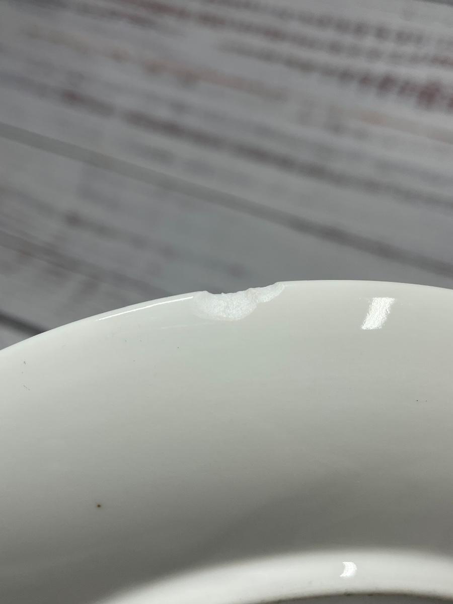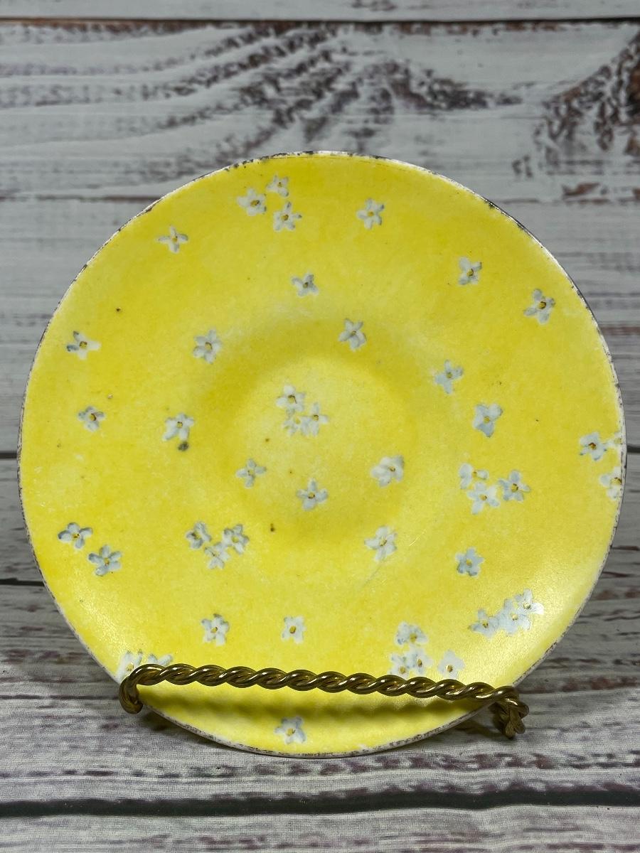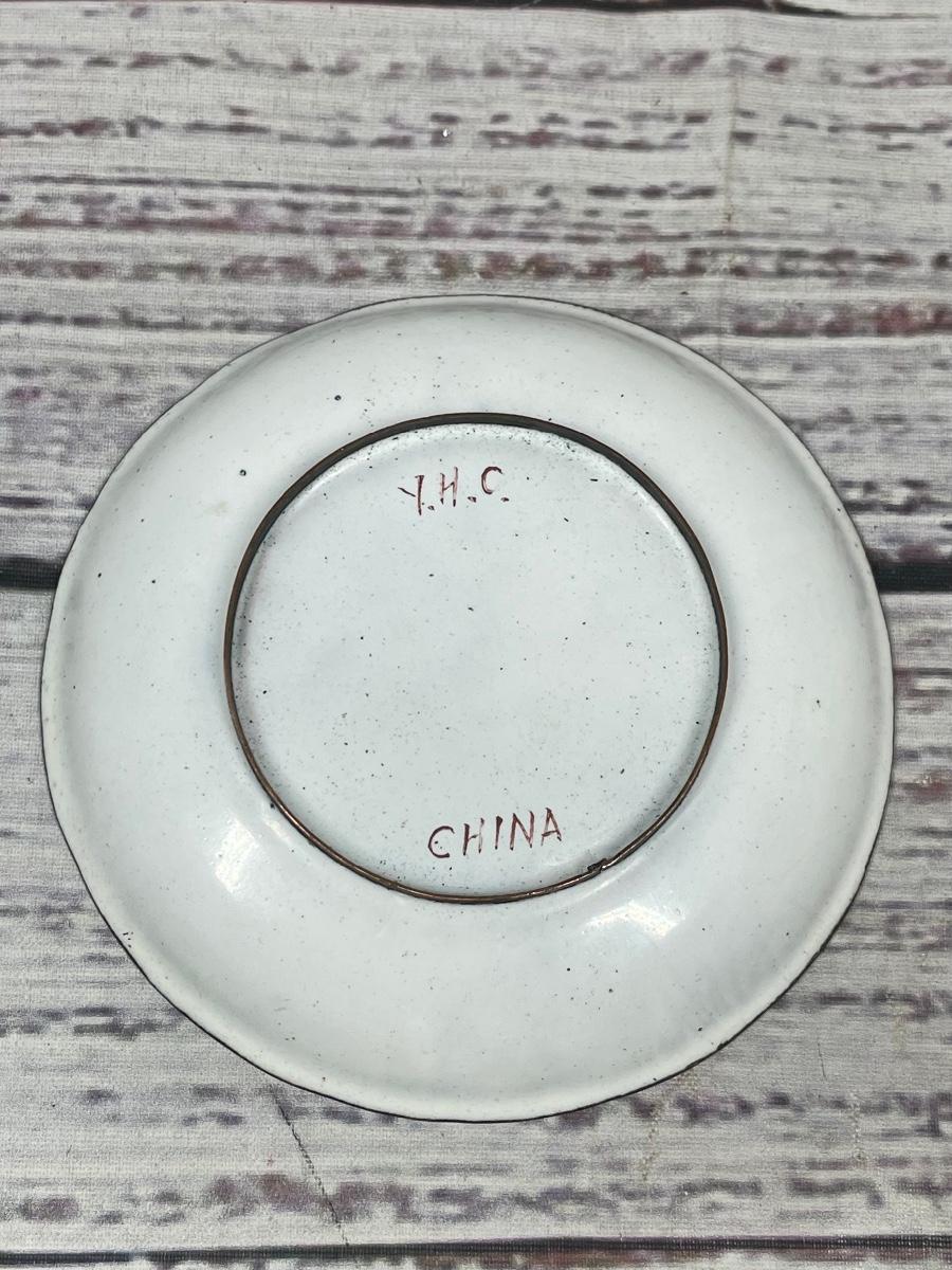 All items are in decent condition. The blue and white plate has a small chip on the side. The bigger yellow plate has some scratches and discoloration.