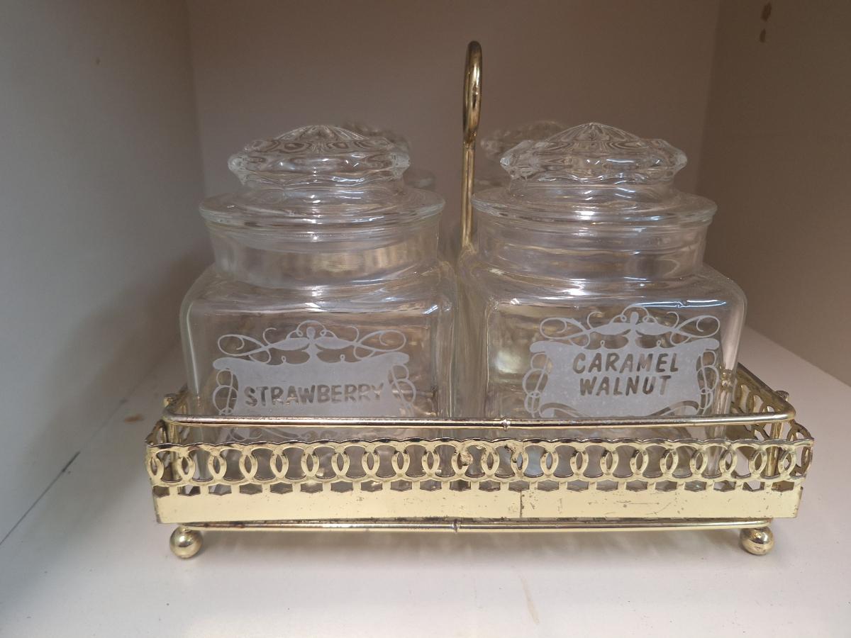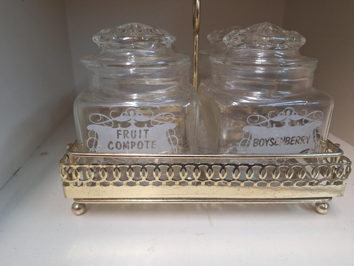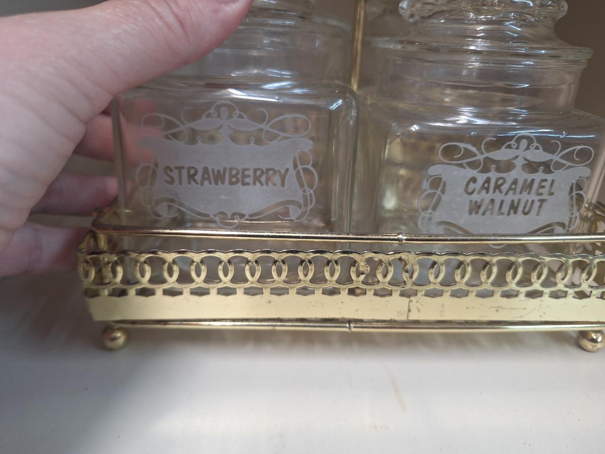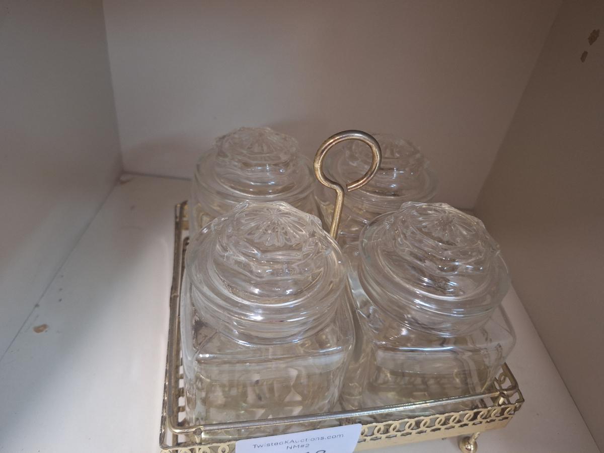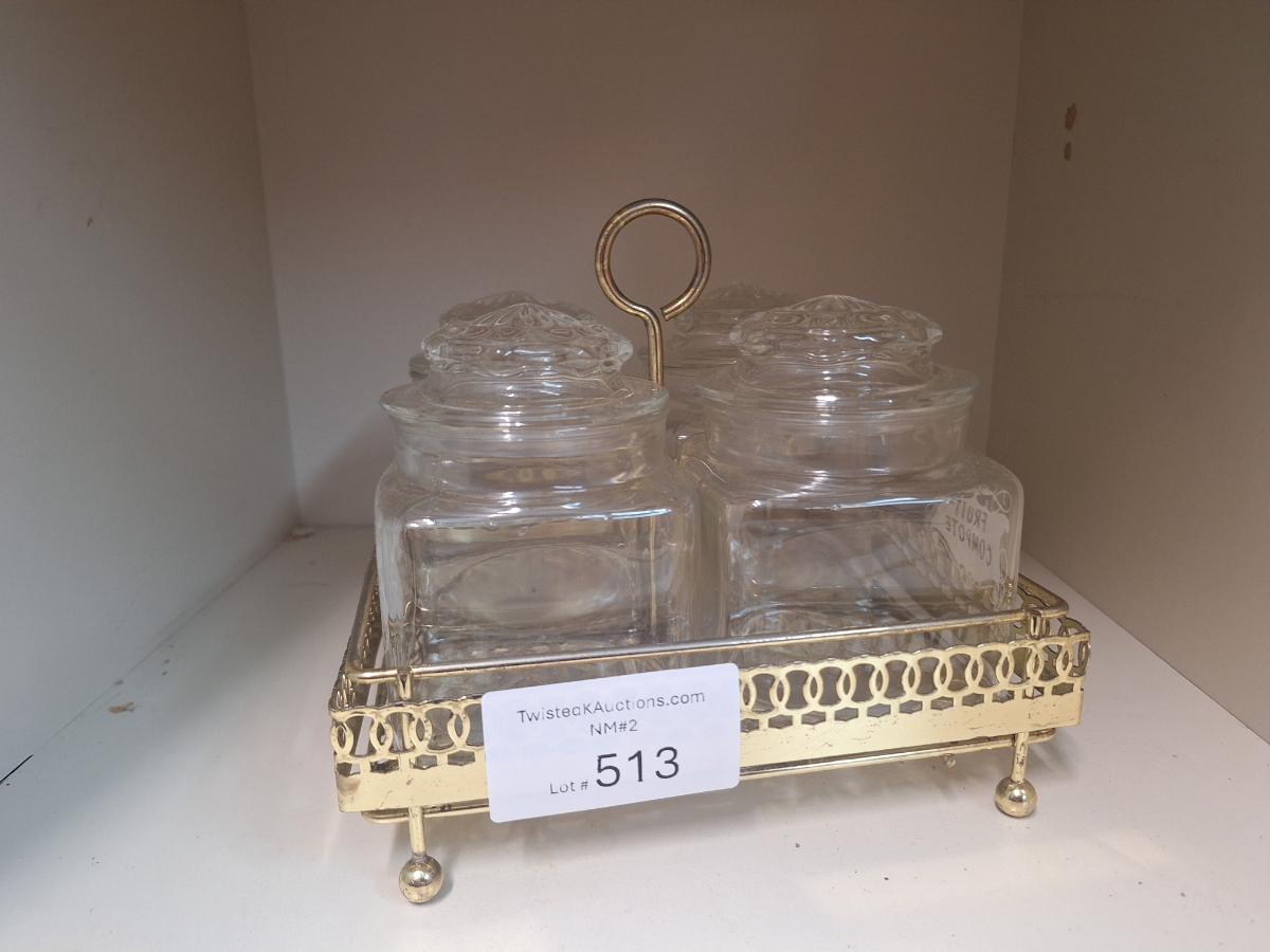 set of four glass apothecary jars in gold tone metal holder caddy, jars have etched design see all photos.