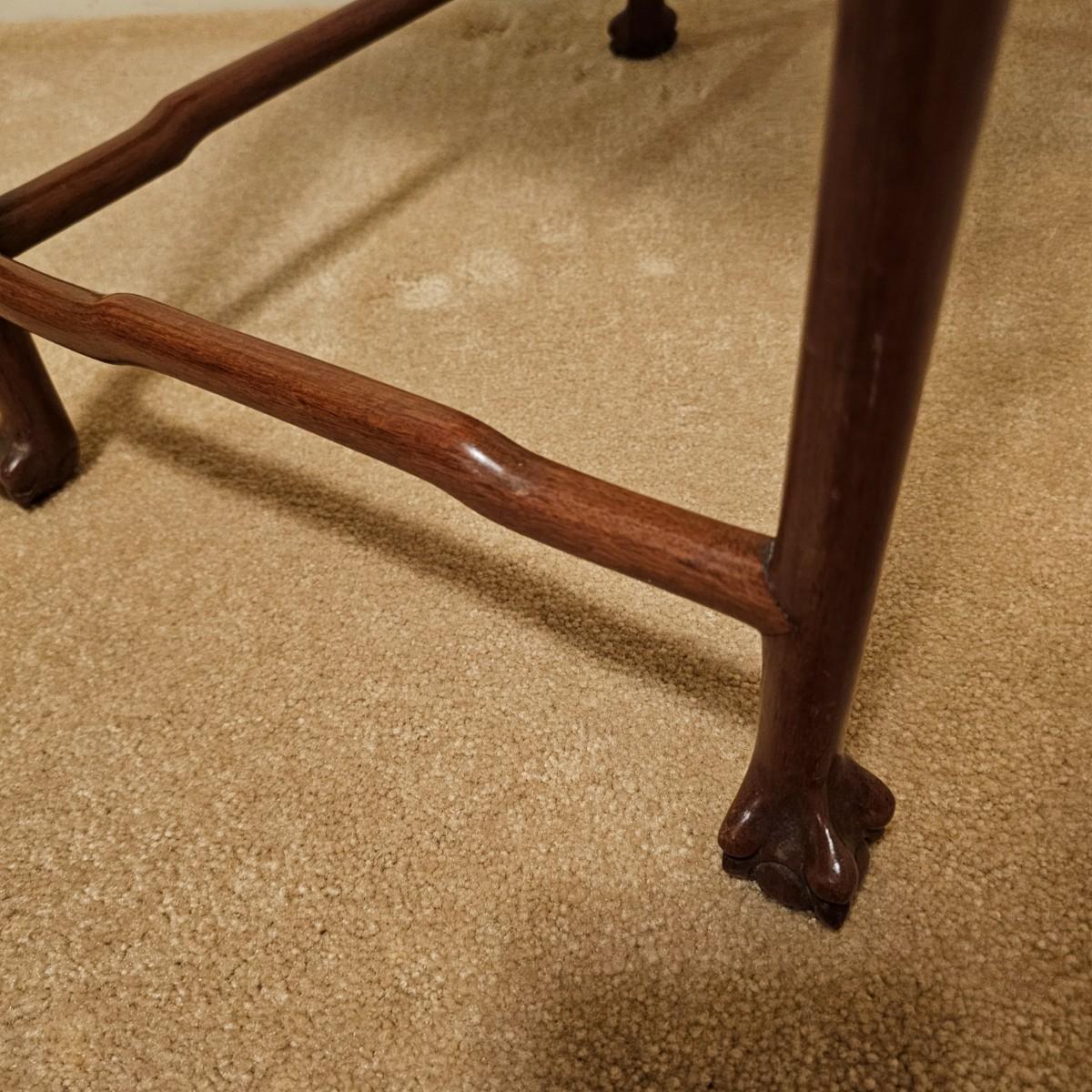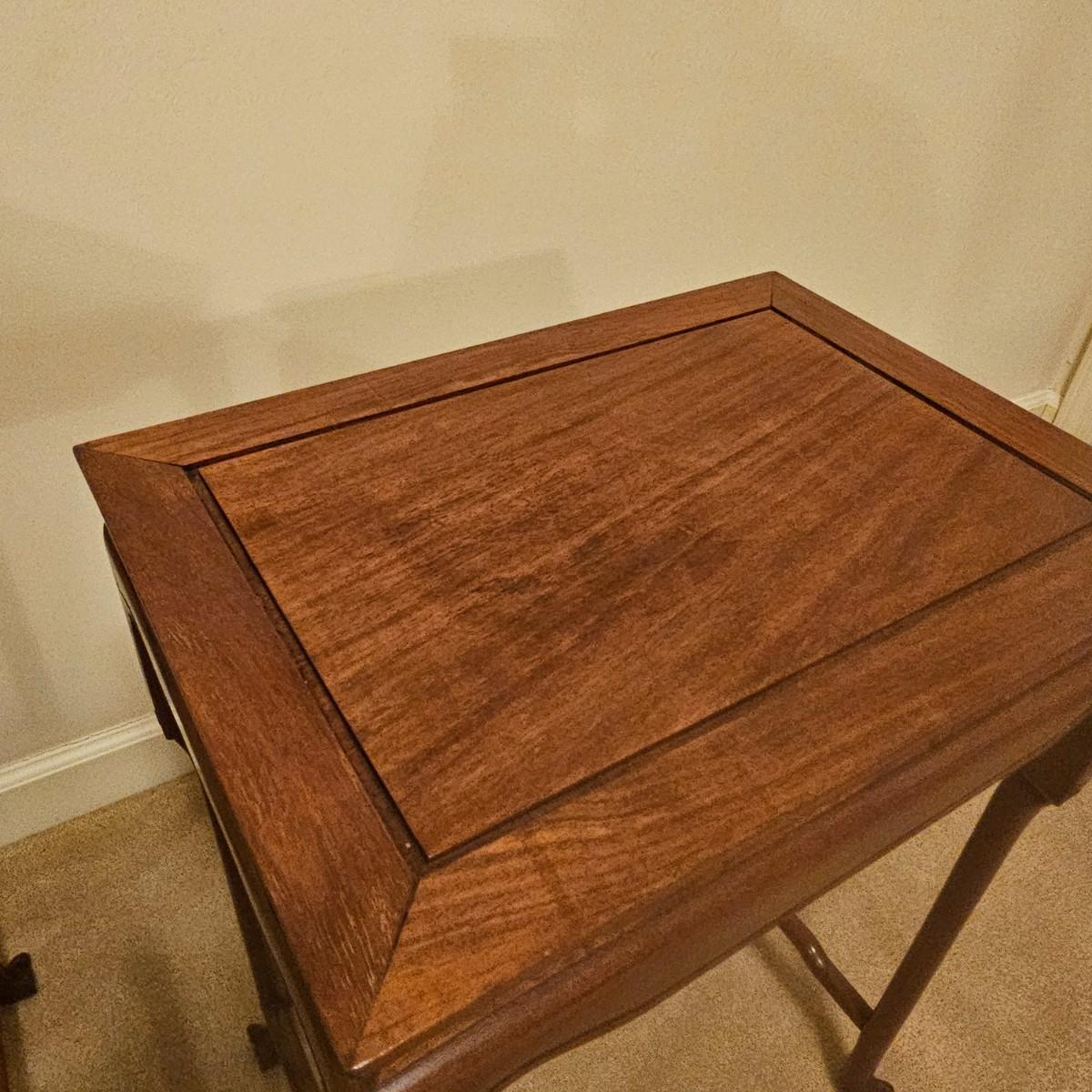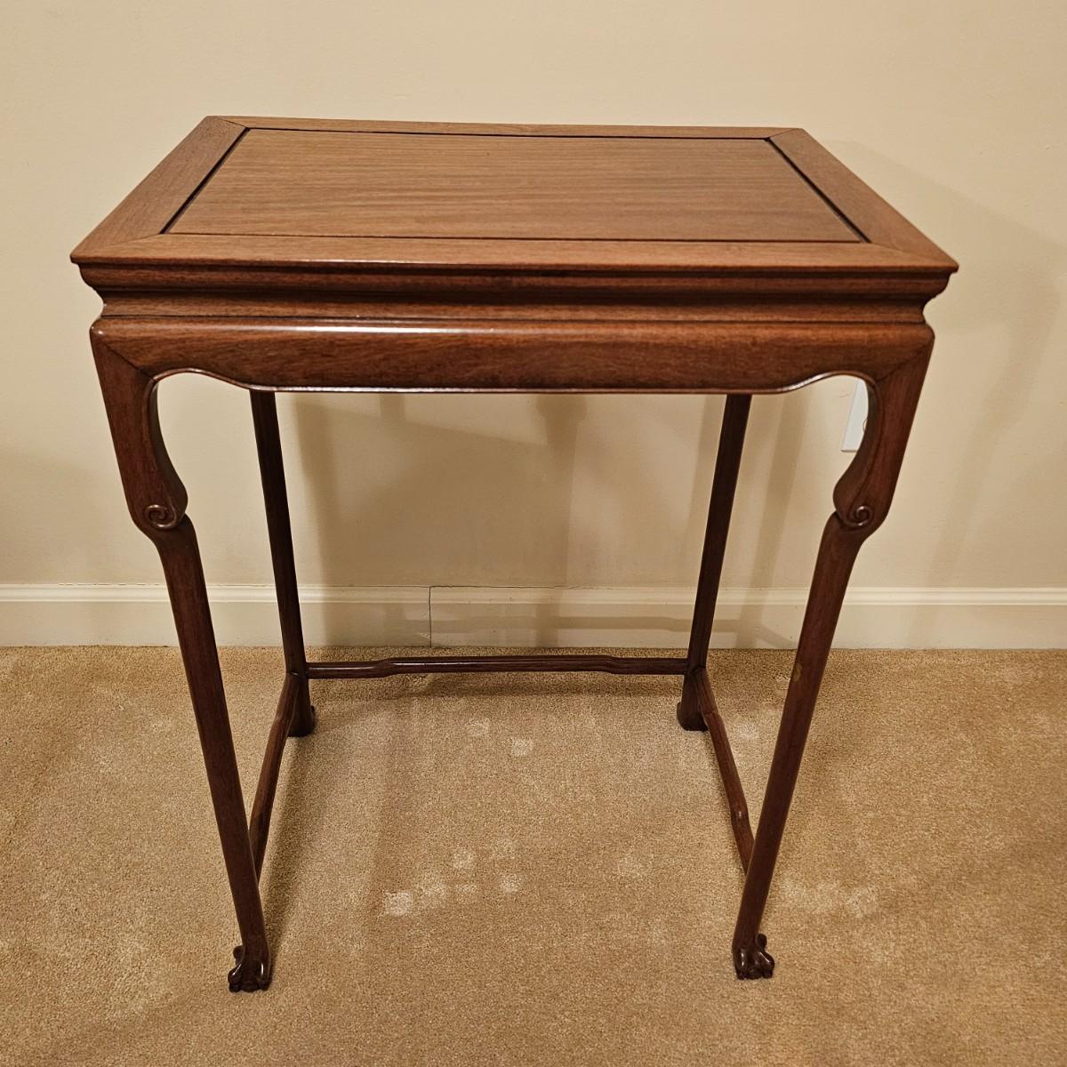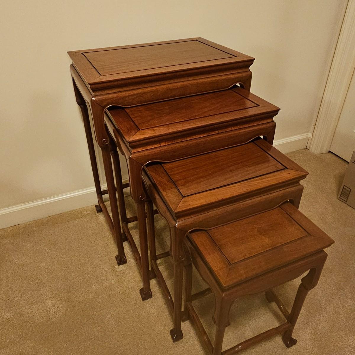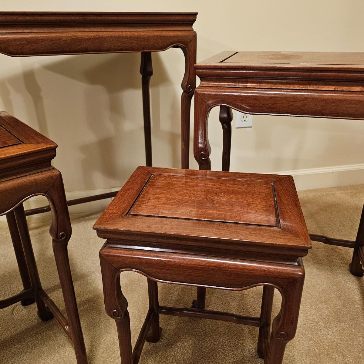 Beautiful set of nesting tables, may possibly be Chinese rosewood but no identifying msrkings. Carved tops, straight legs with light decoration and claw and ball or paw feet. Table size ranges from largest at 20"'x 14" x 27.5"H to smallest at 11" x 8.75" x 17"H. Soft gloss finish. See photos for details. Local pickup only.