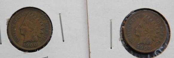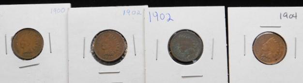Set of Four Indian Head US Mint One Cent Pieces 1900, 1902, 1902, 1904 Circulated G/VG