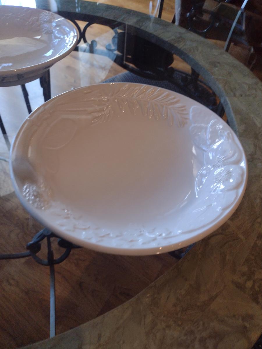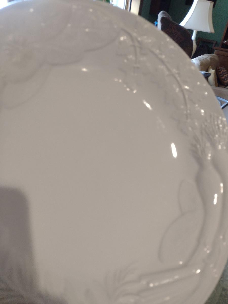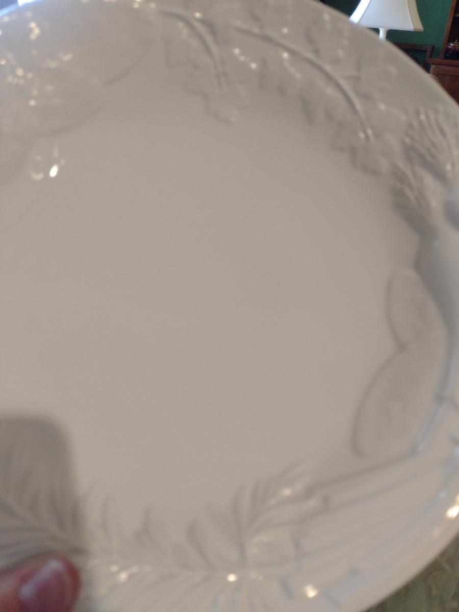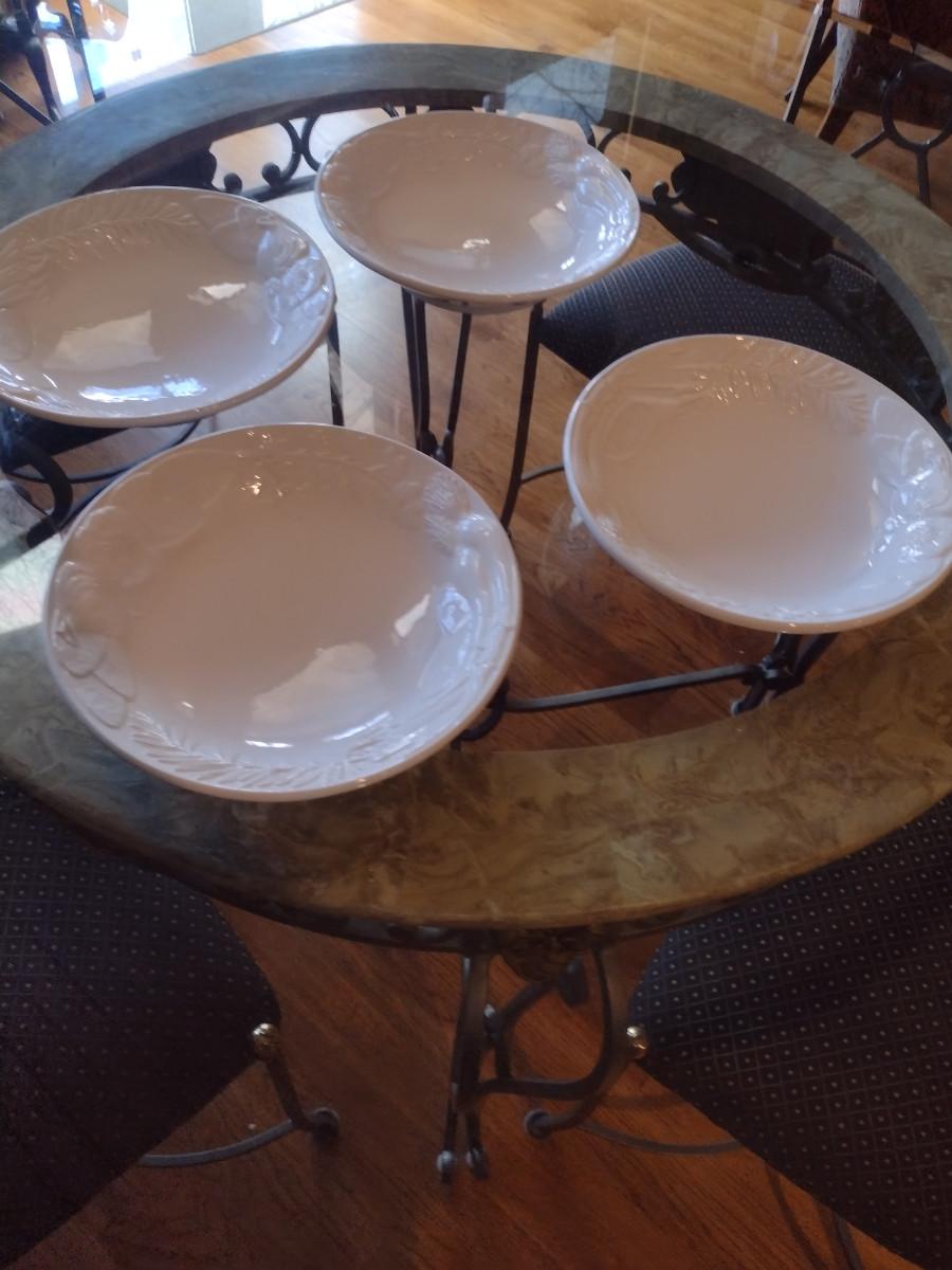Set of Four La Ceramica VBC Round White Serving Dishes- Embossed Vegetable Design. Approx 10 1/4" in diameter.