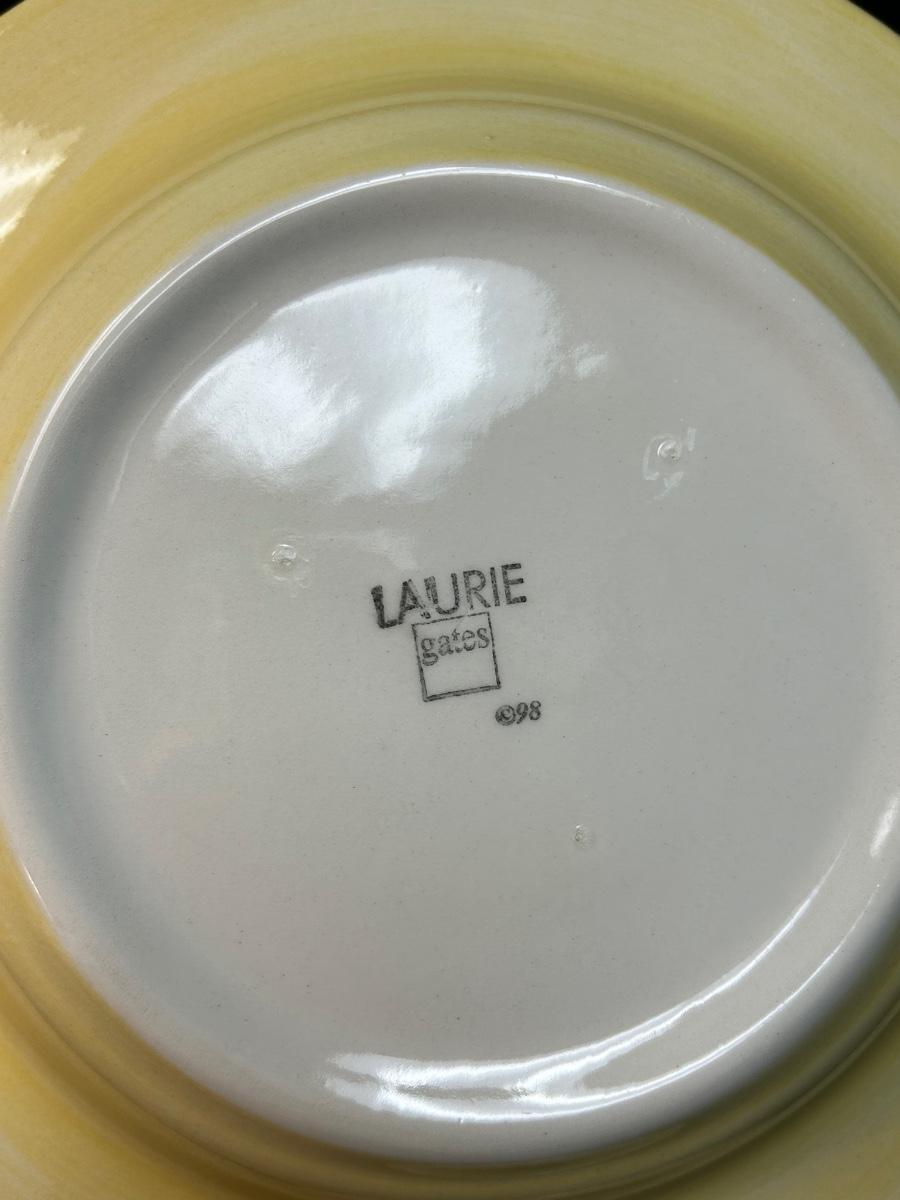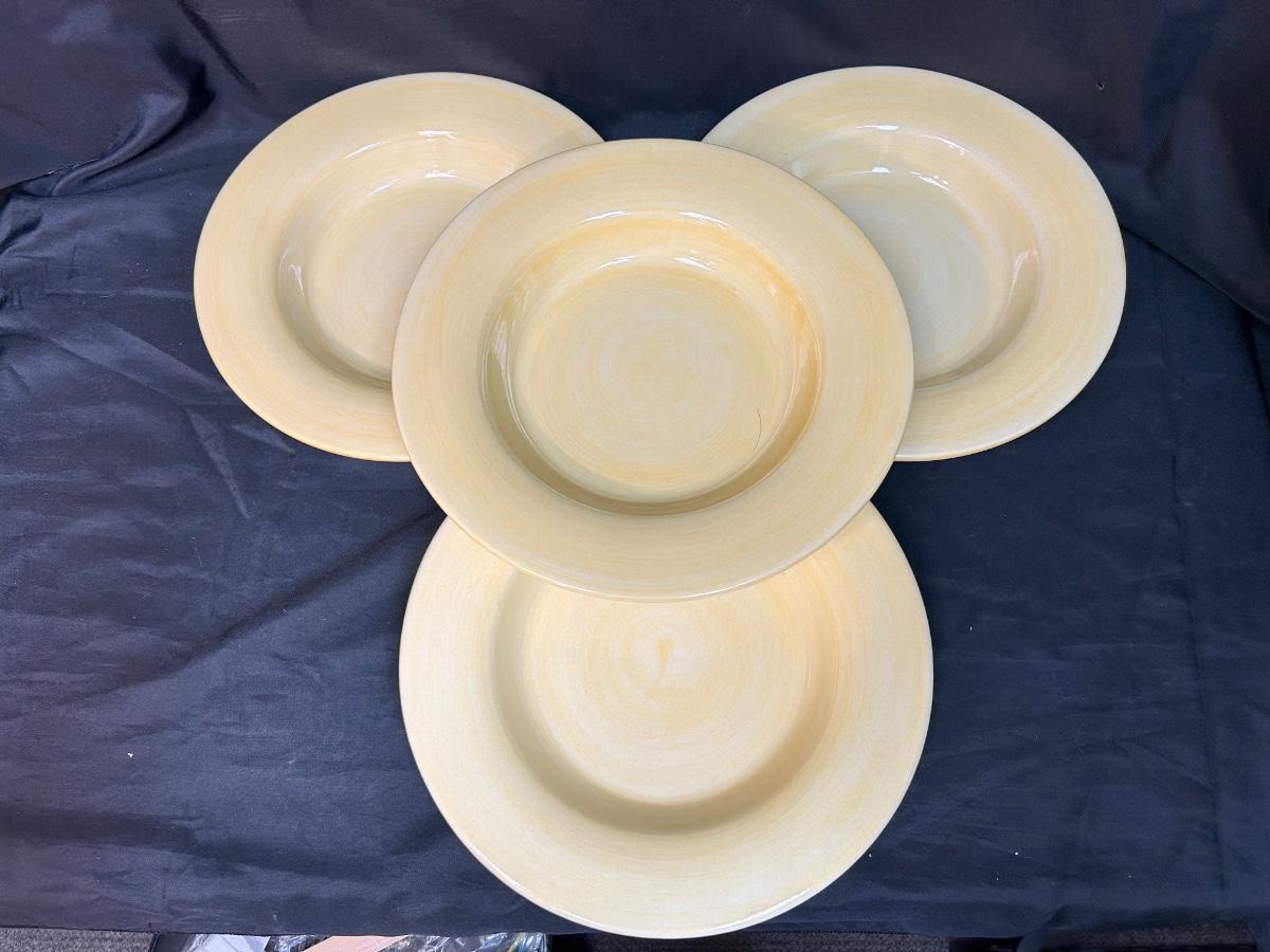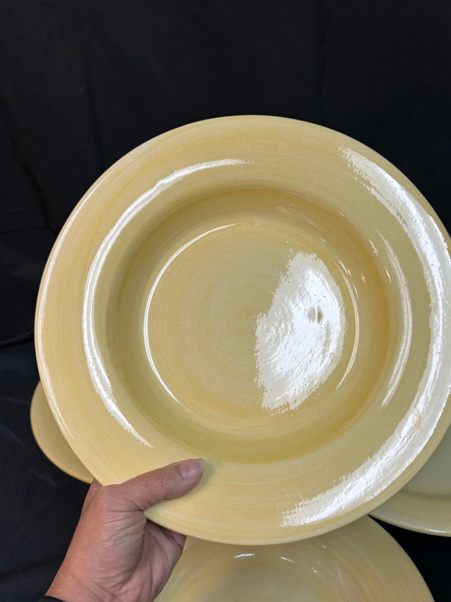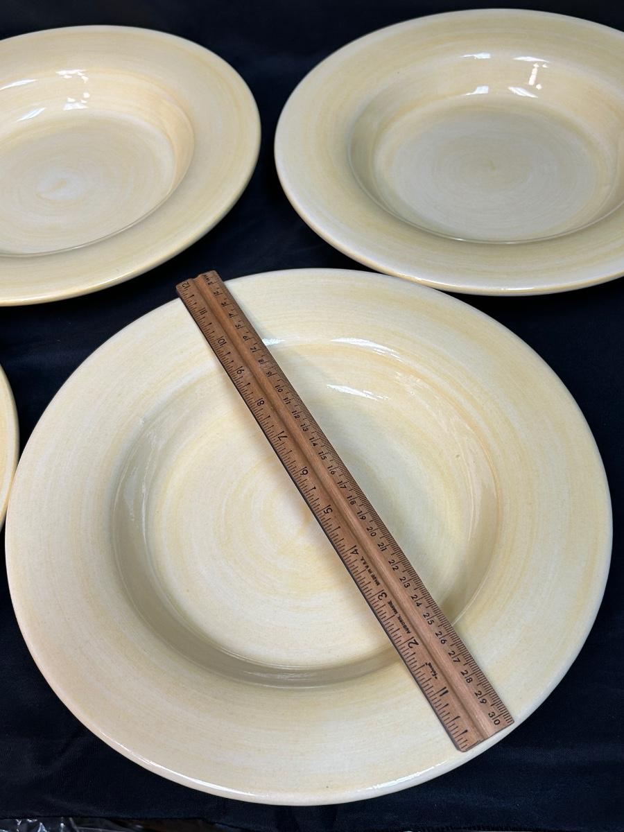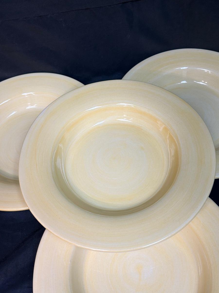 Set of Four Laurie Gates Wide Rime Soup Pasta Bowls Pale Yellow 1998. In good condition. About 12" diameter.
