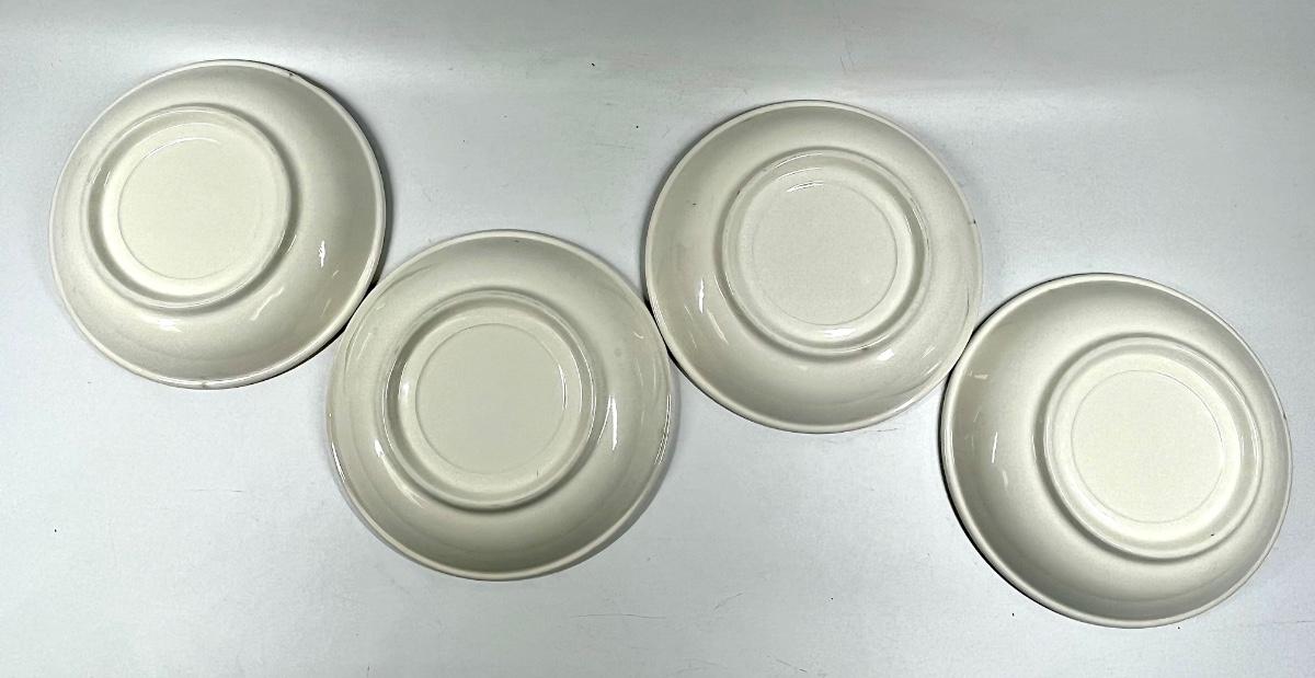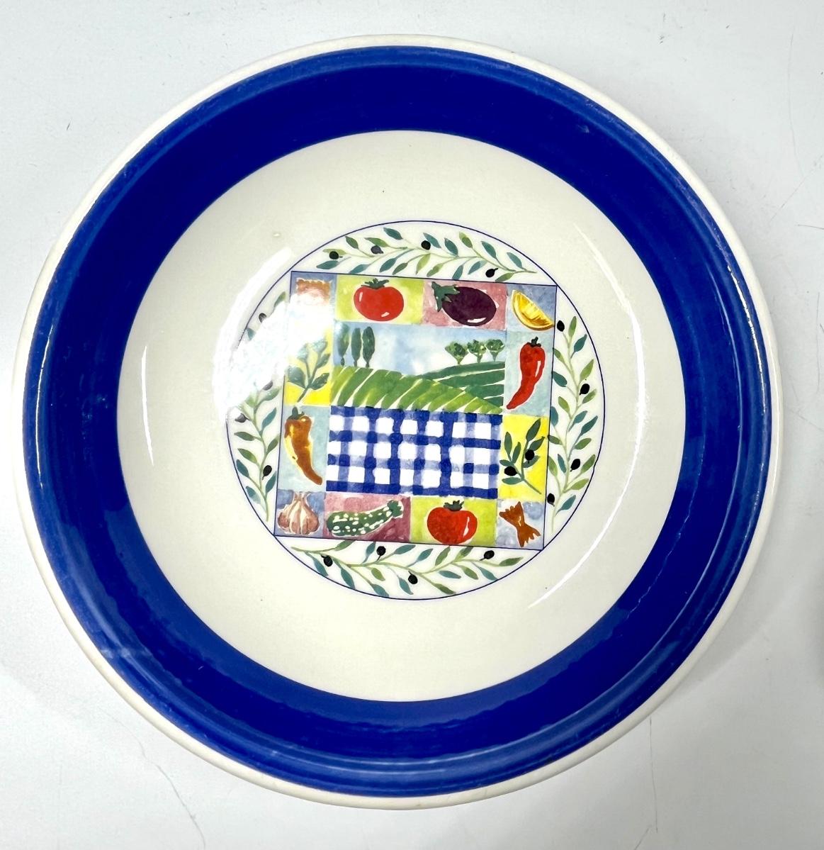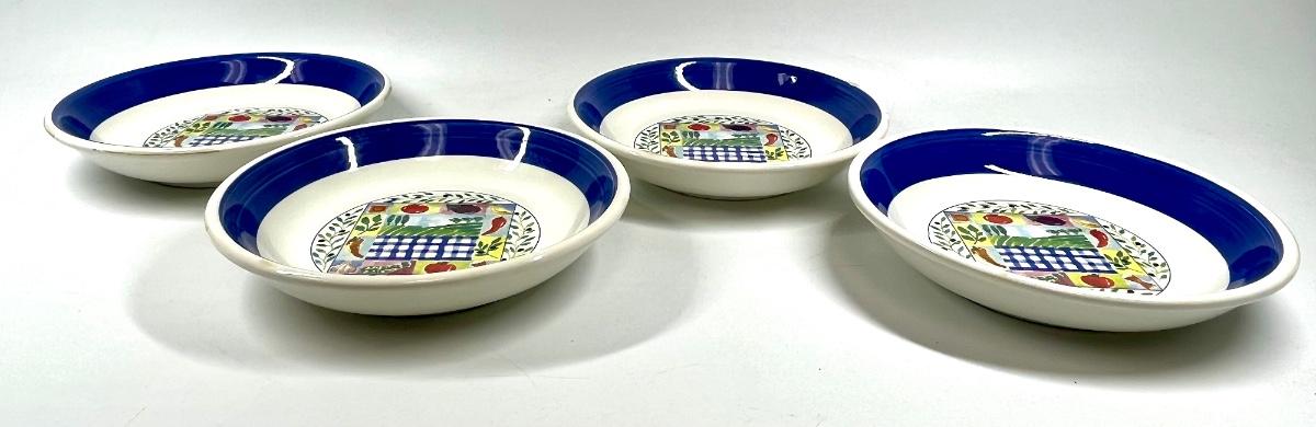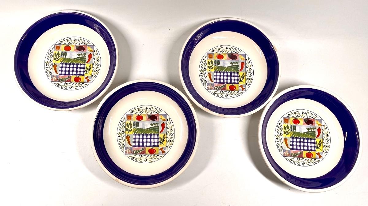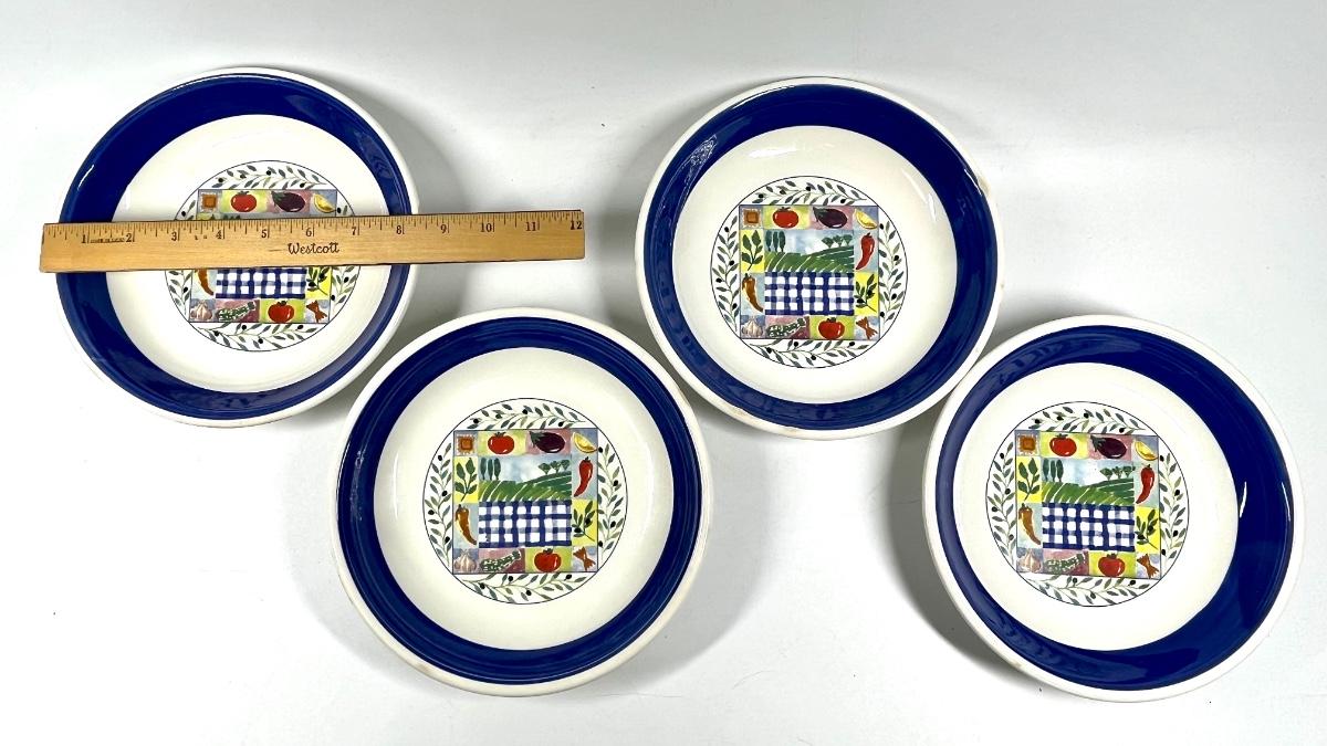 Set of four painted fruit and vegetable print navy blue rimmed 8” dinner plates