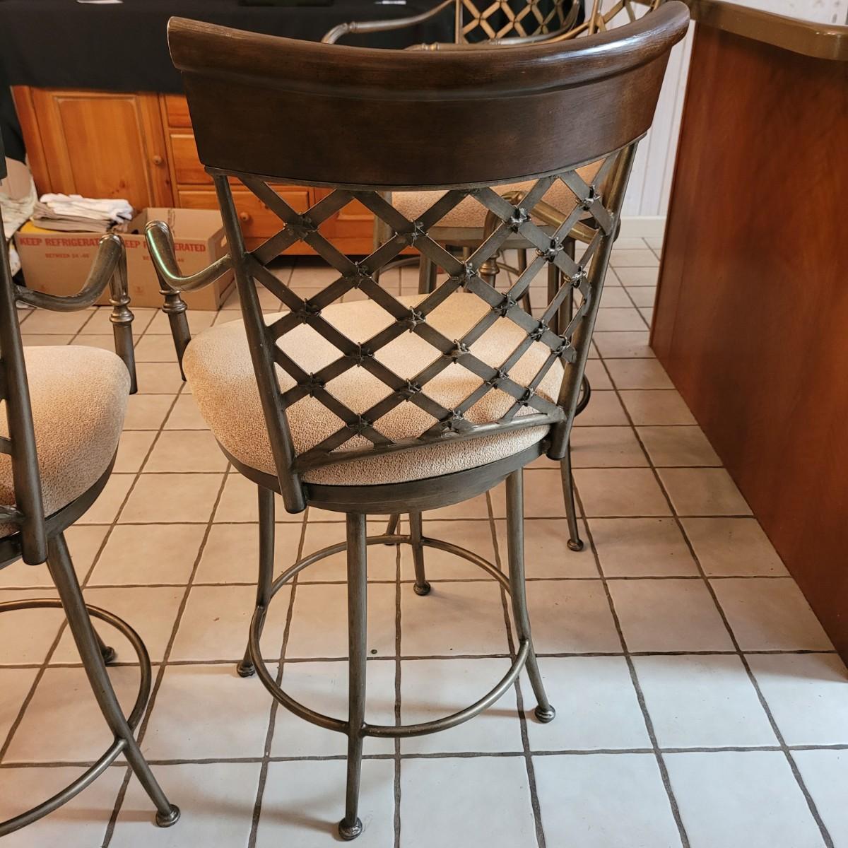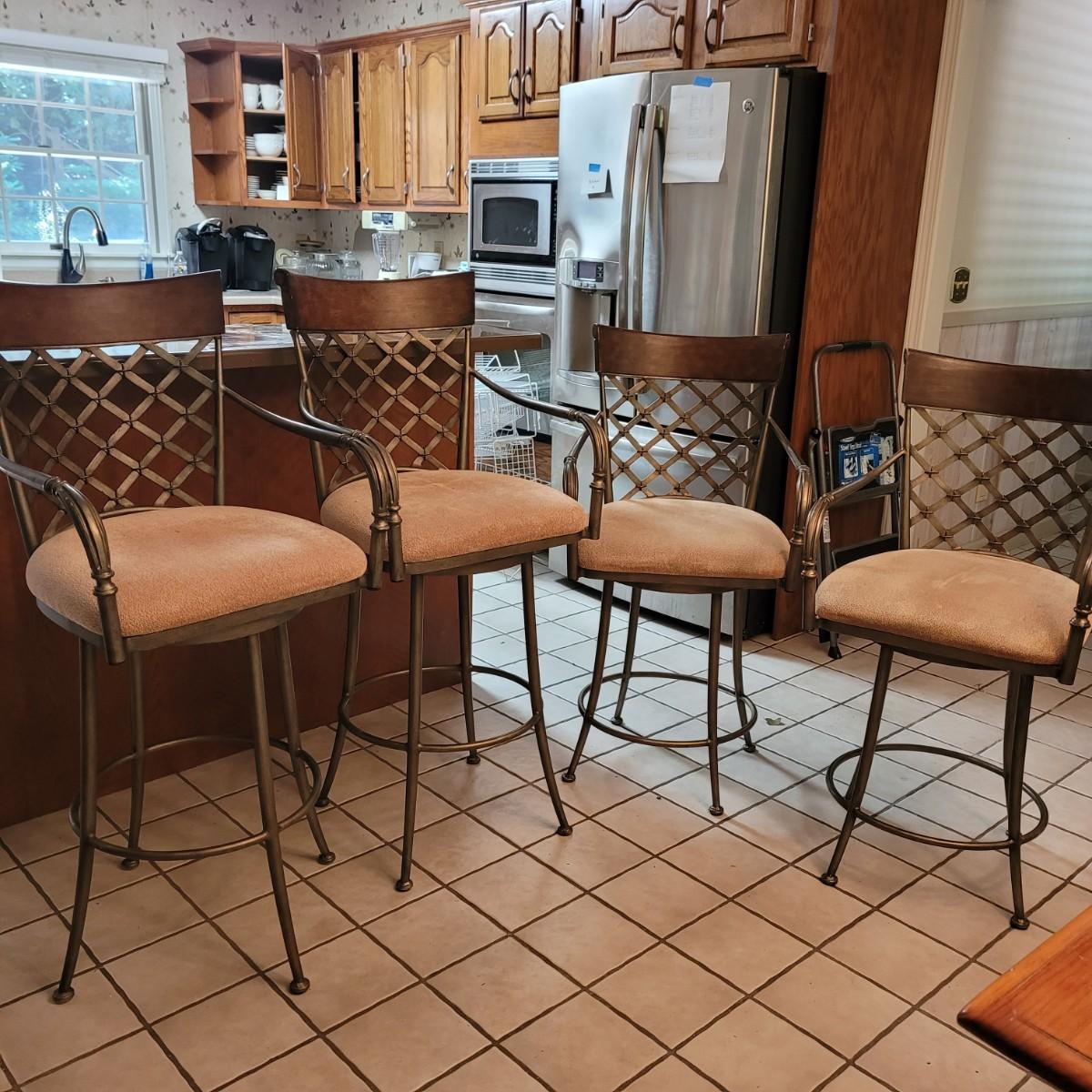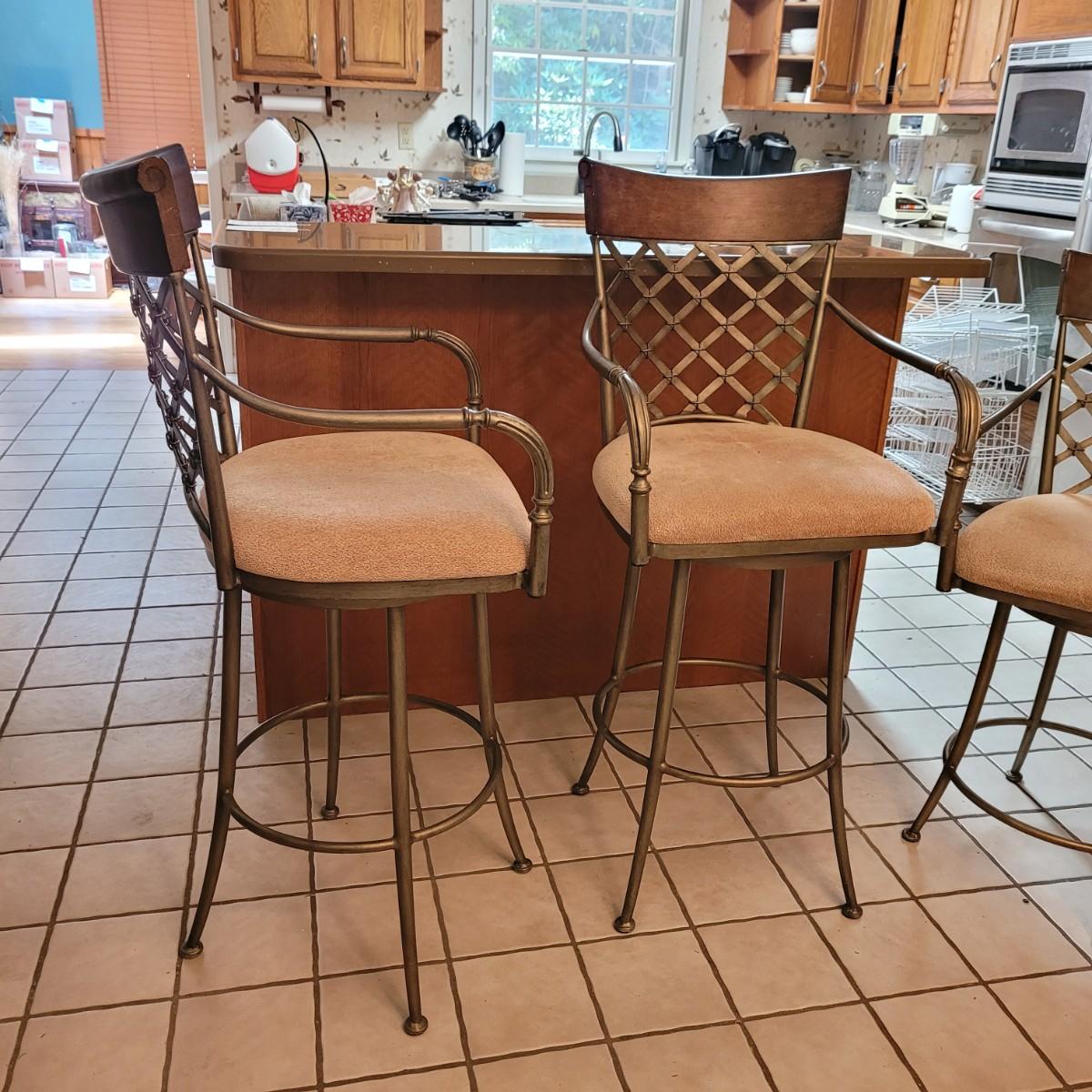 This set of four swivel bar stools includes two tall stools and two short stools. Sturdy metal construction, however one tall stool slightly wobbles. Upholstered seats show signs of wear (see photos). Tall stools measure approximately 22” x 17” x 47”H, with a seat height of 30”, and short stools 22” x 17” x 42”H, with a seat height 24.” Local pick up only.