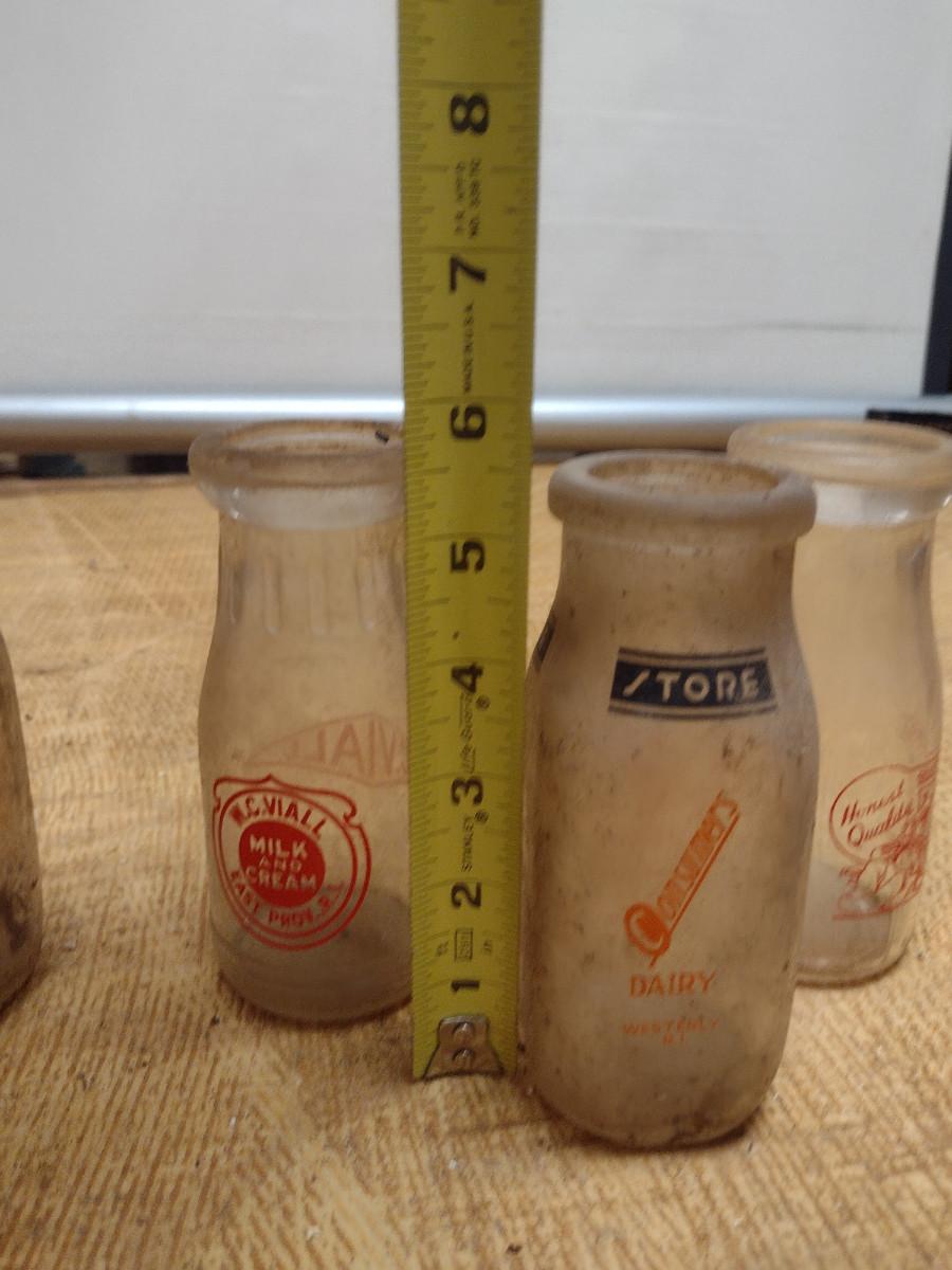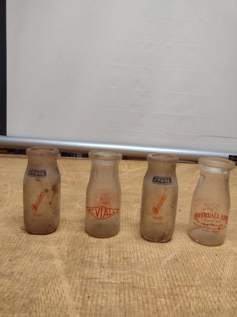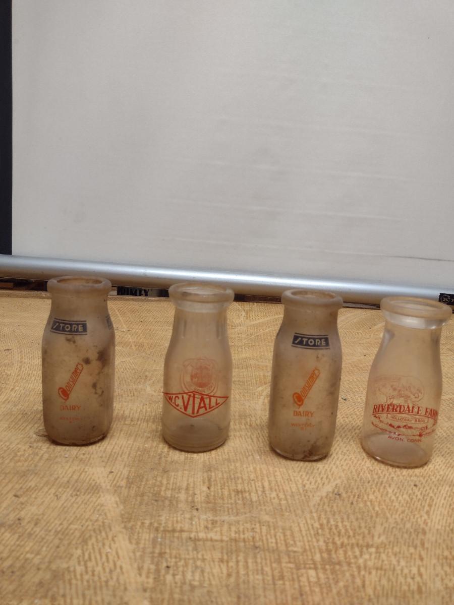 Set of Four Vintage Half Pint Size Painted Milk Bottles (#10). Stored in non-climatized basement so expect item may need to be cleaned from dust, insects, etc. Shipped in as is condition