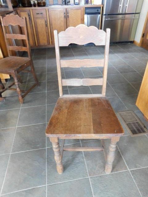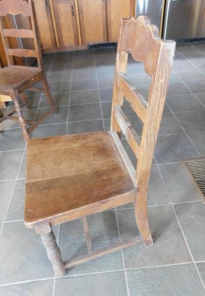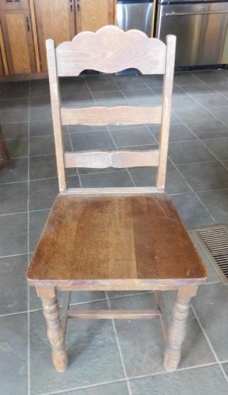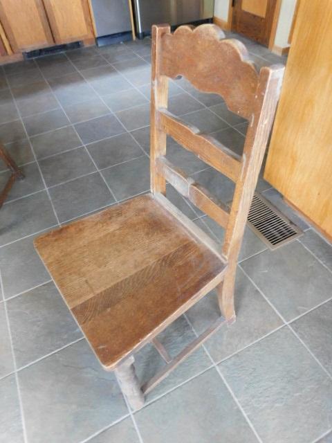 Set of Four Vintage Solid Oak Farm Chairs in equal condition. Expect some wear and scratches. Every chair is solid and sit evenly.