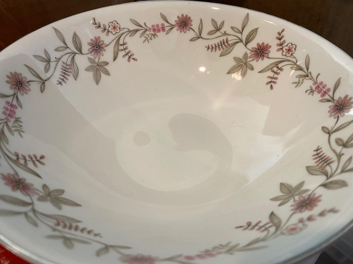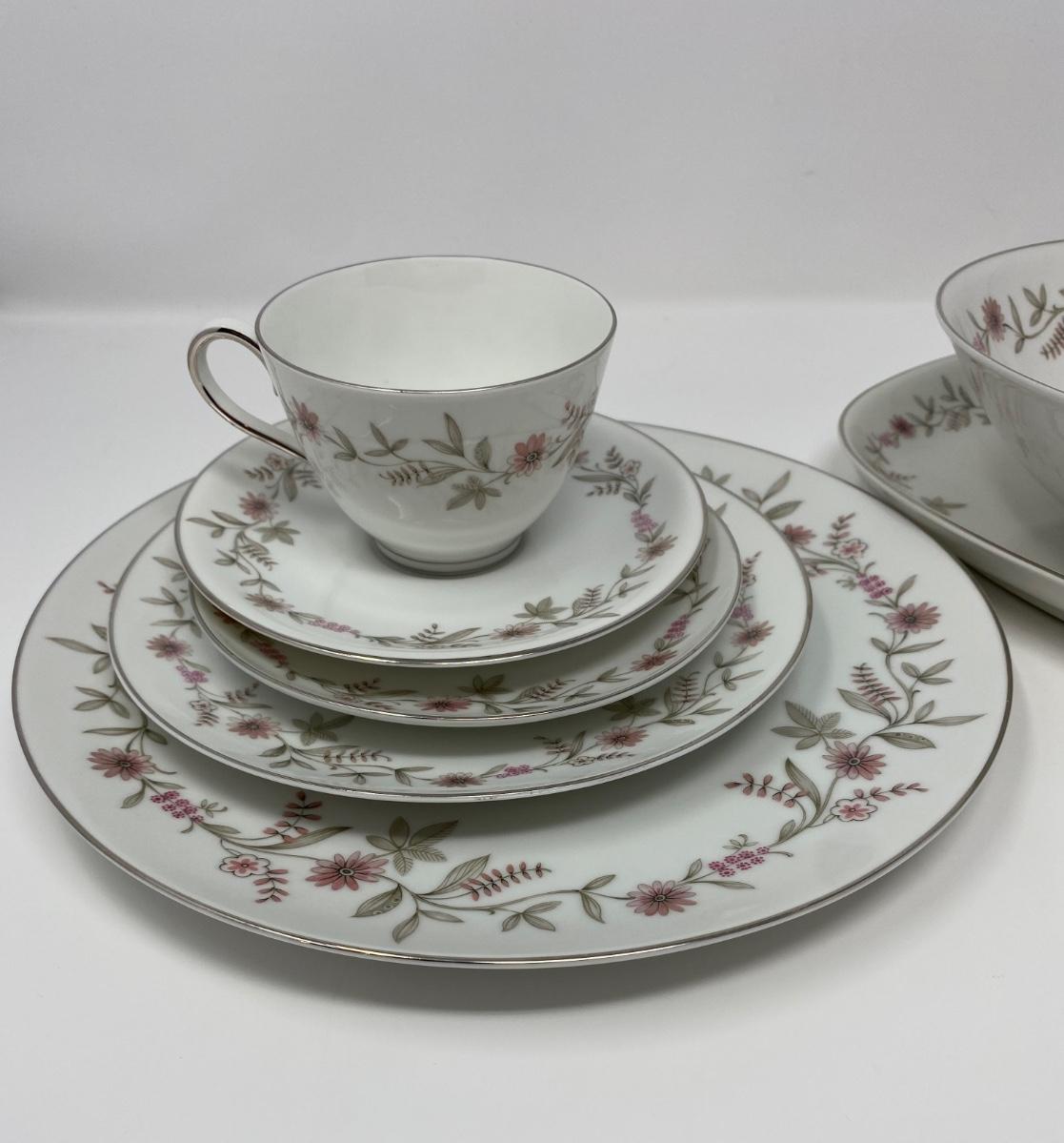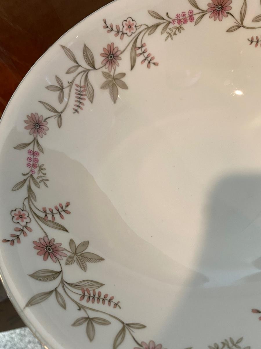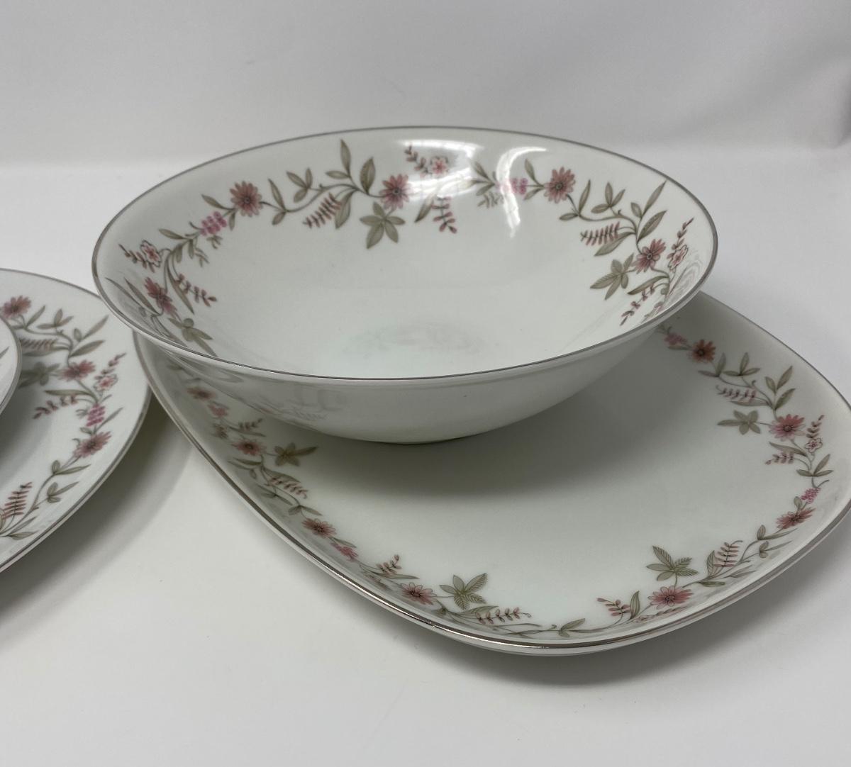 55 Piece Set of Franconia Krautheim Selb Bavaria Germany in Fascination Pattern Including One 13.75in Serving Dish, One 9in Bowl, Eight 10.5in Dinner Plates, Eleven 7.5in Salad Plates, Twelve 6in Bread Plates, Twelve 6in Teacup Saucers, and Ten 2.5in Teacups. There is a Small Chip on the Serving Platter Rim