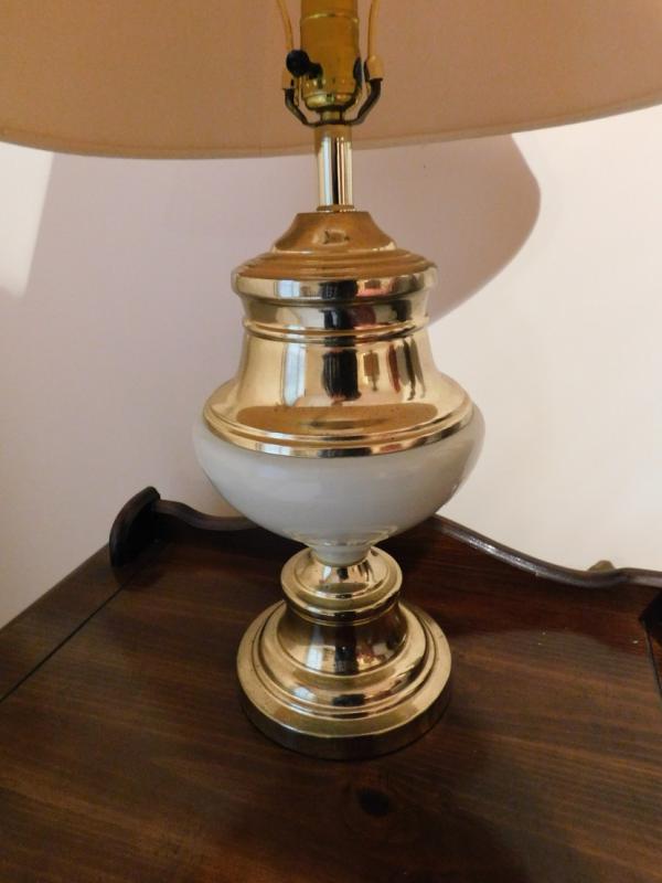 Set of Glass Globe and Brass Post Lamps with Shades in working condition.