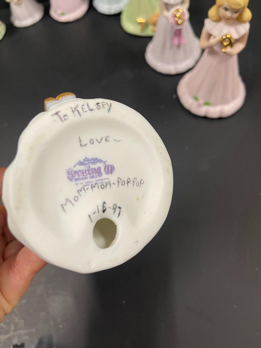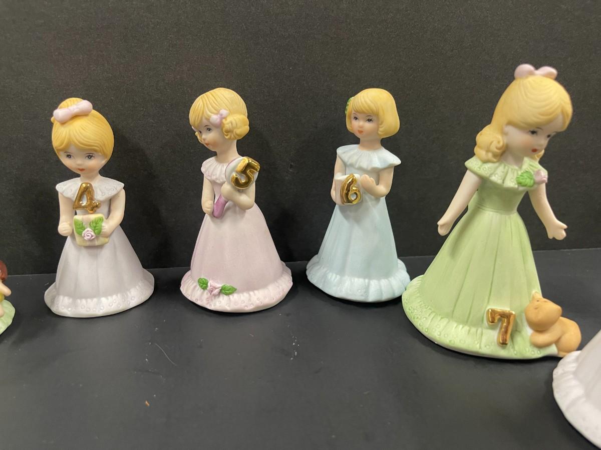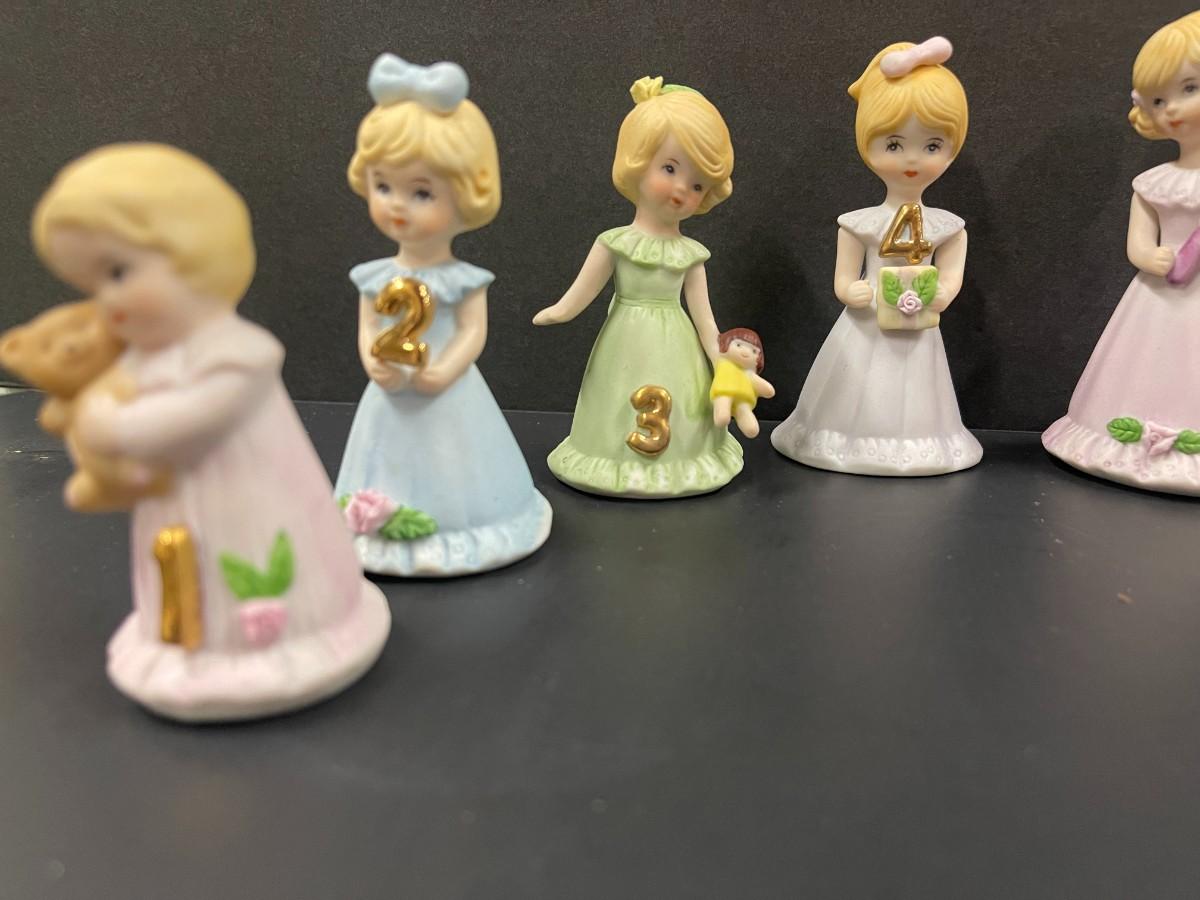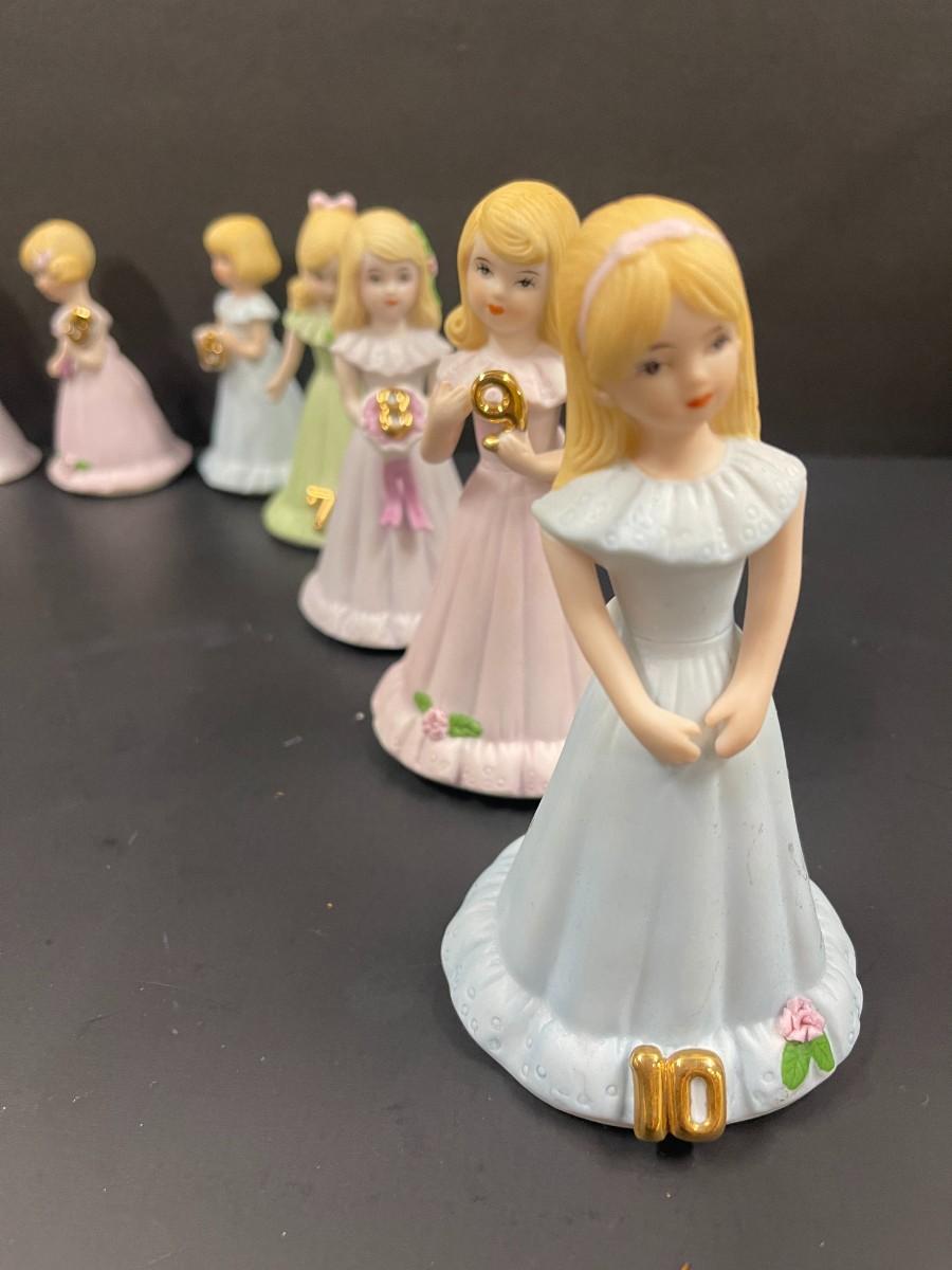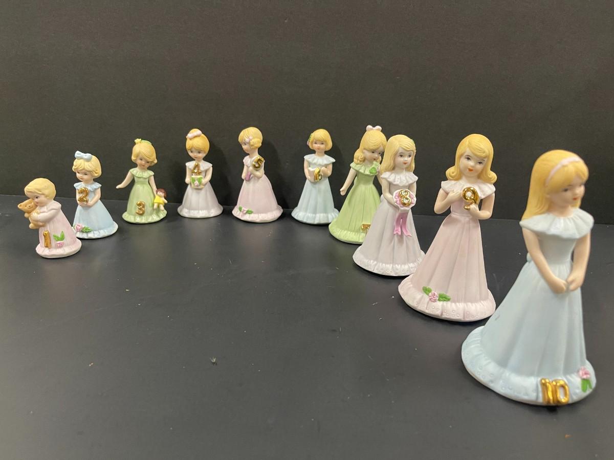 Set of Growing up Birthday Girls porcelain figurines, ages 1-10. All in very good condition, but a previous owner did write names on the bottoms of each of the pieces.