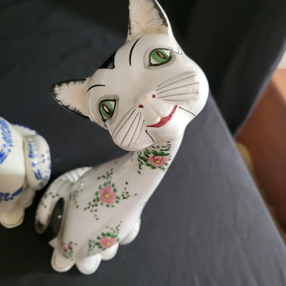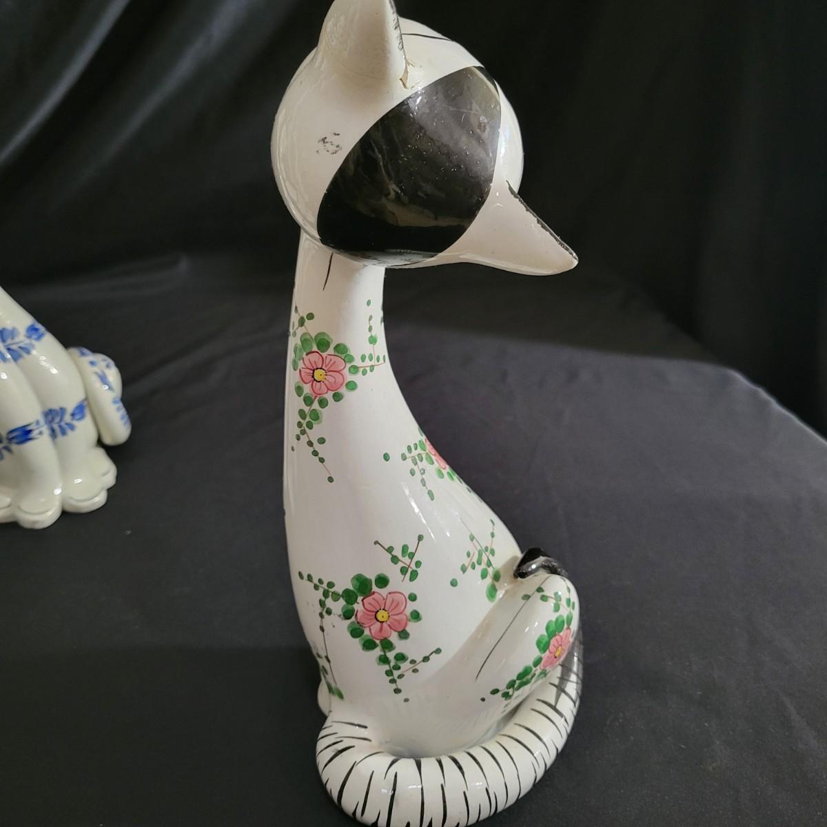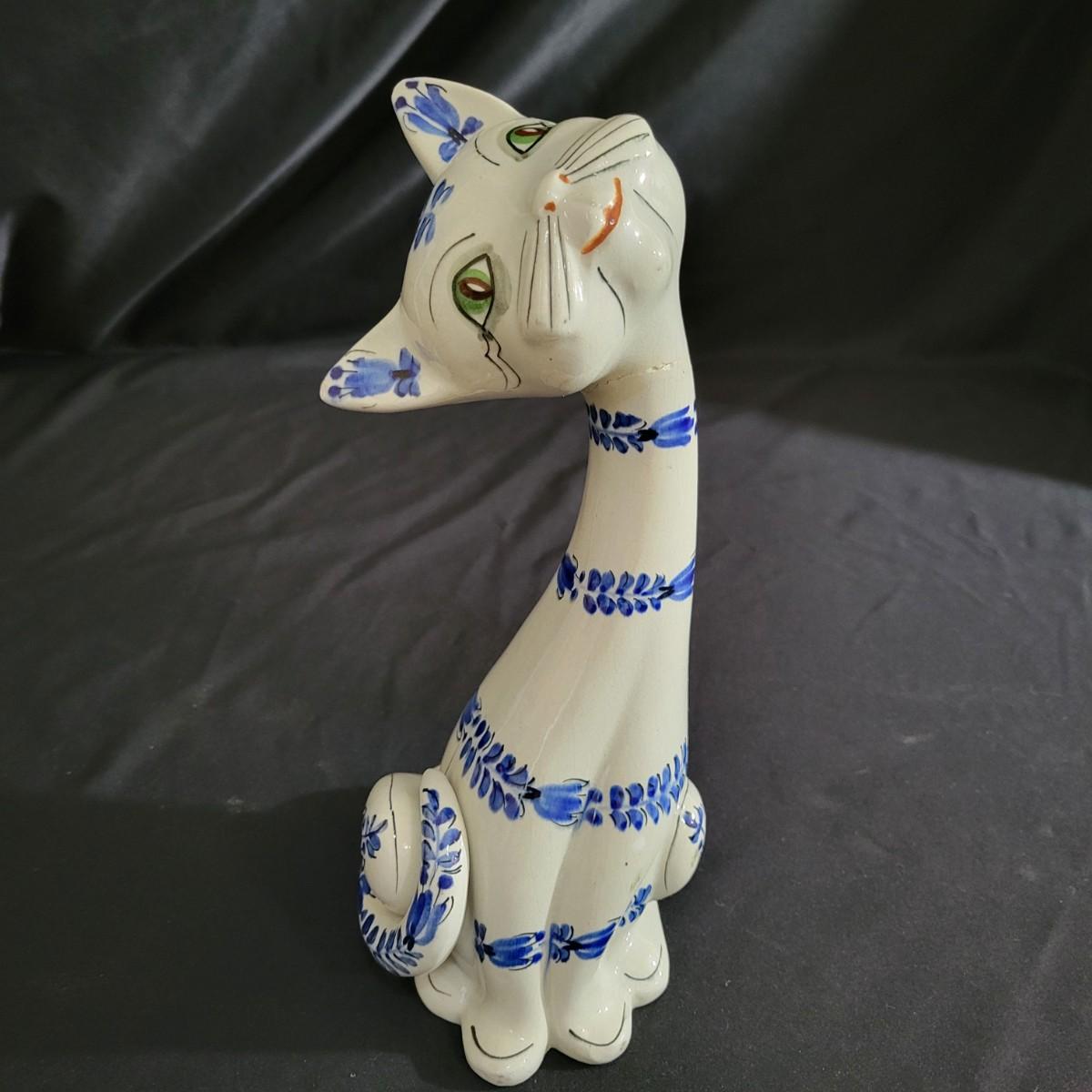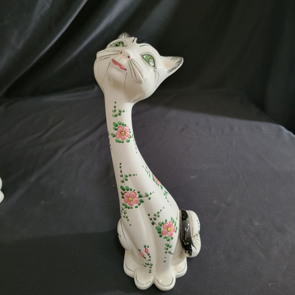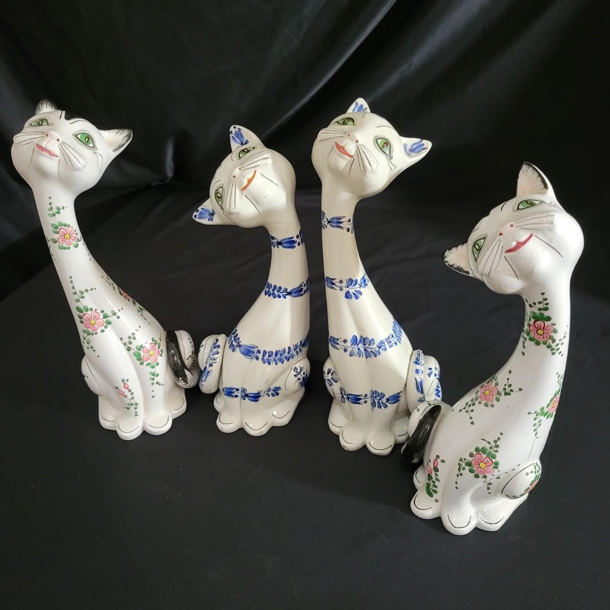 A set of four ceramic cats in good condition. One cat has a large crack on its neck and one has a chip. These cats feature hand painted details and are labeled as being made in Italy. Cats measure approximately 4" x 5" x 11". Shipping available. Shipping can be costly. We suggest calling our local UPS with dimensions and getting an estimate. 828-252-6930