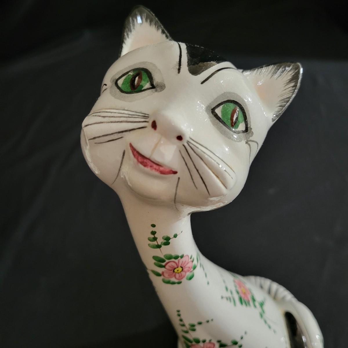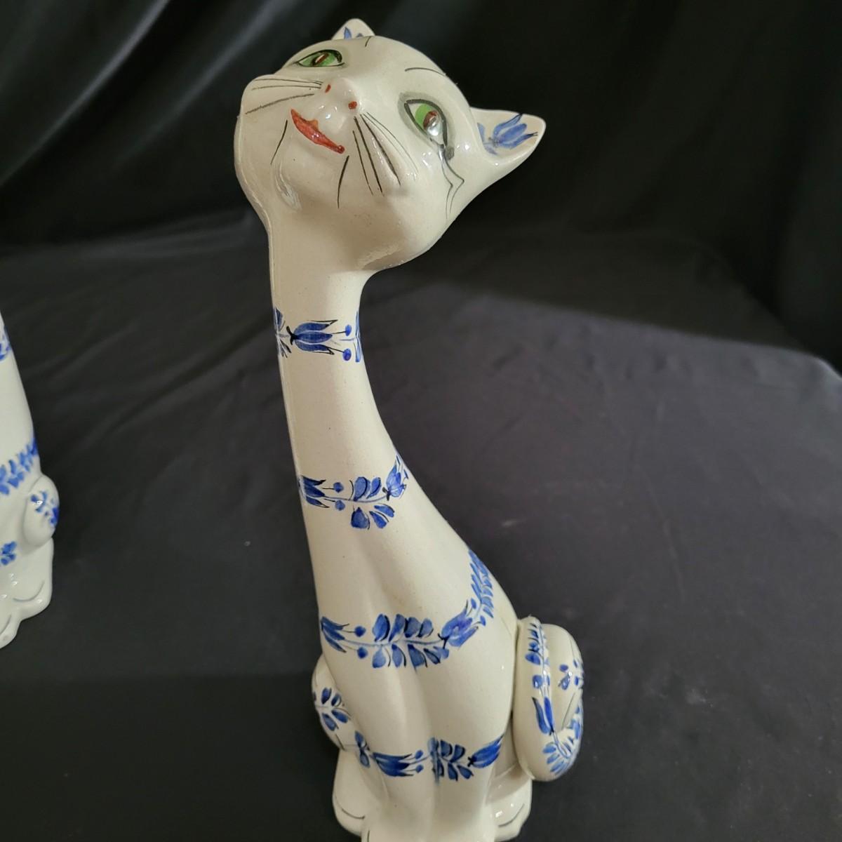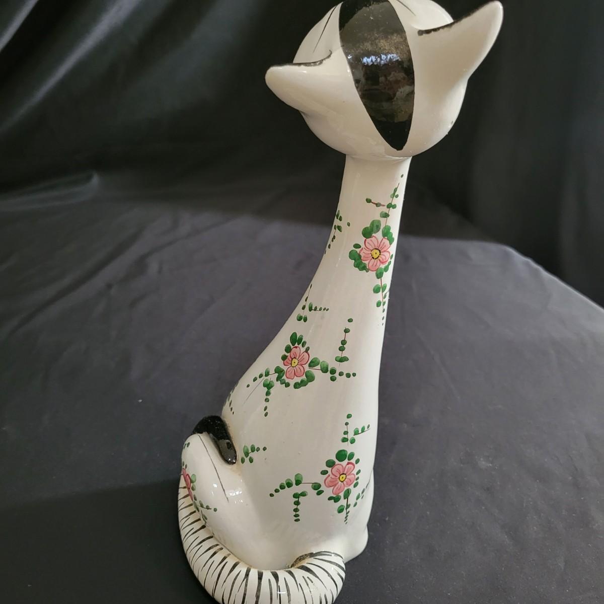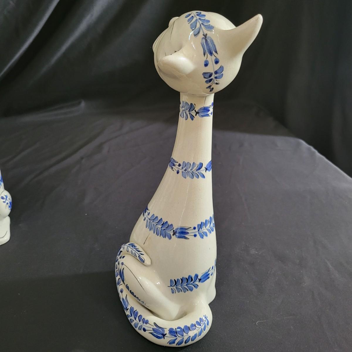 A set of four ceramic cats in good condition. One cat has a large crack on its neck and one has a chip. These cats feature hand painted details and are labeled as being made in Italy. Cats measure approximately 4" x 5" x 11". Shipping available. Shipping can be costly. We suggest calling our local UPS with dimensions and getting an estimate. 828-252-6930