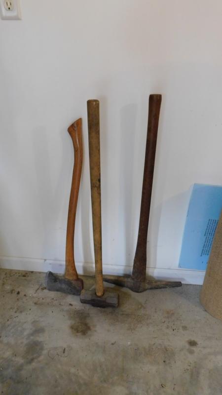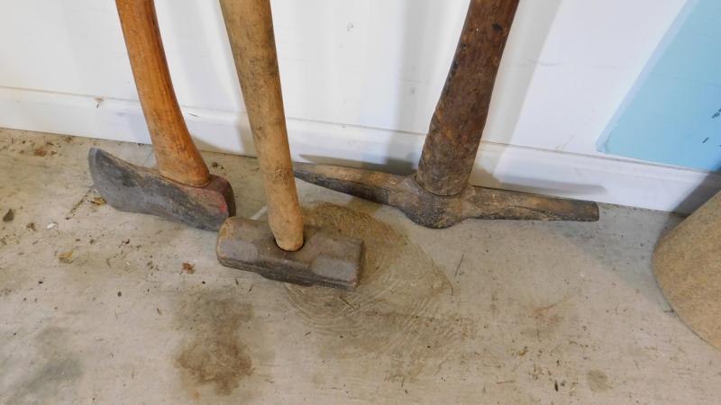Set of Heavy Head Tools Including Sledge Hammer, Pick, and Ax