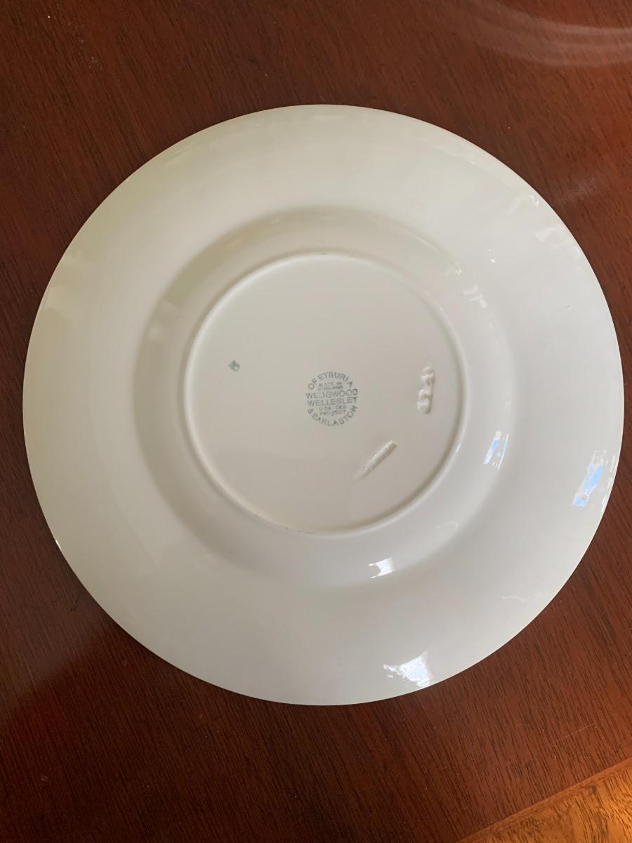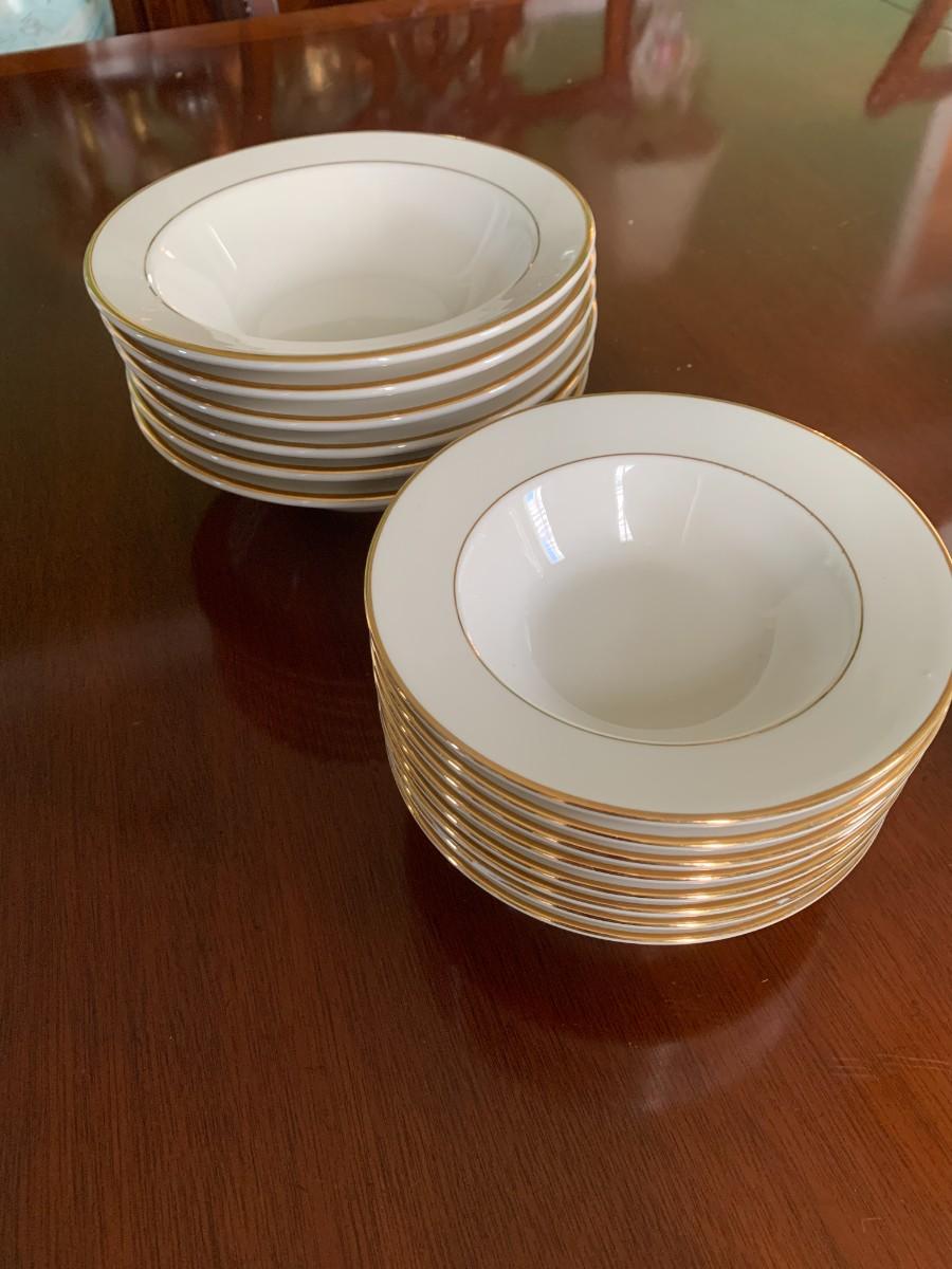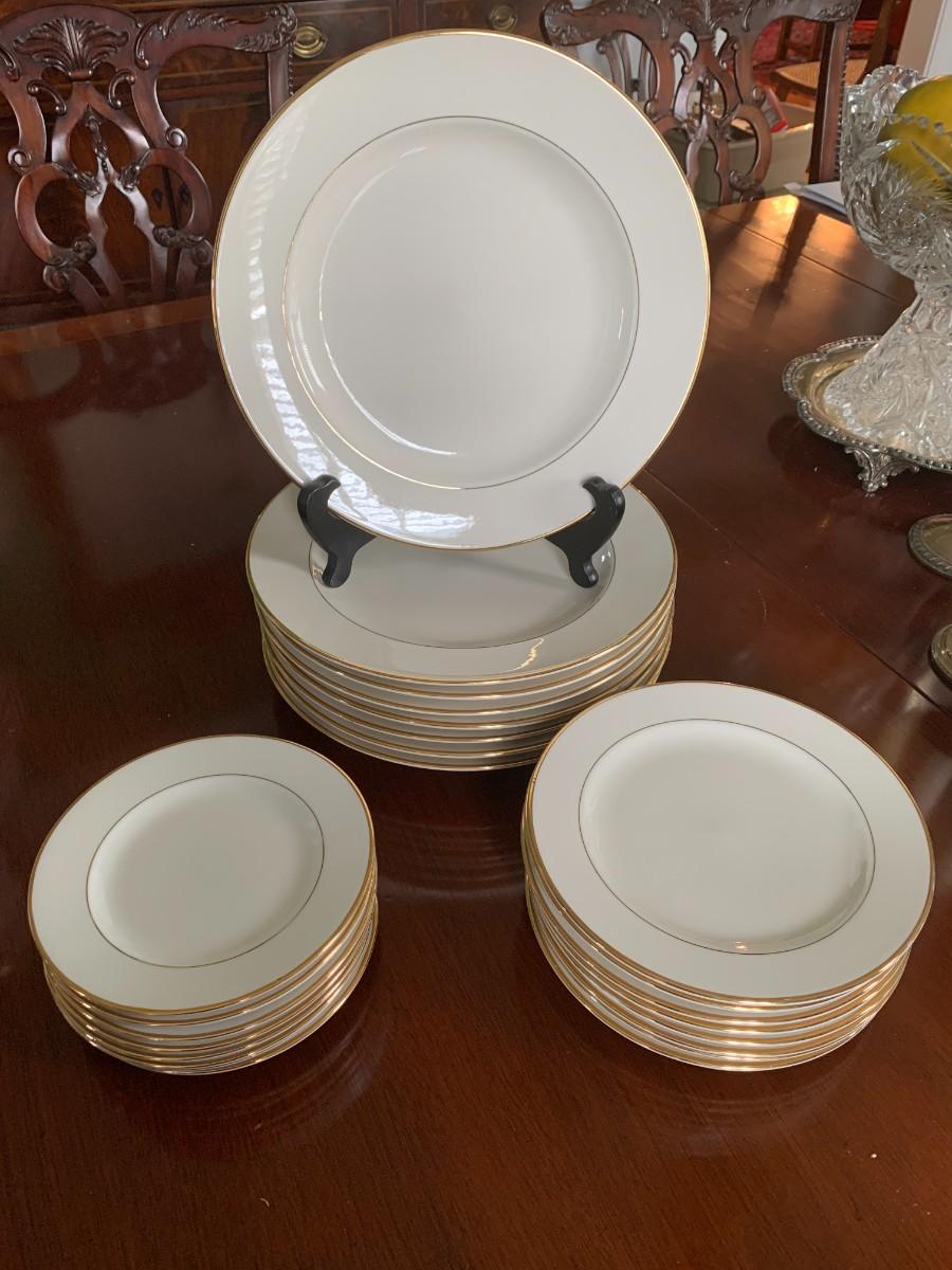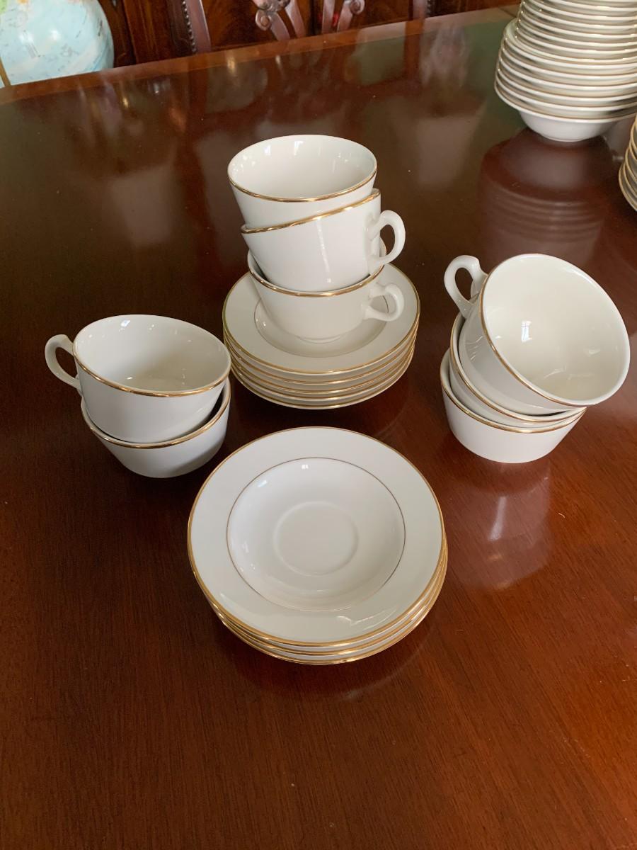 Ivory with gold rim. Durable and heavy, this set is made to last. Great for holiday entertaining. Good condition, one dinner plate has a fading on the inner gold band another has a hairline crack. All china is usable as is. Set includes: 8 dinner plates, 8 salad plates, 8 bread & butter plates, 6 rimmed cereal/soup bowls, 8 rimmed fruit bowls, 8 cups & saucers
