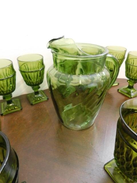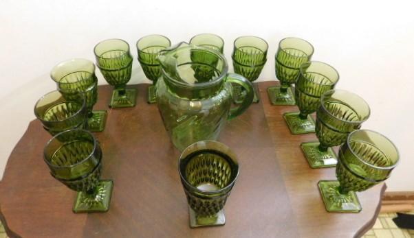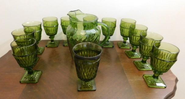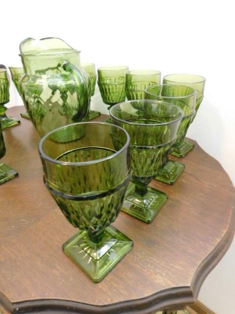 Set of Indiana Vintage Footed Drinking Glasses with Green Pitcher