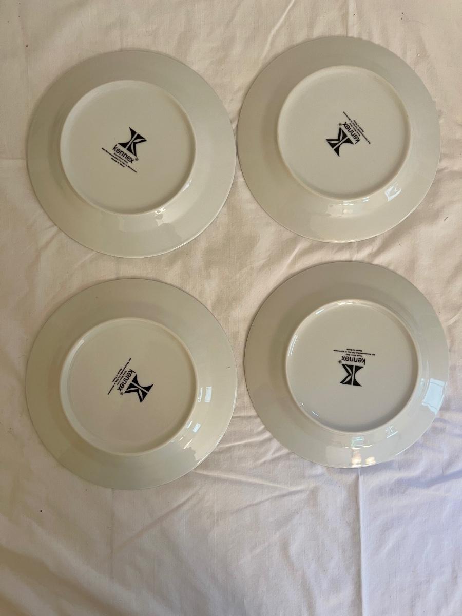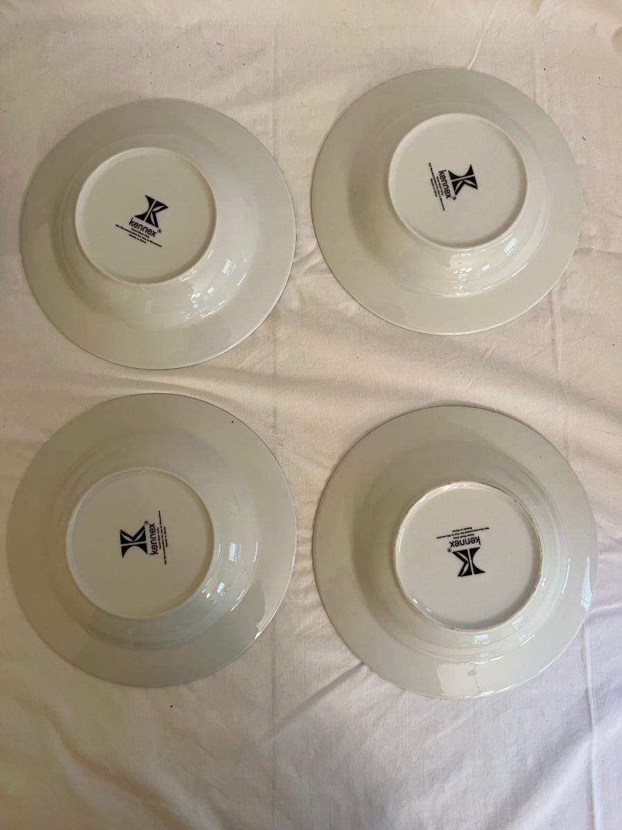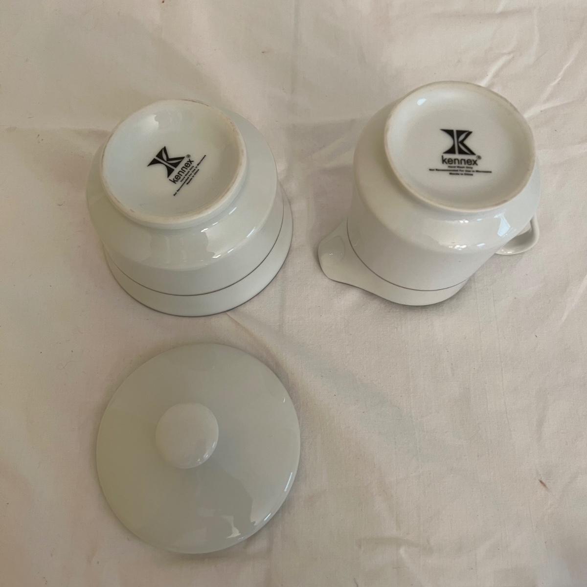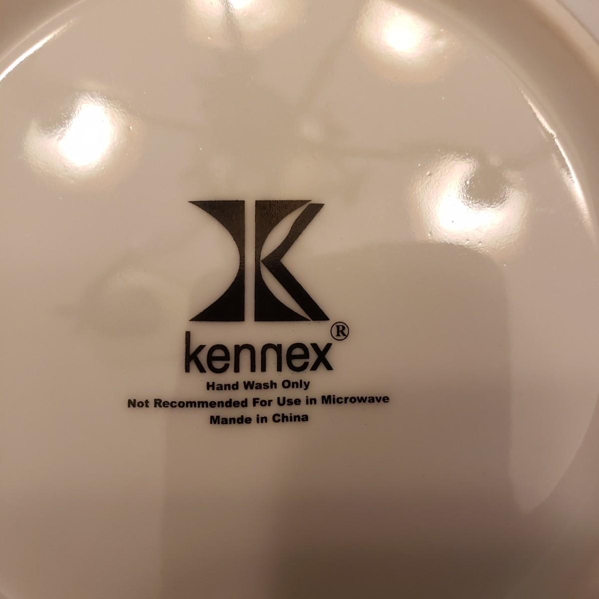 A complete place setting for eight Kennex dinnerware China set including a large serving bowl, which has some blemishes, see last two pictures, a serving platter, coffee, cups, a cream pitcher and sugar bowl. Eight of each: dinner plates 10.5”D, salad plates 7.5”D, soup bowls 8.5”D, coffee cups 3.5”D x2.25”H and saucers 6.125”D. Set also includes serving bowl 9”D x 2.5” and serving platter 12”D x 1”H as well as a cream pitcher 2.5”D x 3.75”H and covered sugar bowl 4”D x 2.75”H.