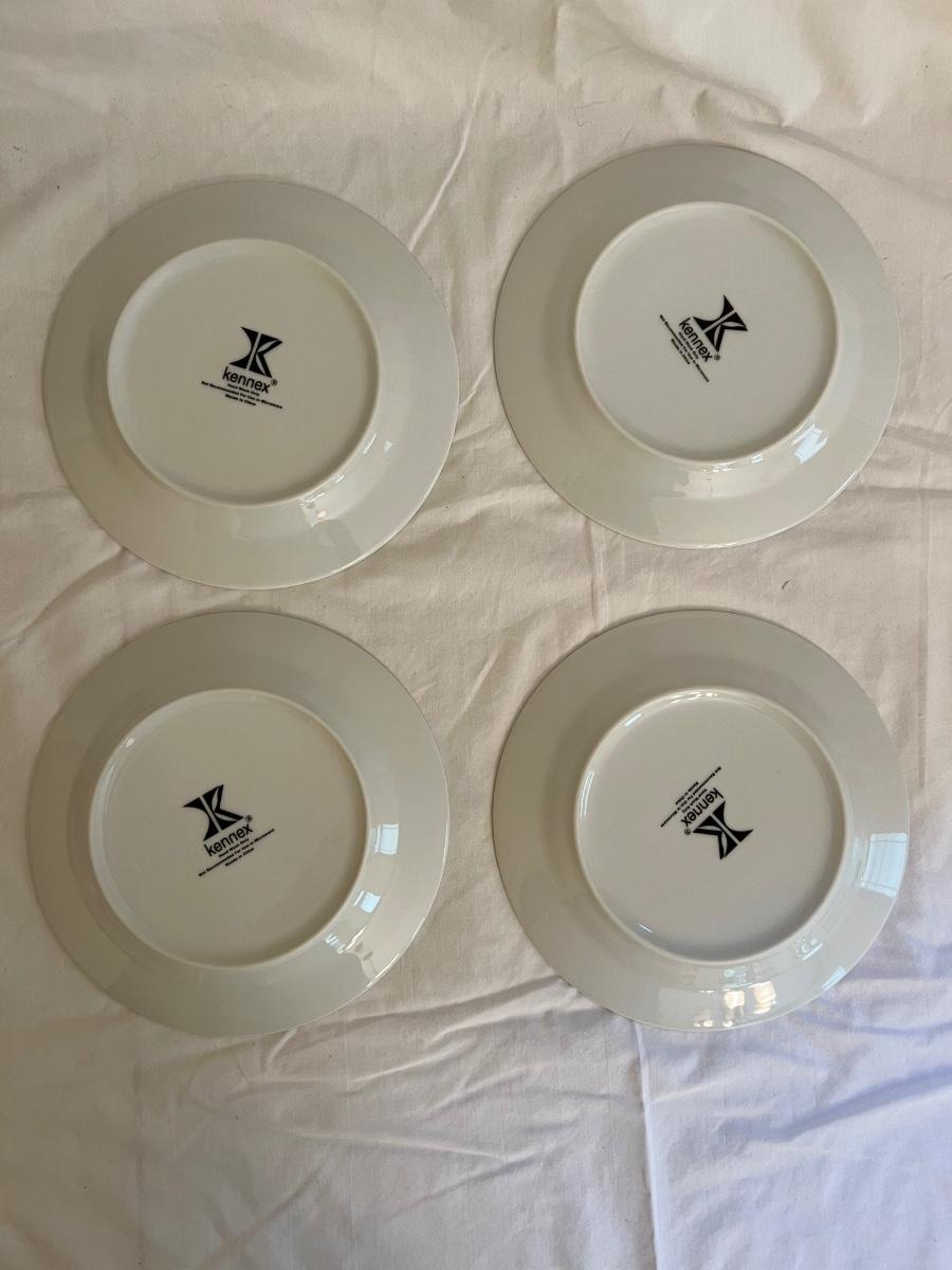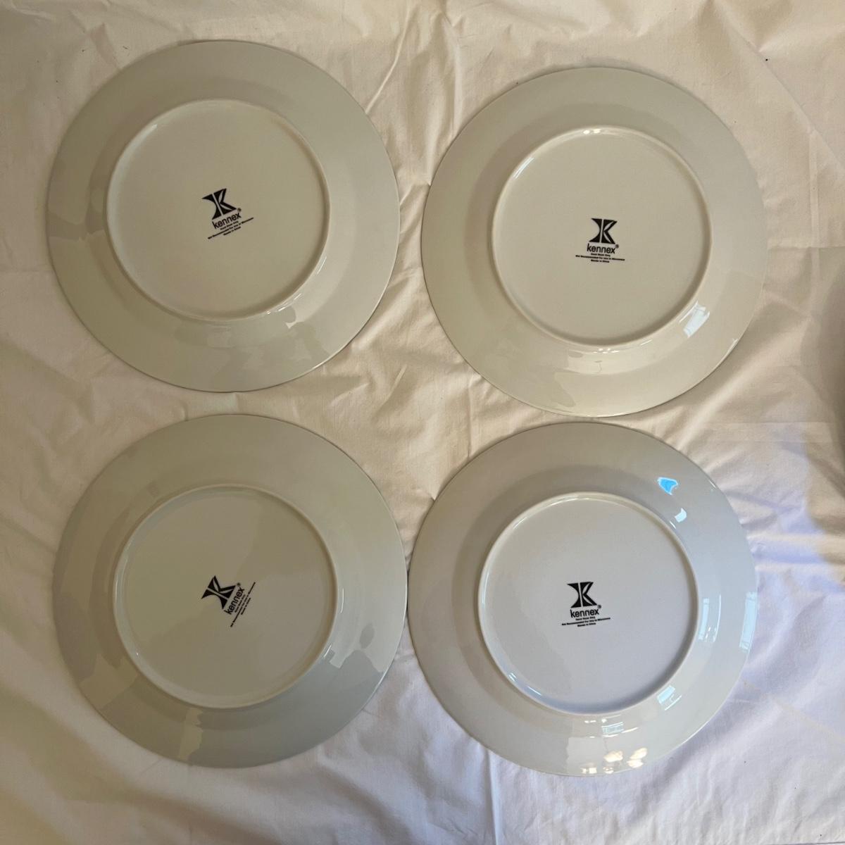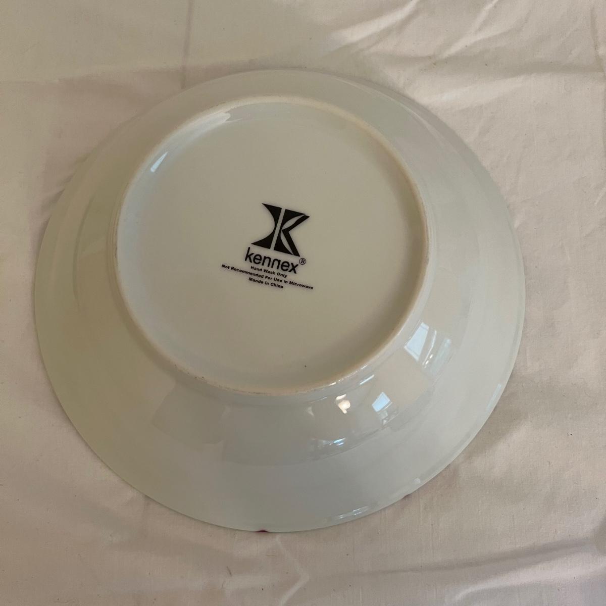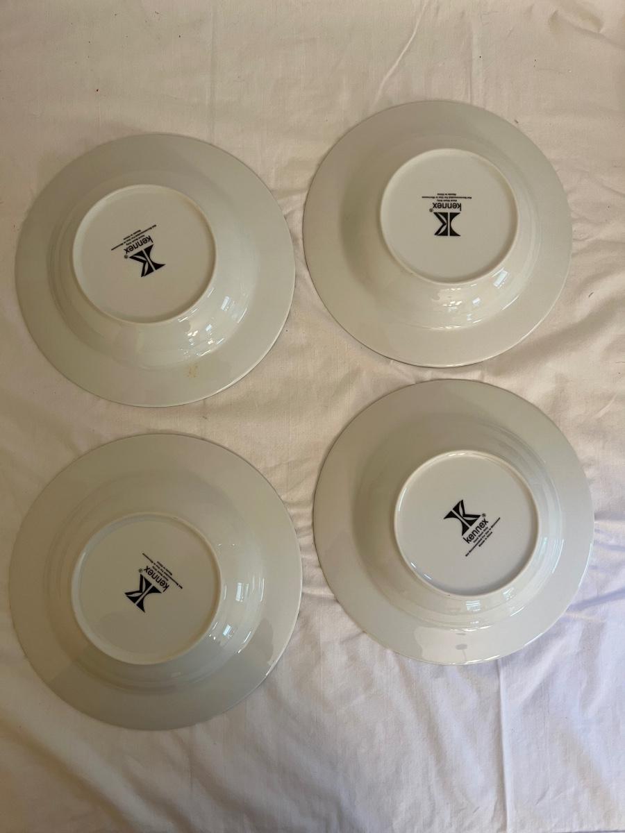 A complete place setting for eight Kennex dinnerware China set including a large serving bowl, which has some blemishes, see last two pictures, a serving platter, coffee, cups, a cream pitcher and sugar bowl. Eight of each: dinner plates 10.5”D, salad plates 7.5”D, soup bowls 8.5”D, coffee cups 3.5”D x2.25”H and saucers 6.125”D. Set also includes serving bowl 9”D x 2.5” and serving platter 12”D x 1”H as well as a cream pitcher 2.5”D x 3.75”H and covered sugar bowl 4”D x 2.75”H.