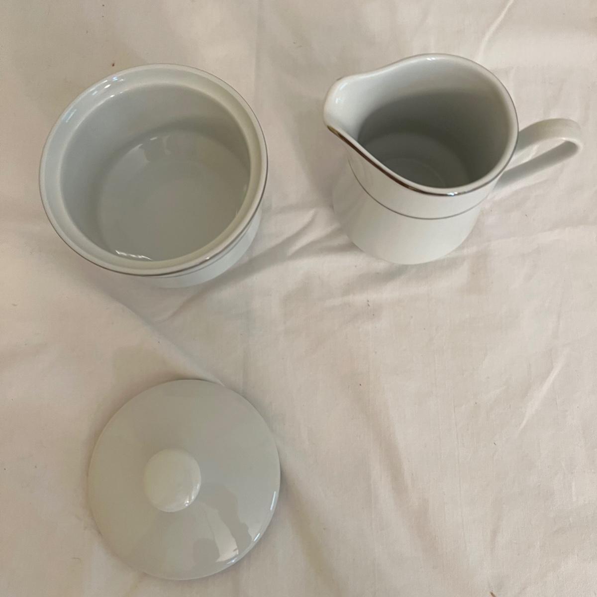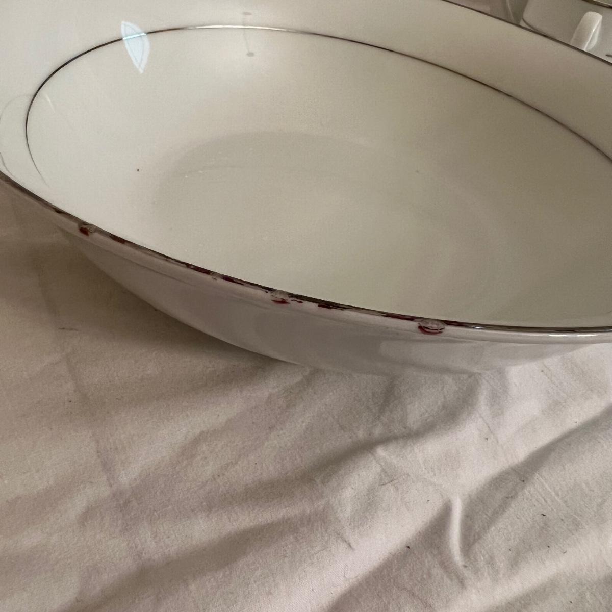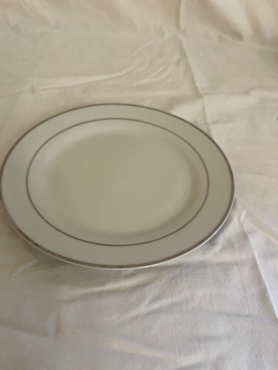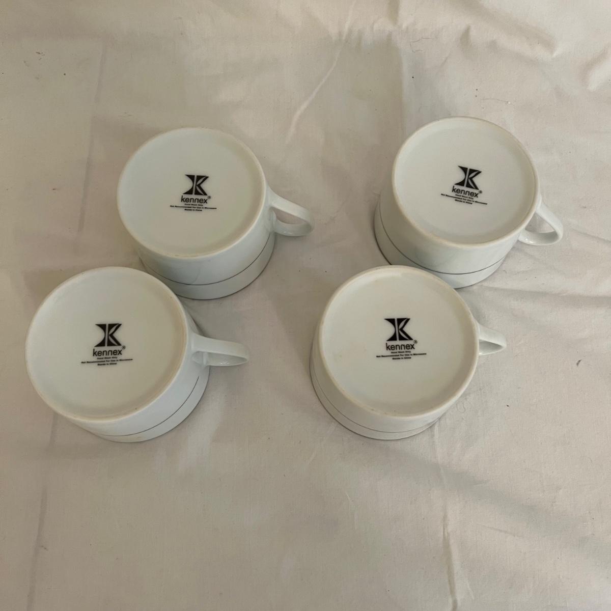 A complete place setting for eight Kennex dinnerware China set including a large serving bowl, which has some blemishes, see last two pictures, a serving platter, coffee, cups, a cream pitcher and sugar bowl. Eight of each: dinner plates 10.5”D, salad plates 7.5”D, soup bowls 8.5”D, coffee cups 3.5”D x2.25”H and saucers 6.125”D. Set also includes serving bowl 9”D x 2.5” and serving platter 12”D x 1”H as well as a cream pitcher 2.5”D x 3.75”H and covered sugar bowl 4”D x 2.75”H.