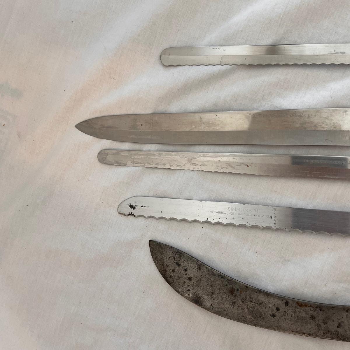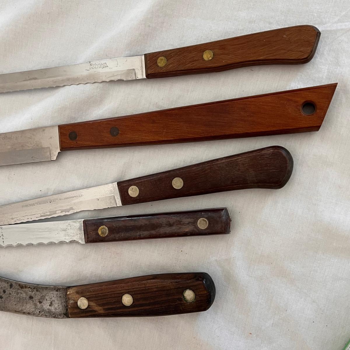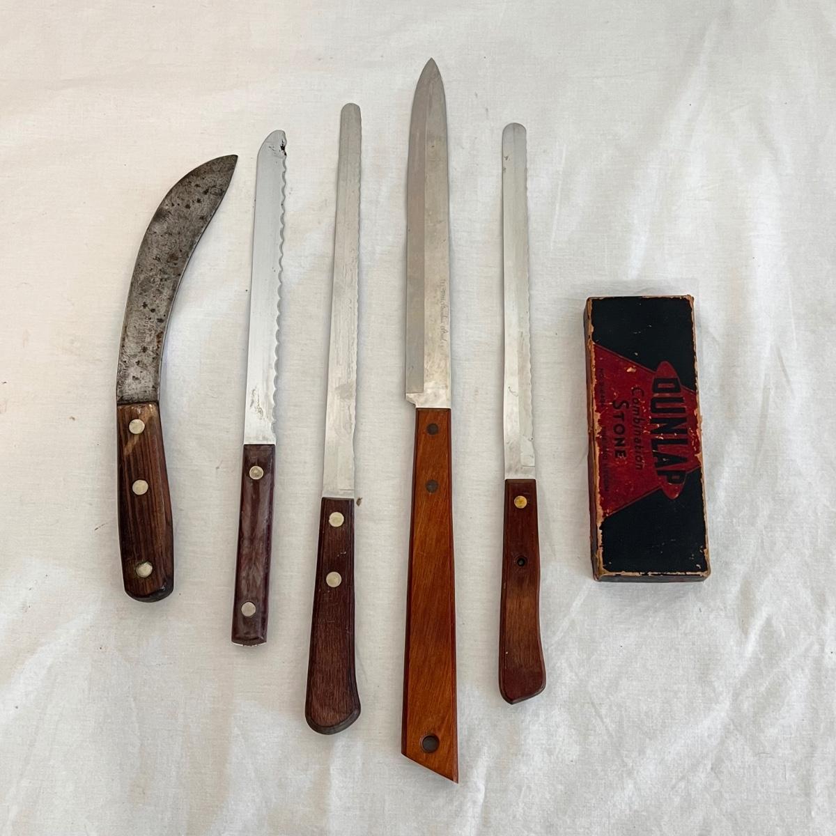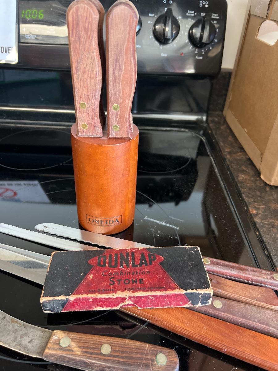 This set includes a variety of kitchen knives. The stamps that appear on the knives are Simmons “8”, Robeson “Frozen Heat,” Tel-tru Stainless Steel, and Robinson Stainless USA. Also includes a Oneida six piece steak knives with wooden holder. The combination stone is branded with Dunlap. The largest knife measures 1” x 17”H. Local pickup only