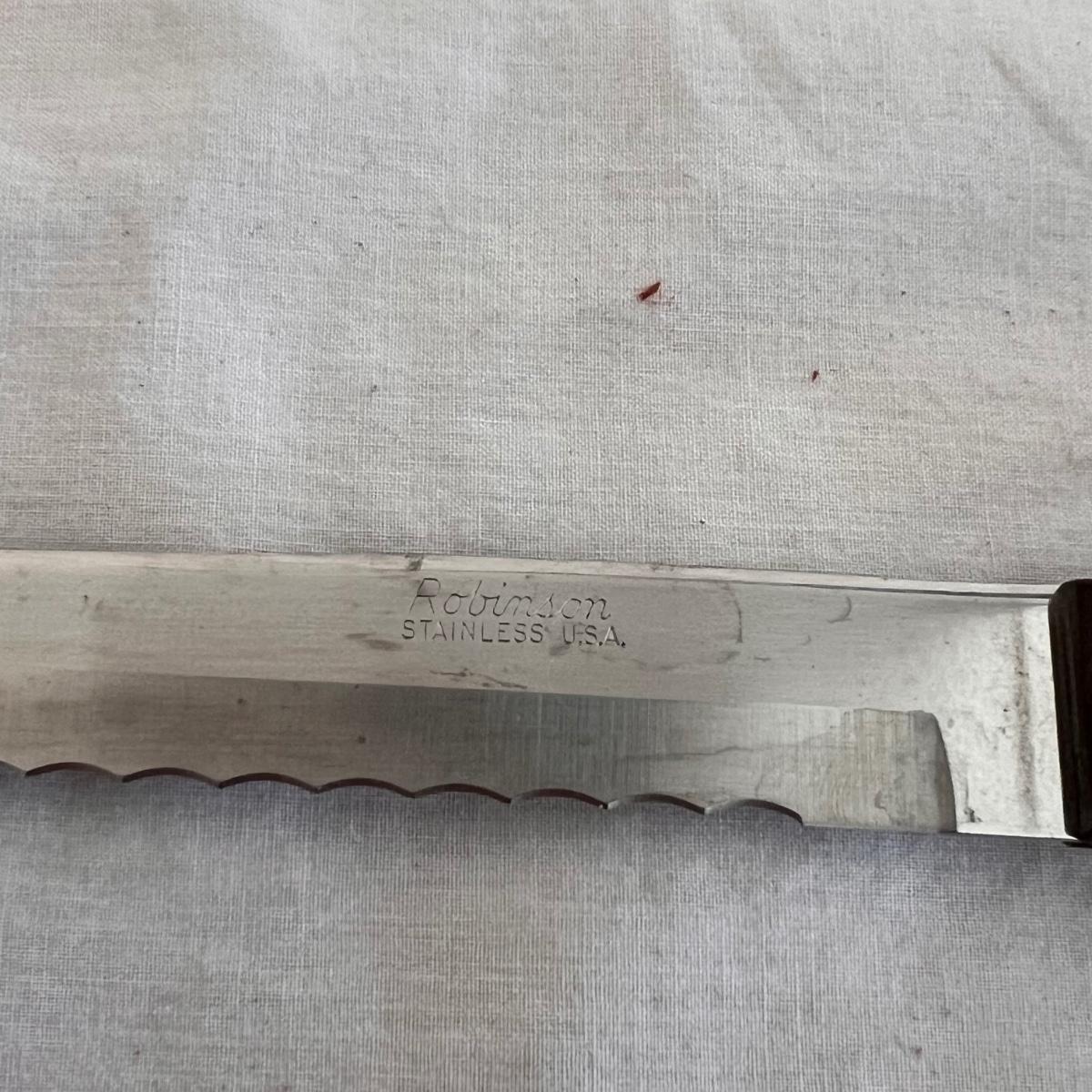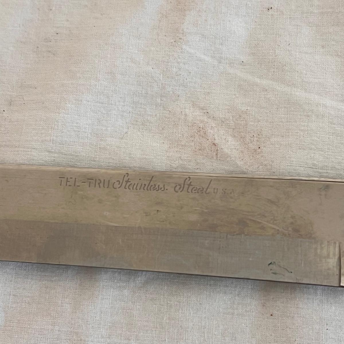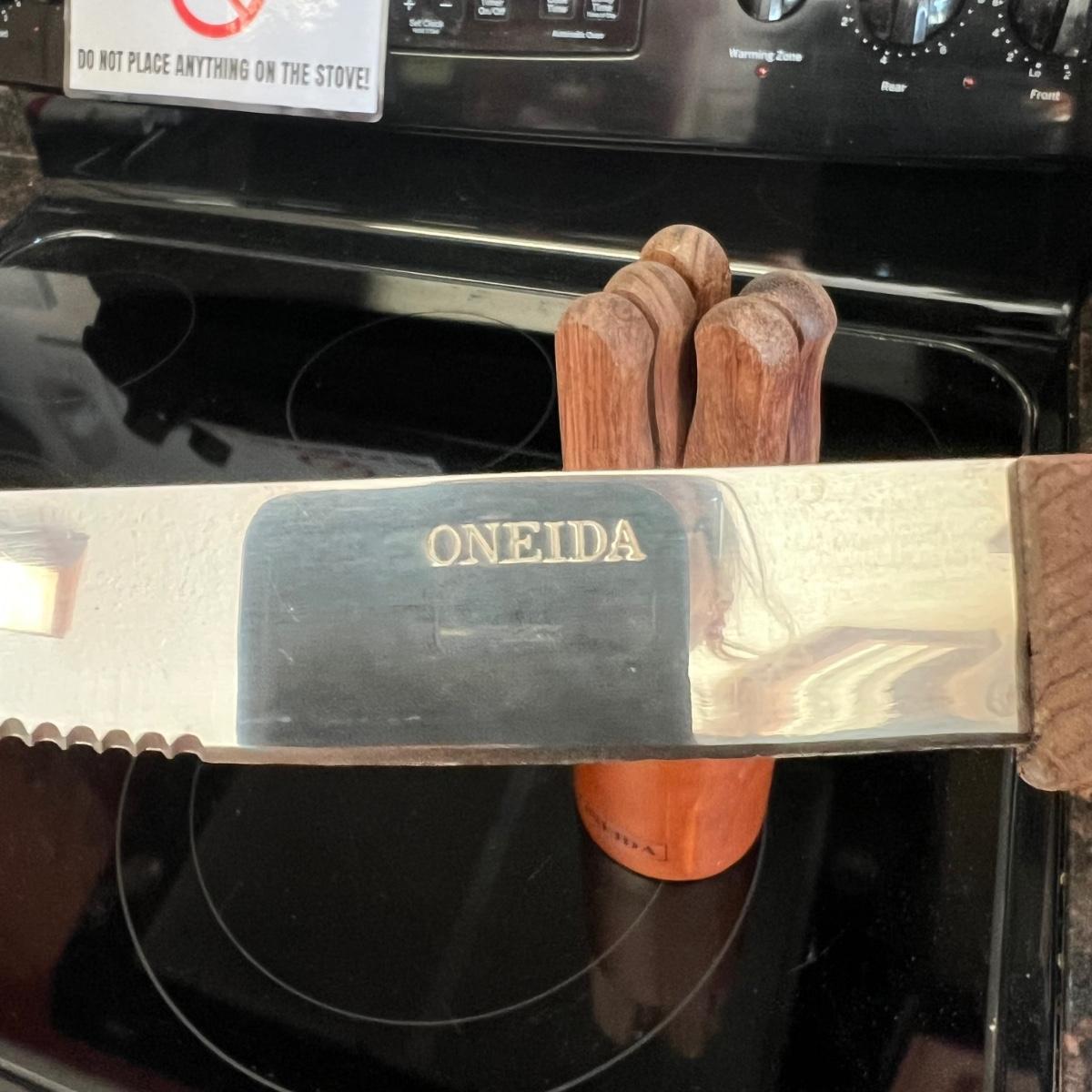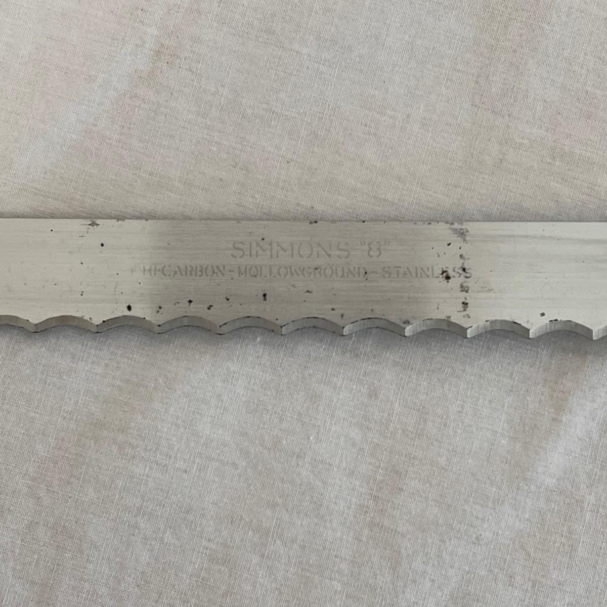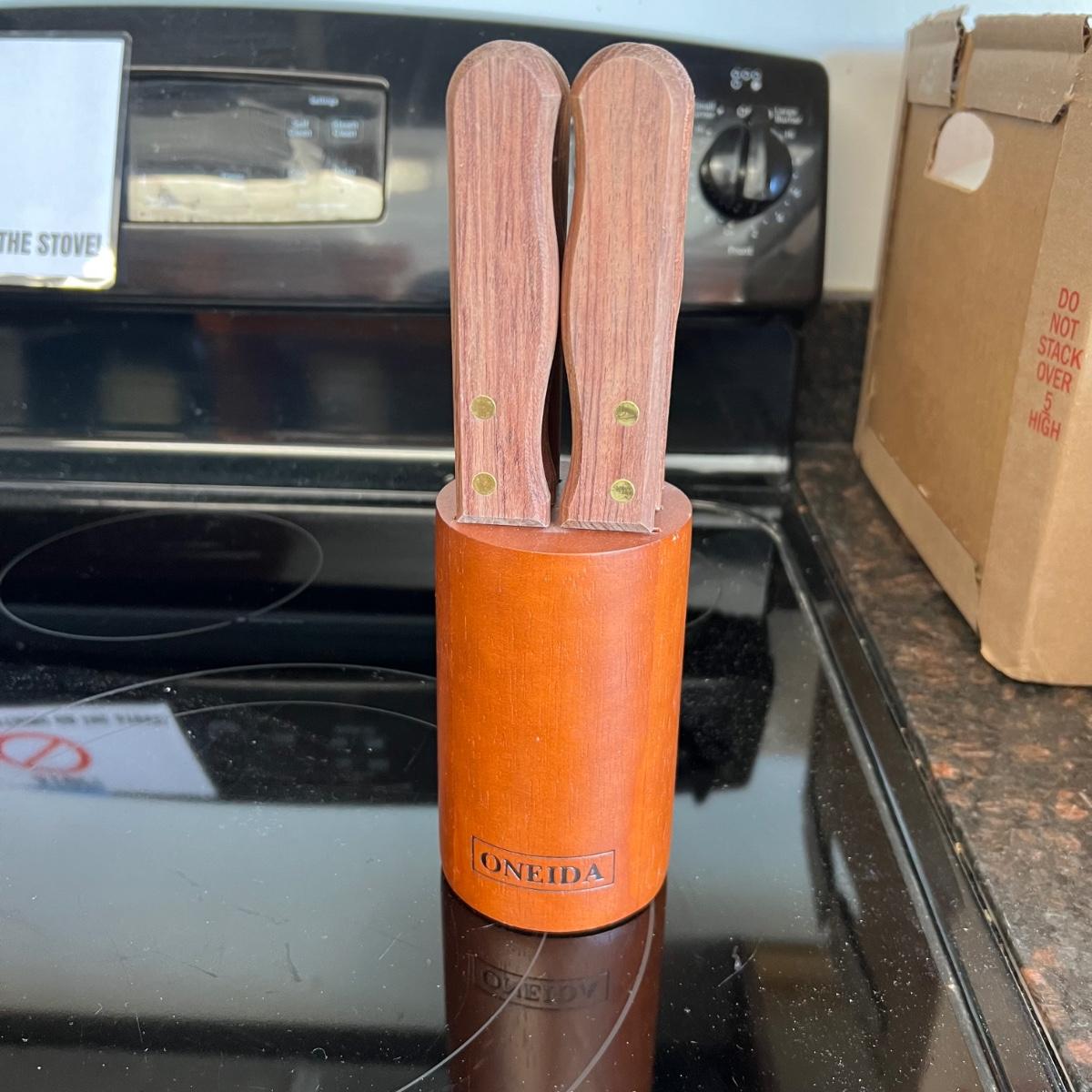 This set includes a variety of kitchen knives. The stamps that appear on the knives are Simmons “8”, Robeson “Frozen Heat,” Tel-tru Stainless Steel, and Robinson Stainless USA. Also includes a Oneida six piece steak knives with wooden holder. The combination stone is branded with Dunlap. The largest knife measures 1” x 17”H. Local pickup only