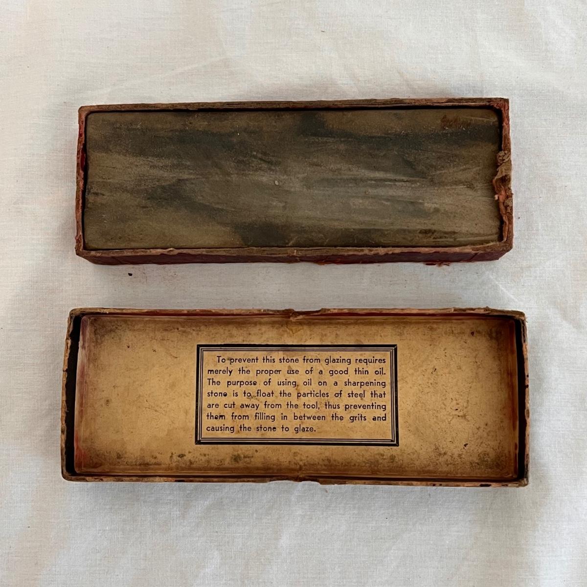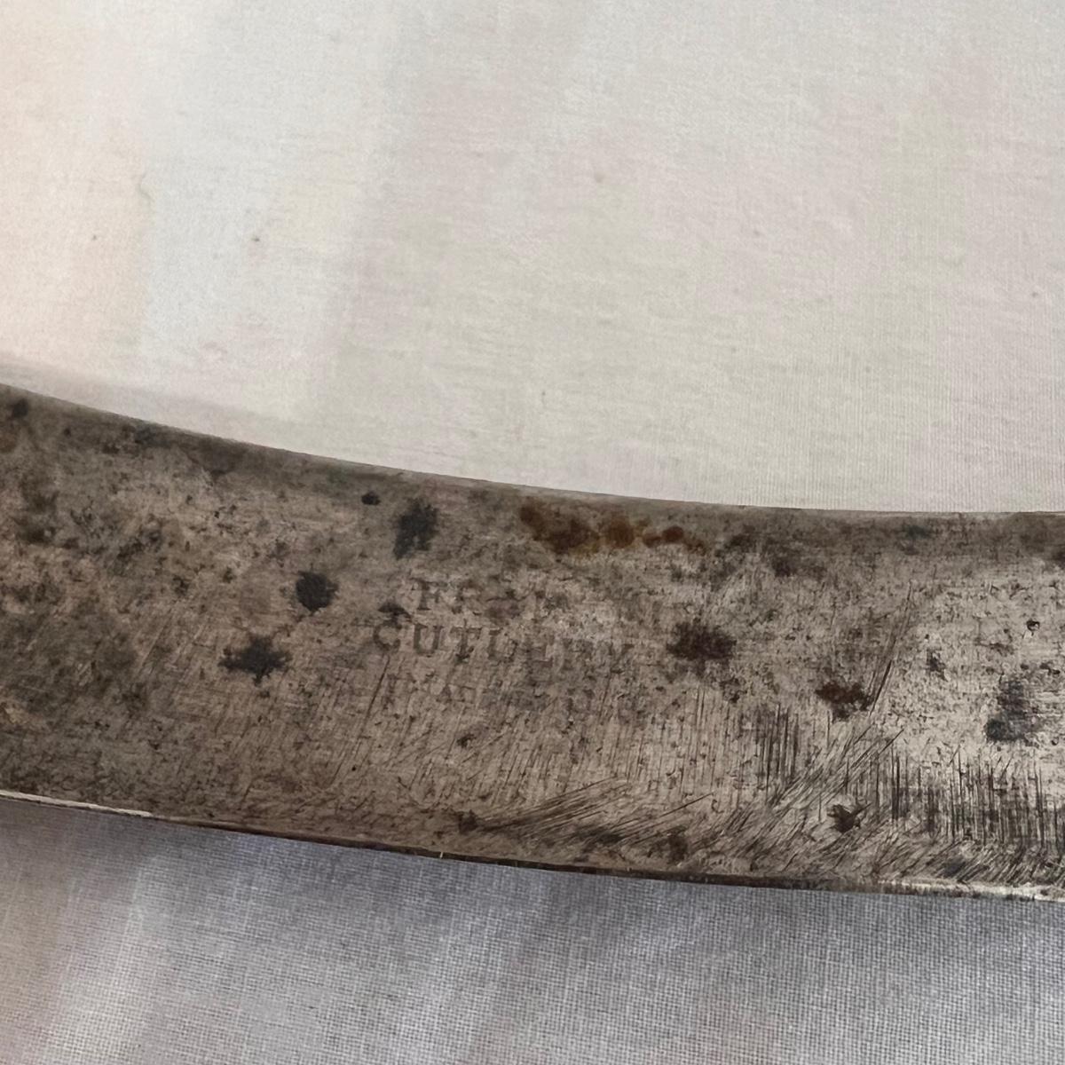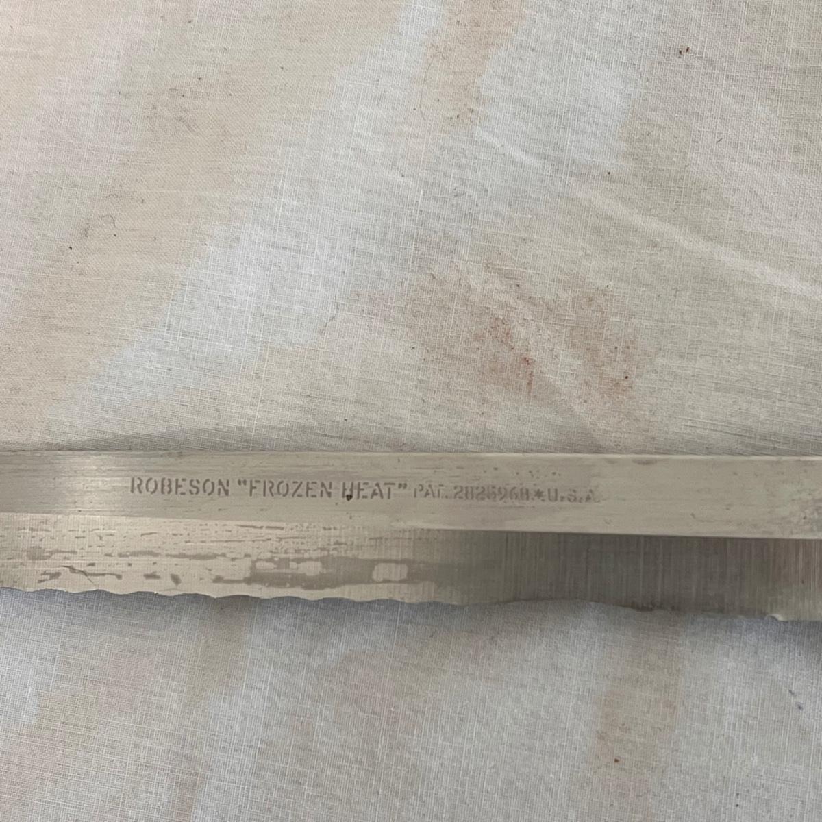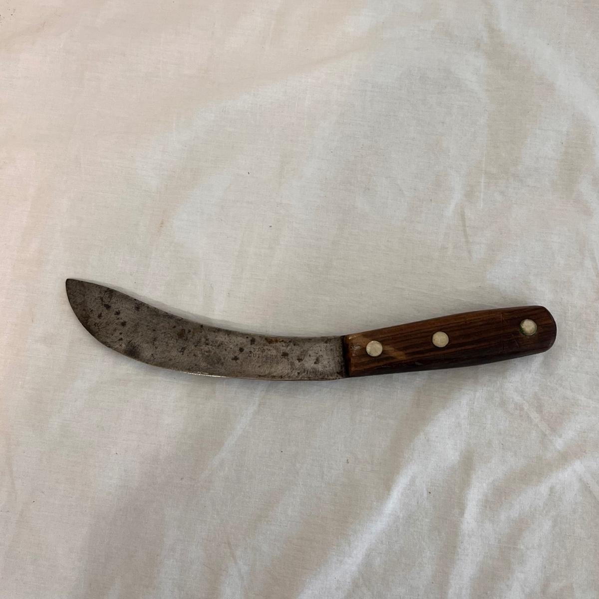 This set includes a variety of kitchen knives. The stamps that appear on the knives are Simmons “8”, Robeson “Frozen Heat,” Tel-tru Stainless Steel, and Robinson Stainless USA. Also includes a Oneida six piece steak knives with wooden holder. The combination stone is branded with Dunlap. The largest knife measures 1” x 17”H. Local pickup only