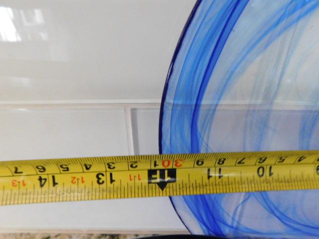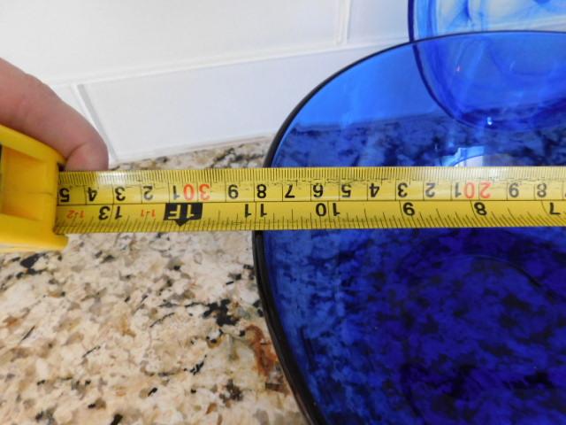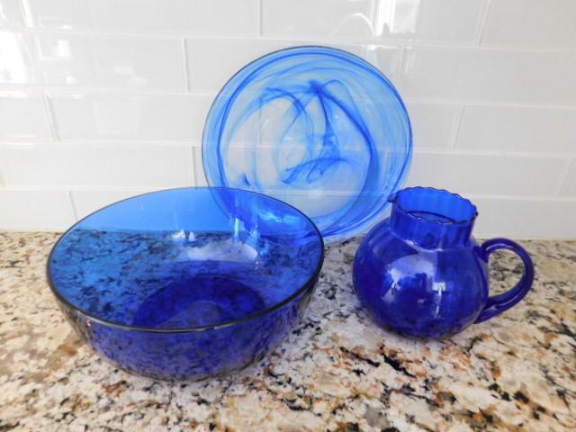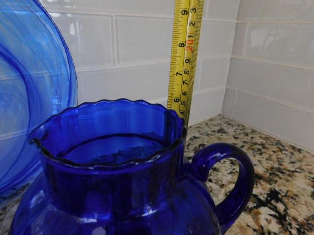 Set of Large Blue Glass Serving Items includes Pitcher, Fruit Bowl, and Platter