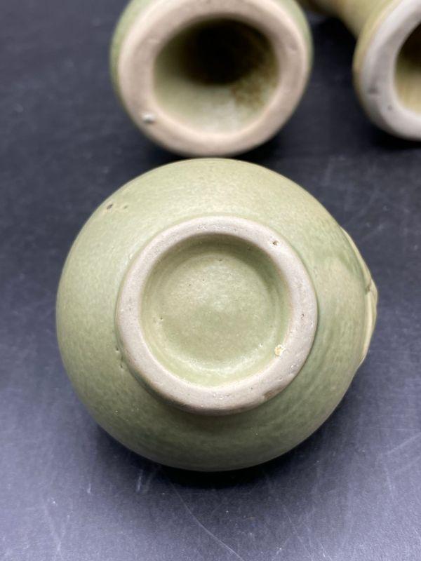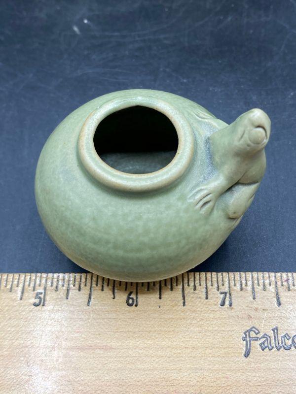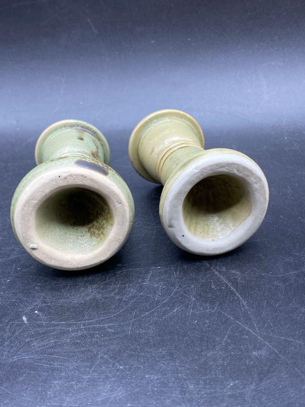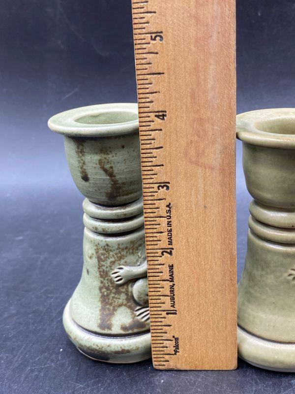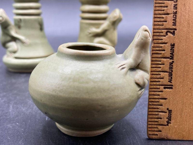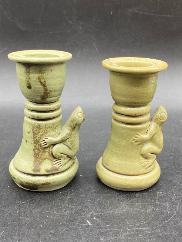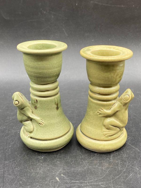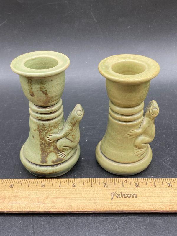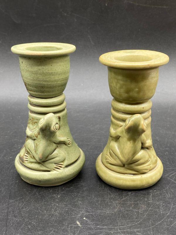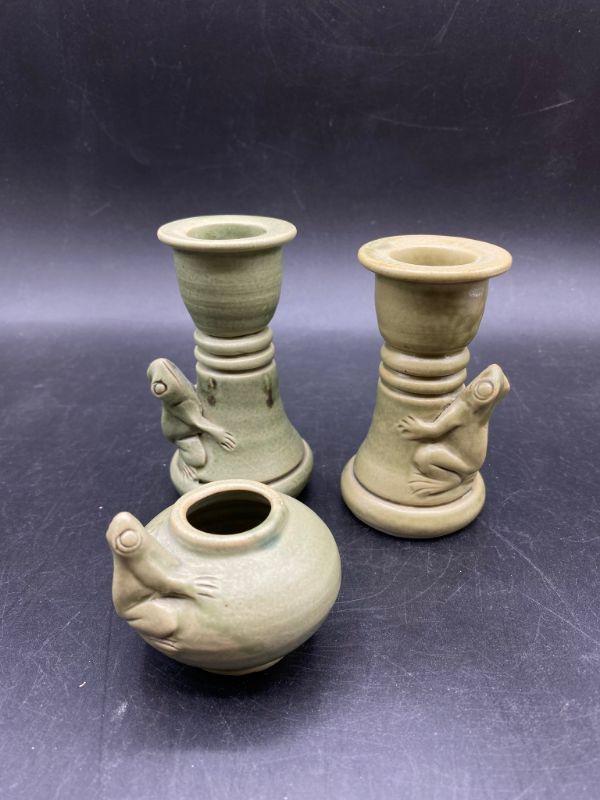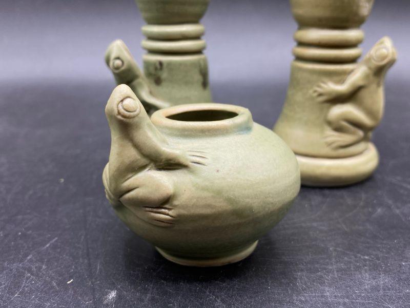 Set of majolica style frog pottery pieces. Includes a pair of candlestick holders and a mini vessel urn. Very pale green finish. Great condition. Unsigned pieces. The candleholders look identical but are slightly different, these are handmade so variance is common. No chips.