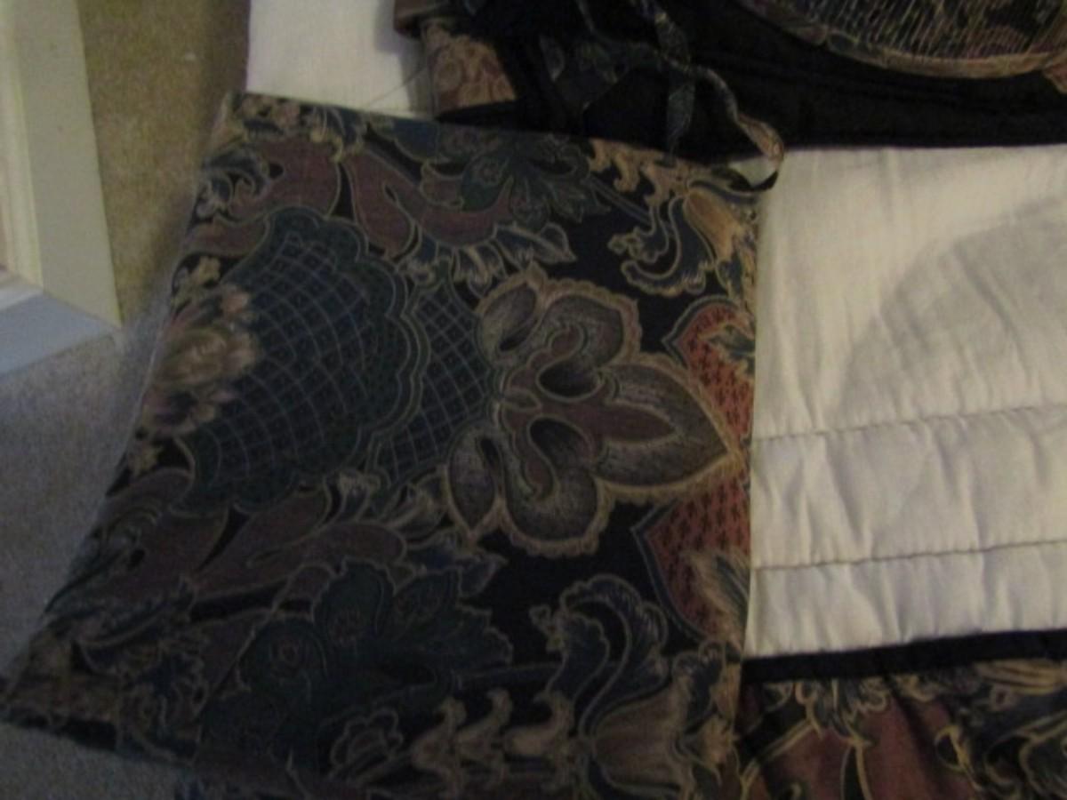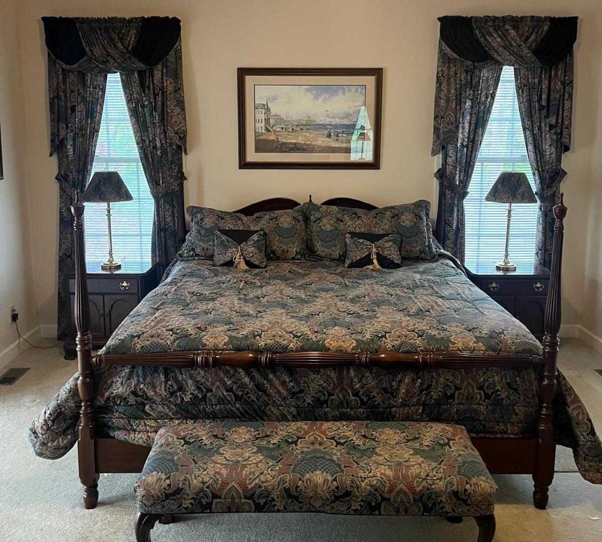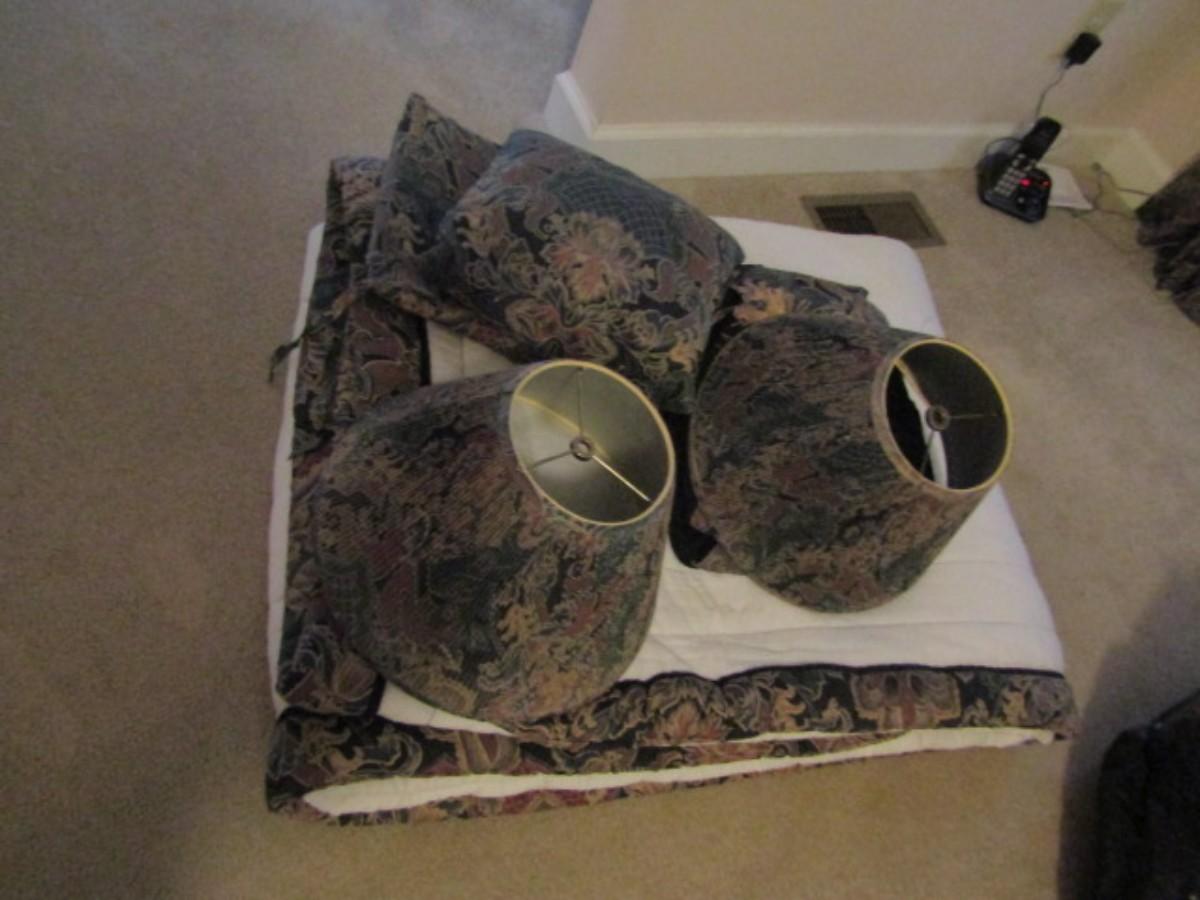 Set of Matching King-Sized Bedding, Lampshades and Drapes. Furniture and lamps not included.