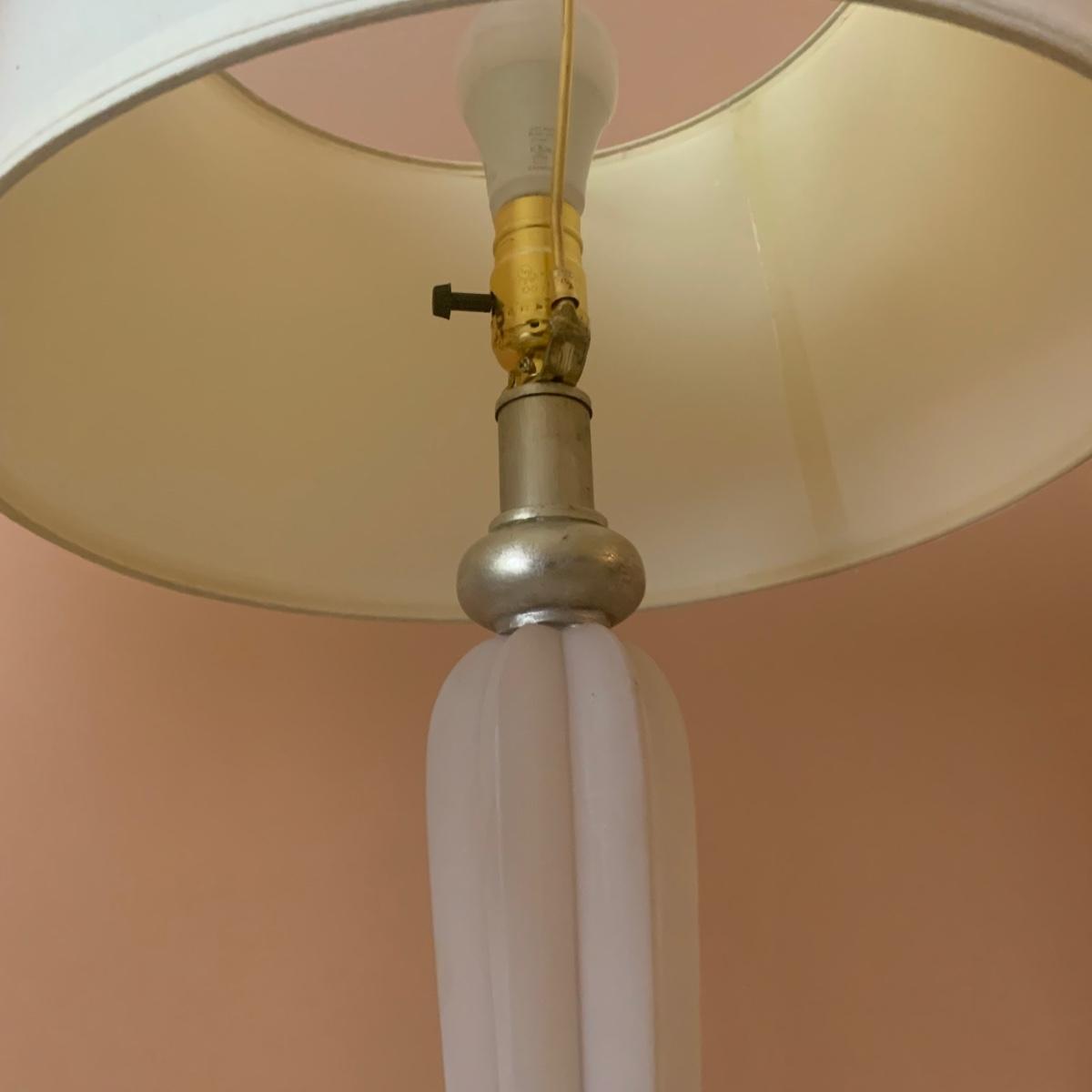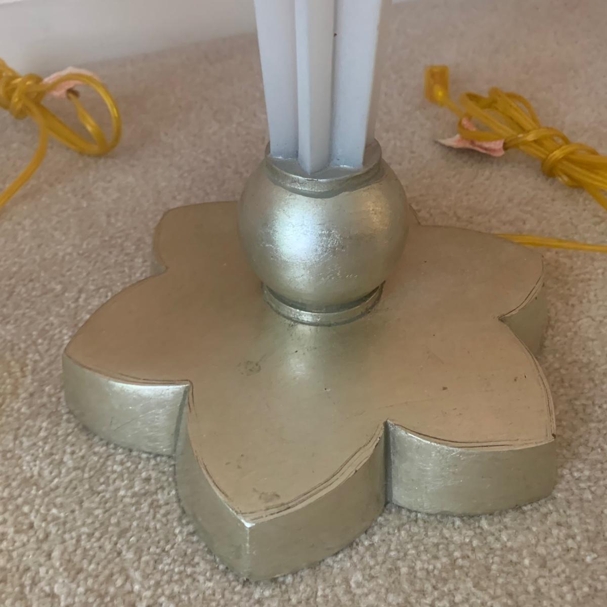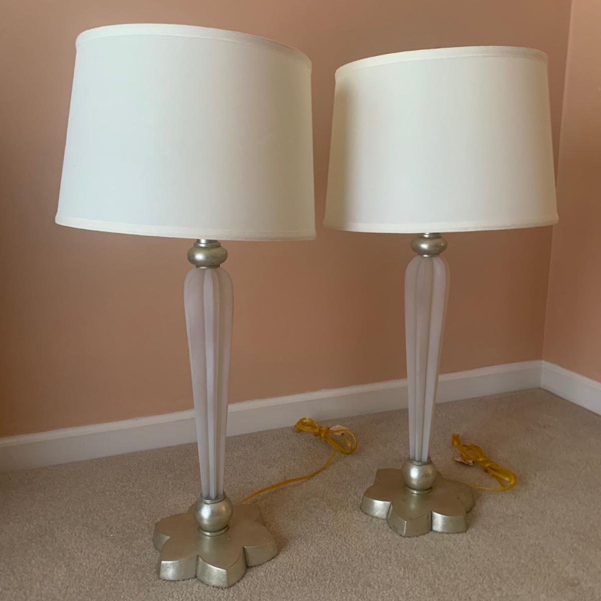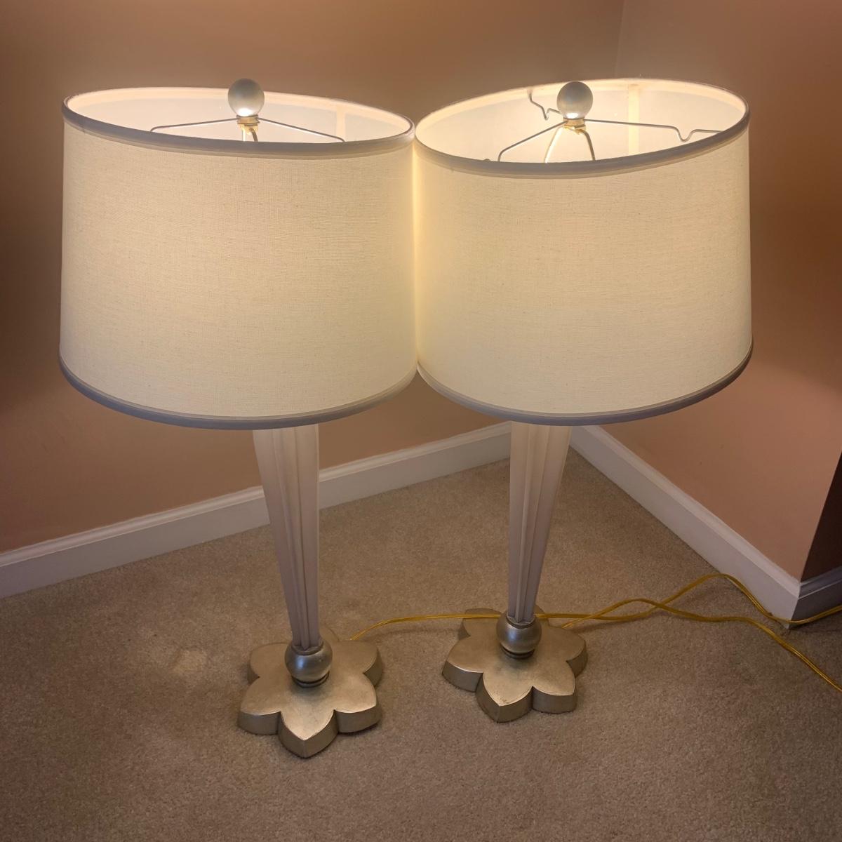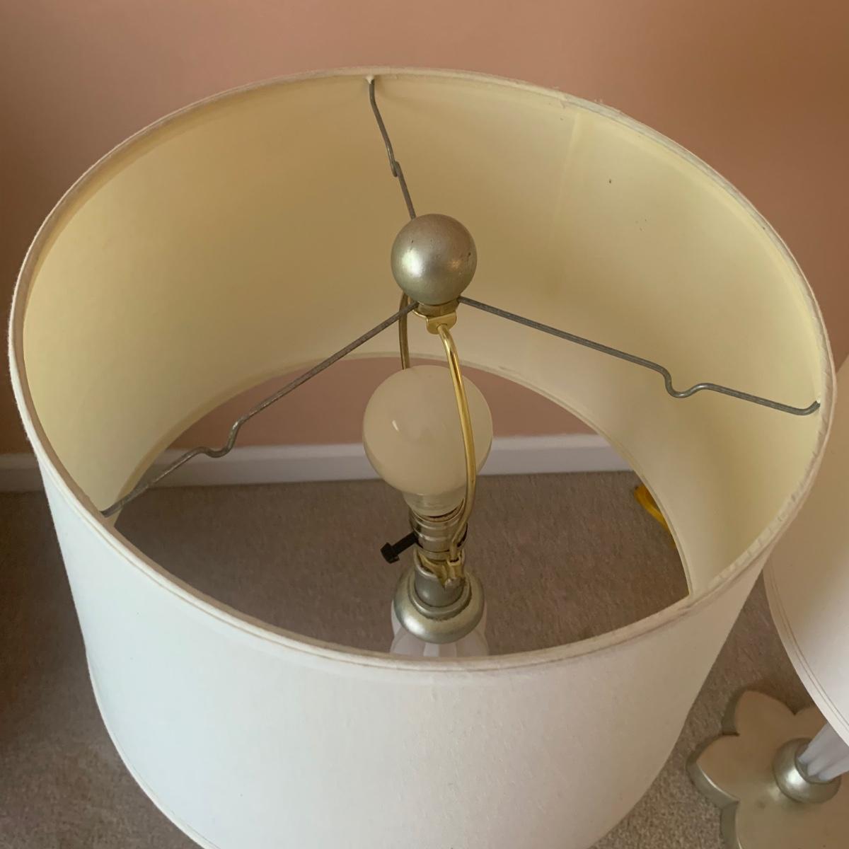 Matching set of table lamps with silver flower-shaped base, glass body, and white shade. Lamps powered on when plugged in and have 3 way lighting. Thwy measure approximately15"D x 32"H.. Please see photos for more details. Local pick-up only.