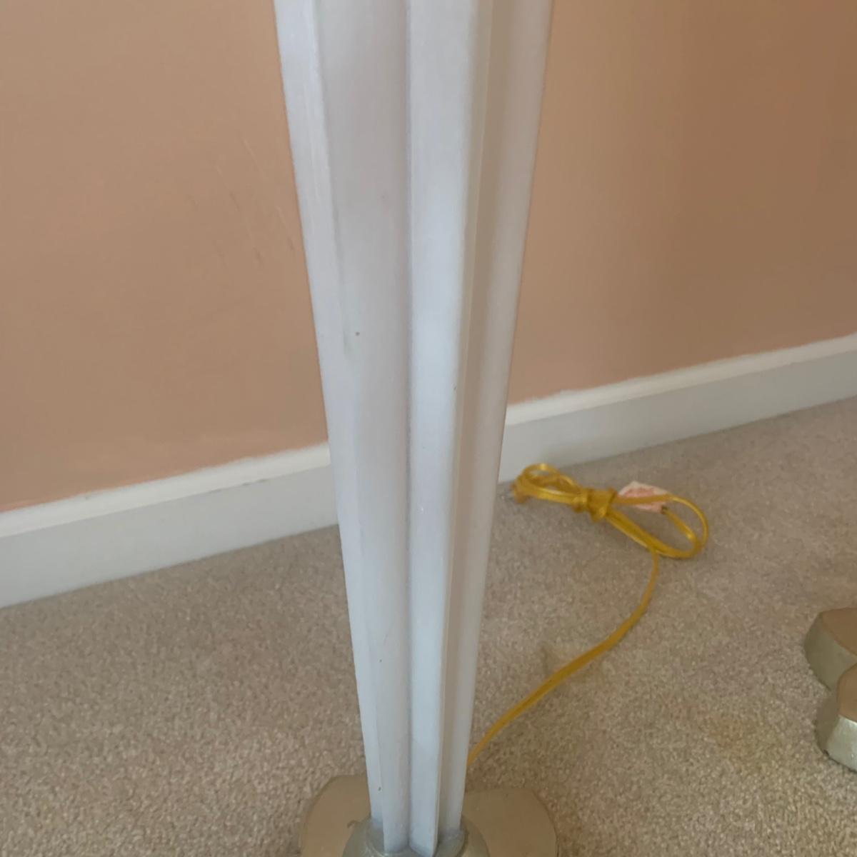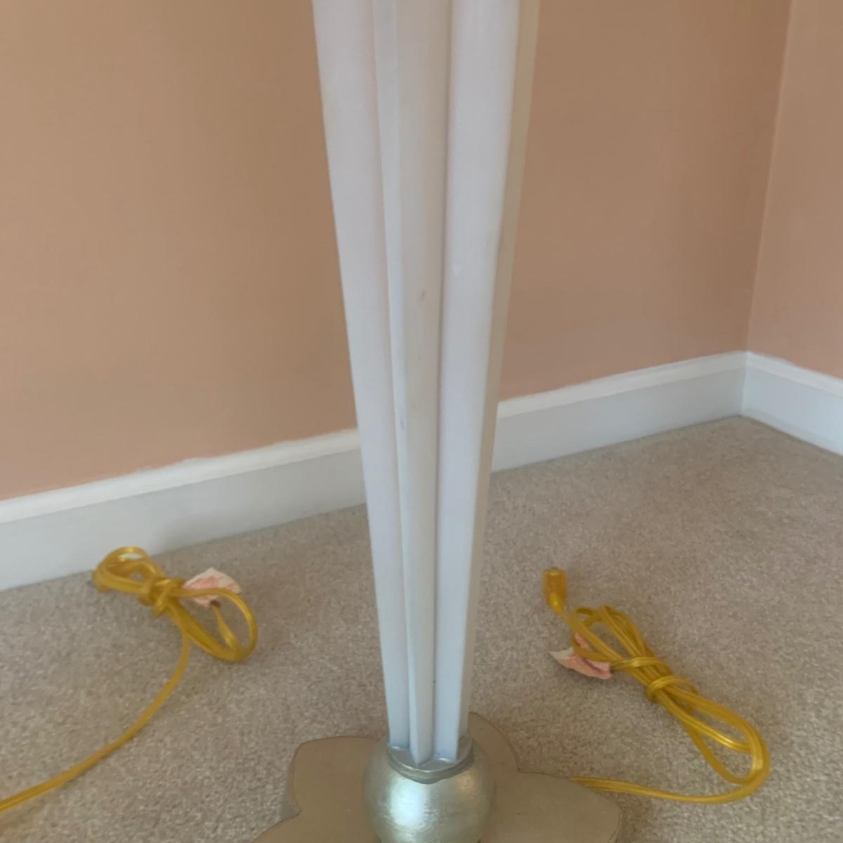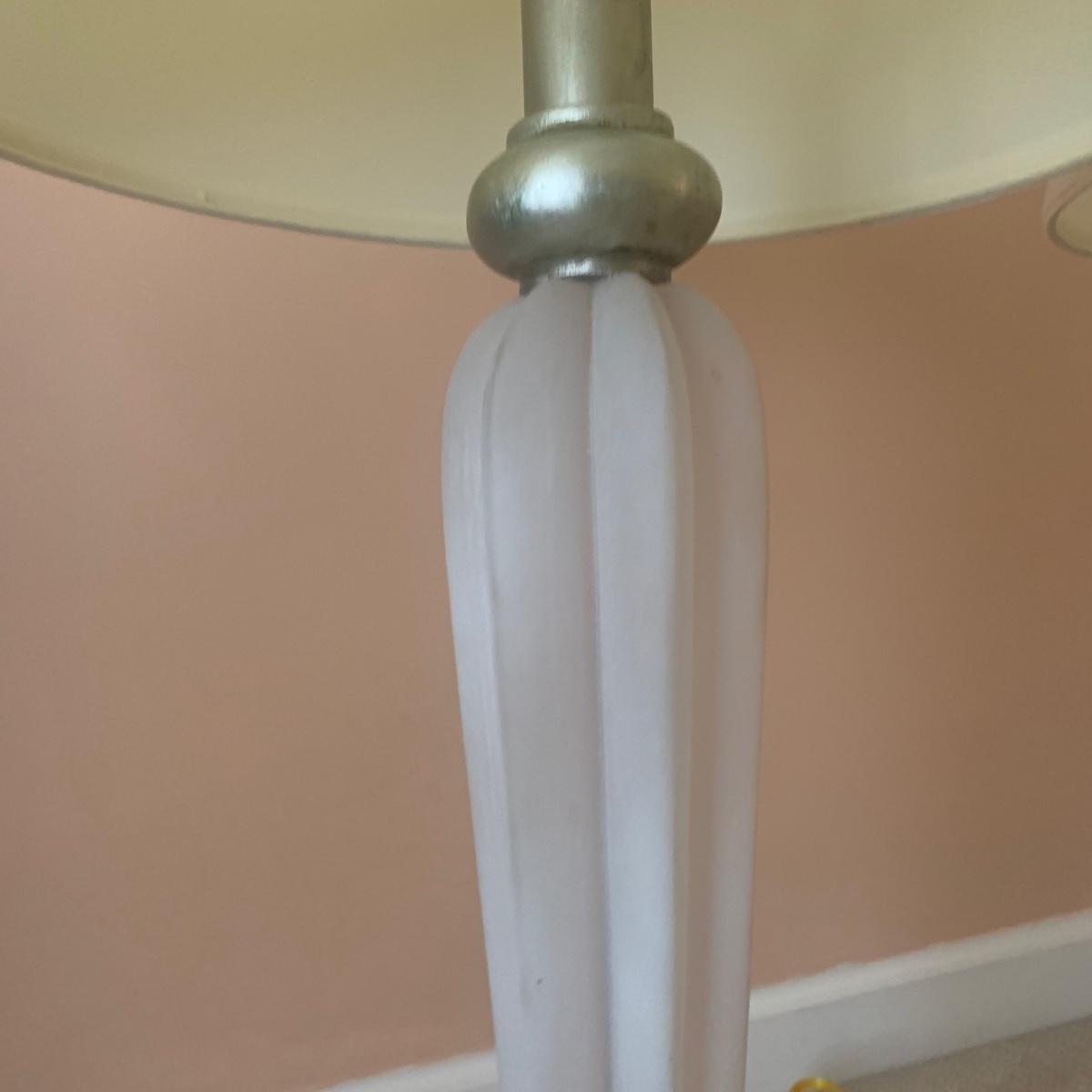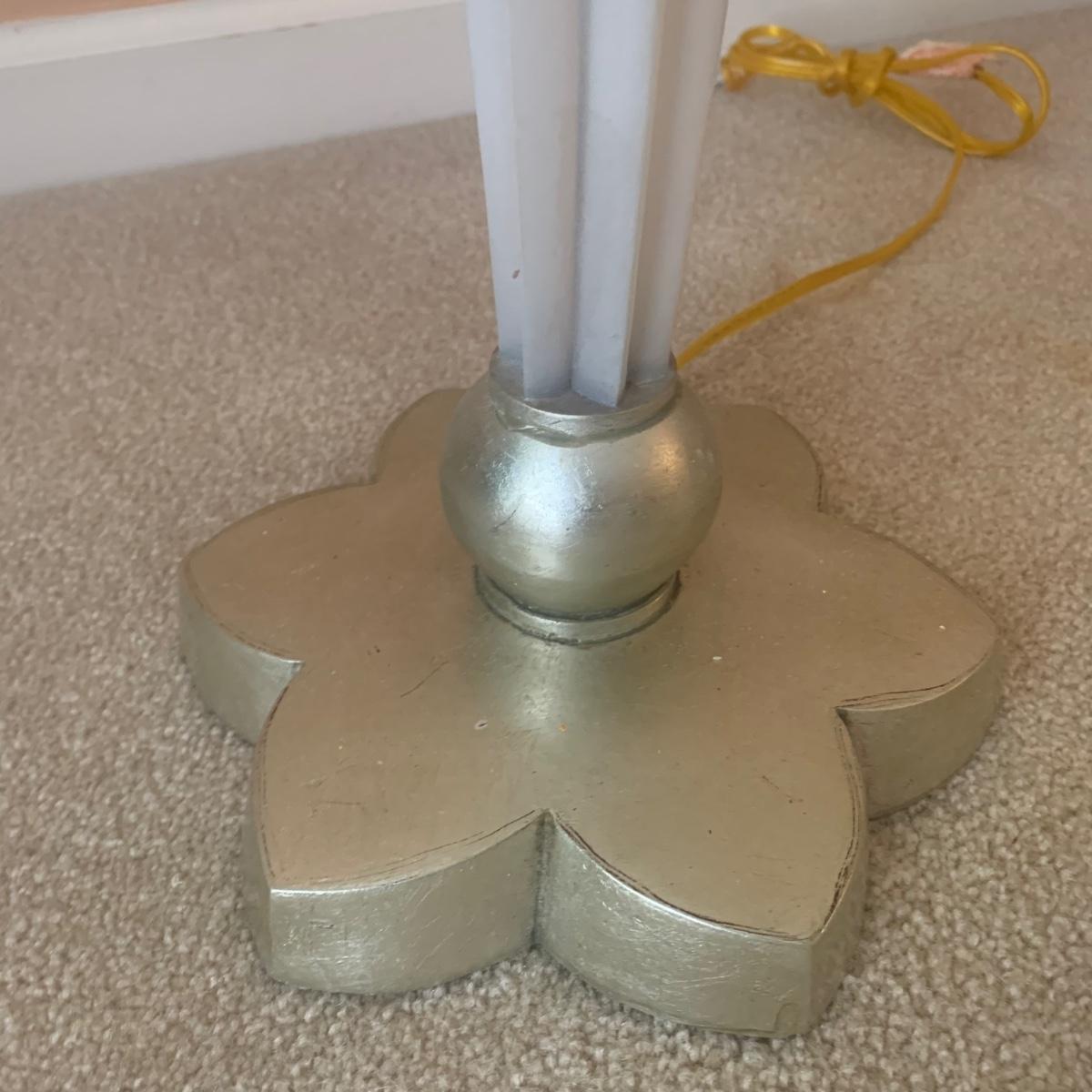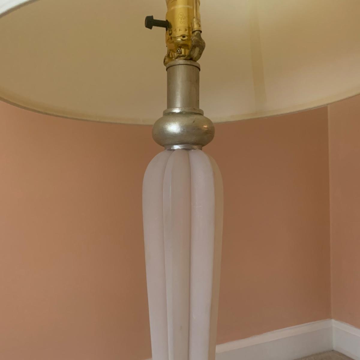 Matching set of table lamps with silver flower-shaped base, glass body, and white shade. Lamps powered on when plugged in and have 3 way lighting. Thwy measure approximately15"D x 32"H.. Please see photos for more details. Local pick-up only.