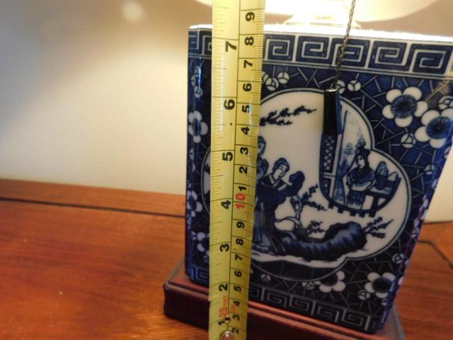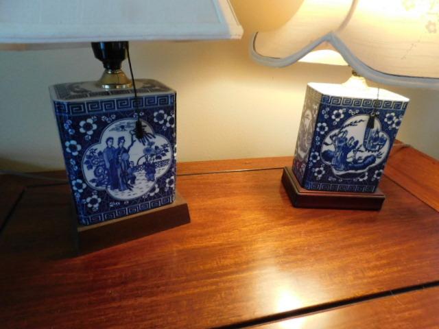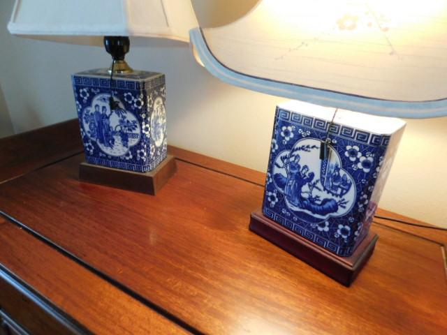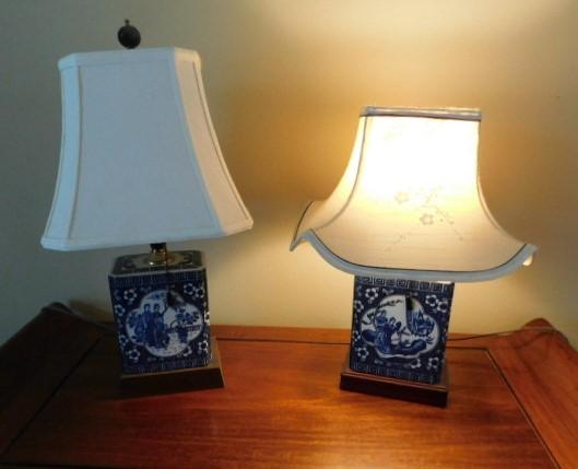 Set of Matching Vintage Blue & White Chinoiserie Lamps with Different Style Shades 7" Post