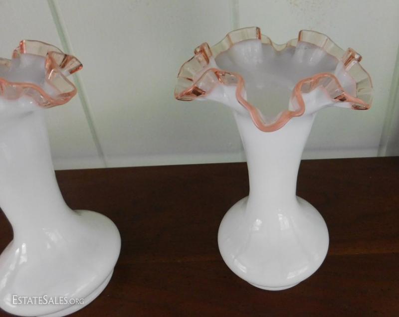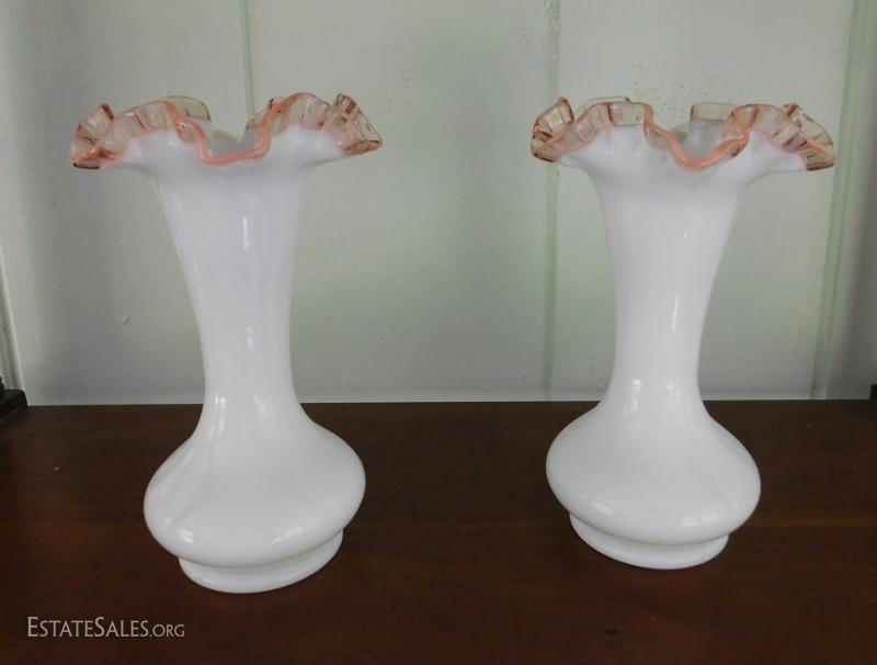 Offering a set of milk glass vases with ruffled edges. Approx. 7" Each has some dark specks and marking on inside lip of ruffles. Shipping Available.