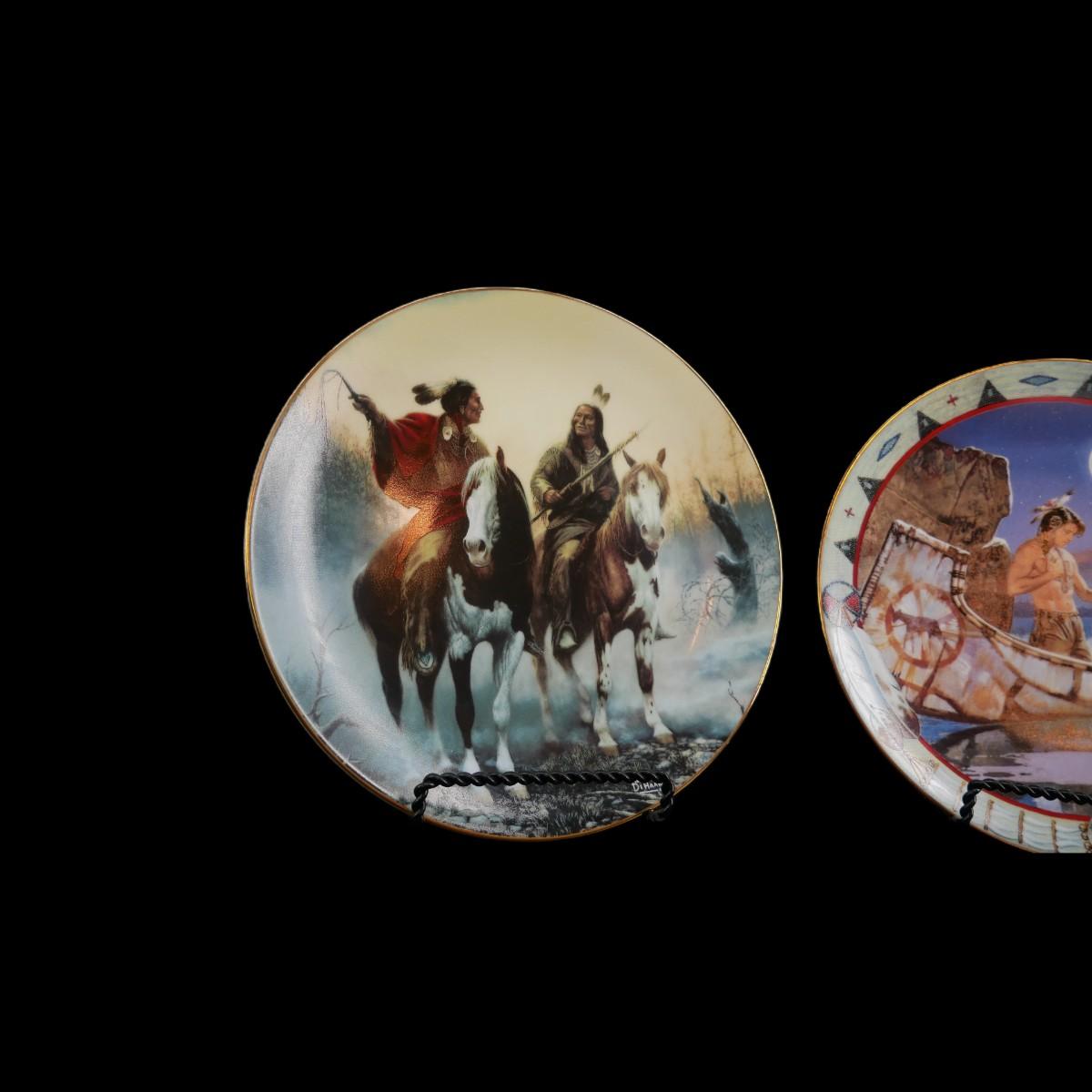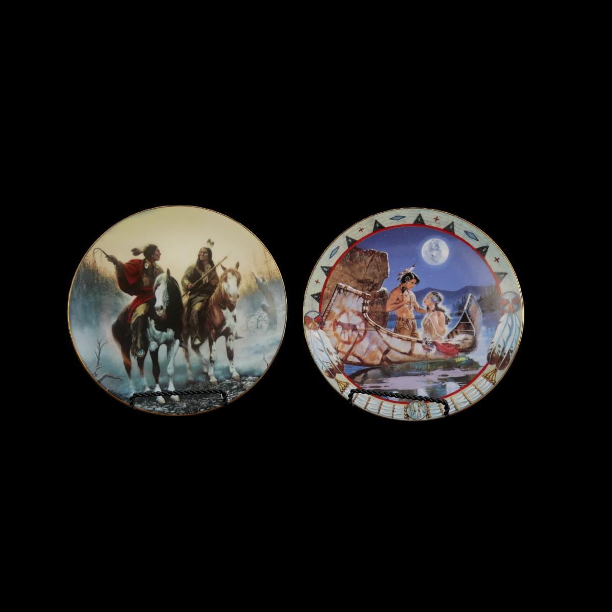 Two vintage limited edition Native American collectors plates. The Prideful Ones plate collection Village Markers by Chuck DeHaan #0511X 1993 The Hamilton Company and Spirit of Serenity from the Native American Legends plate collection #0609A with COA attached, The Hamilton Company 1996. Plates are approximately 8.25" in diameter. Both in excellent condition. Weight of lot is 1 lb 6 oz. (C69)
