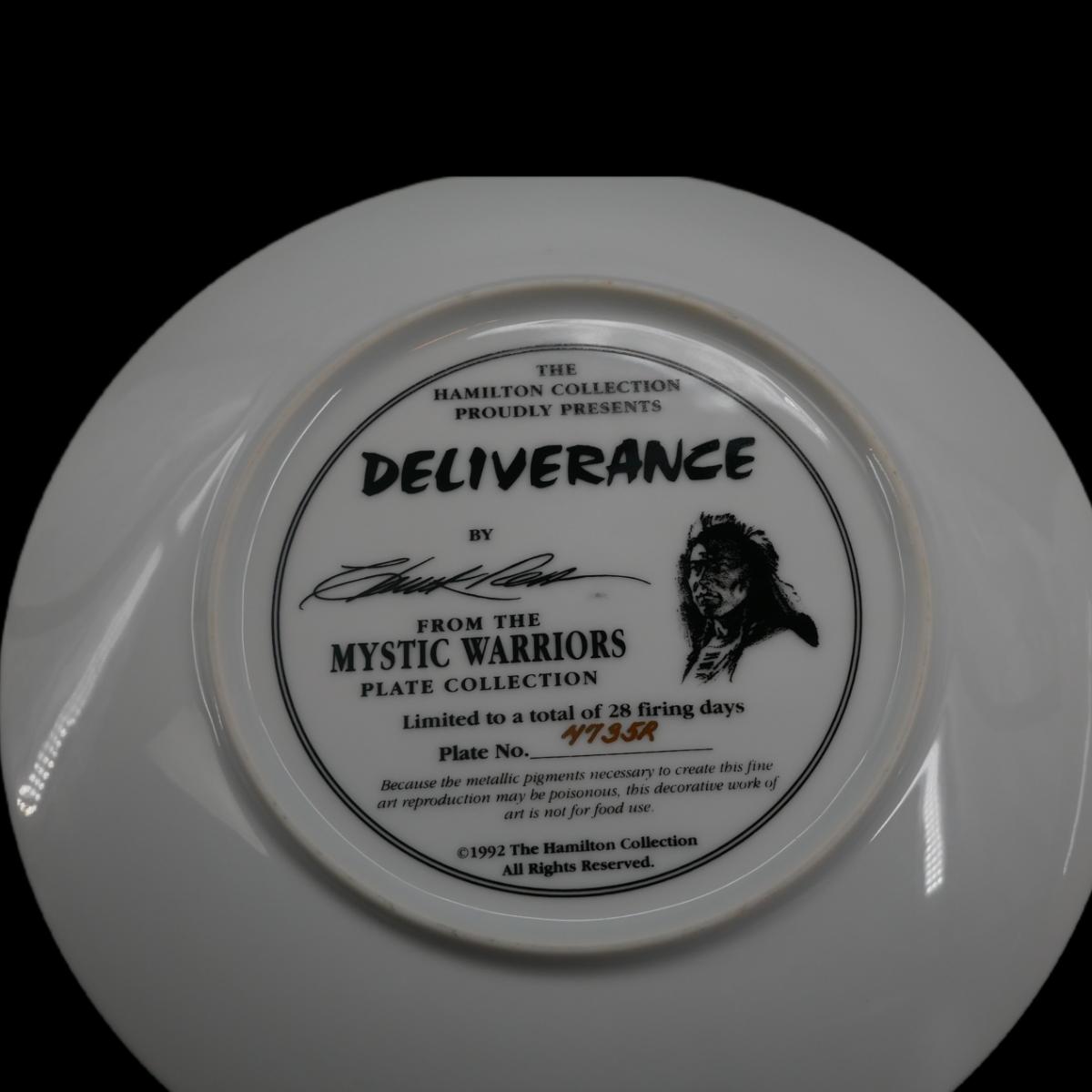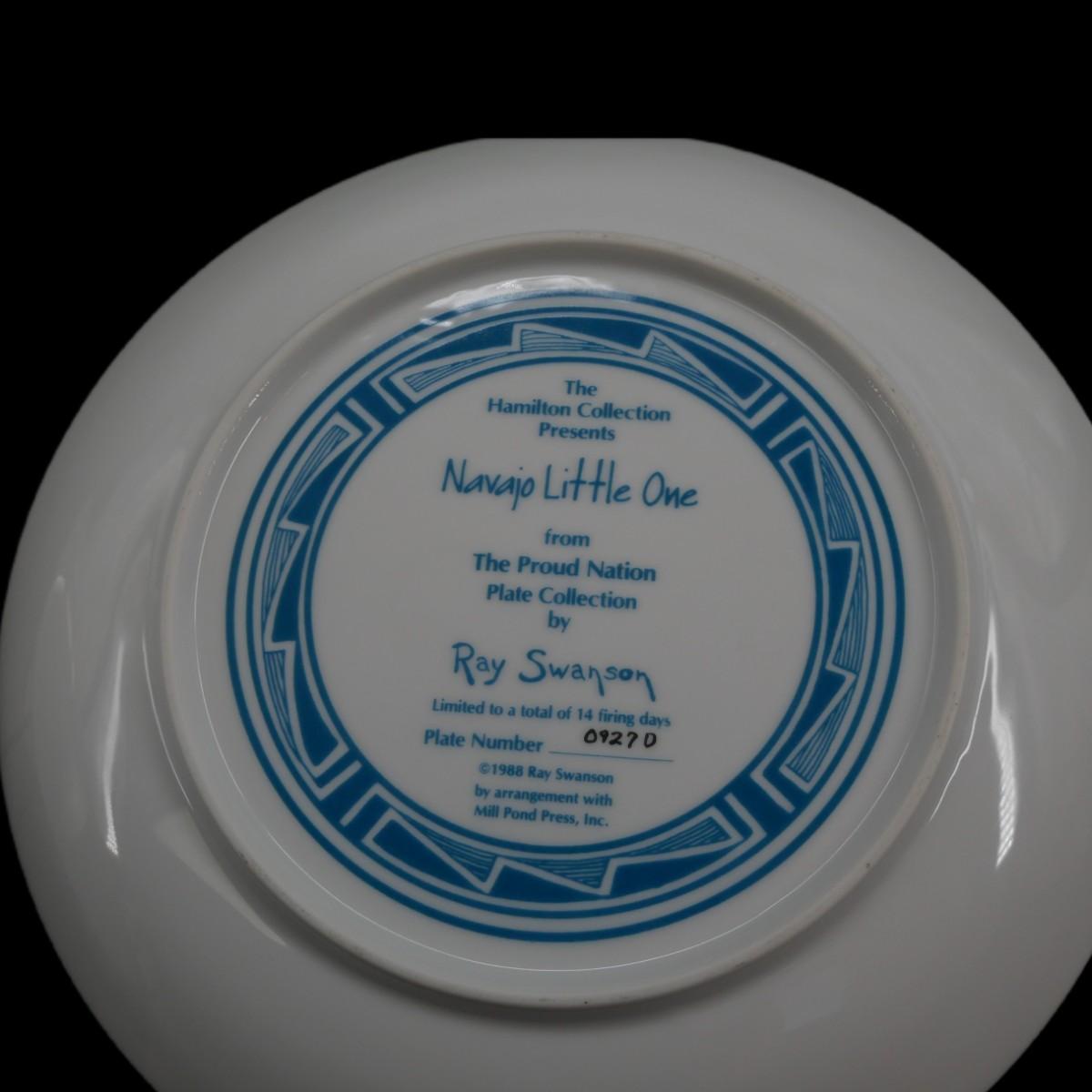 Two vintage limited edition Native American collectors plates. Deliverance by Chuck Ren #4735R, The Hamilton Company 1992. Measures 8.25" in diameter. Navajo Little One by Ray Swanson #09270, The Hamilton Company 1988. Measures 8.5" in diameter. Both in excellent condition. Weight of lot is 14 oz. (C70)