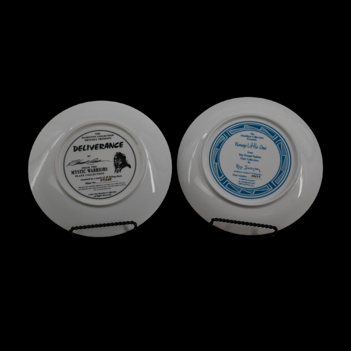 Two vintage limited edition Native American collectors plates. Deliverance by Chuck Ren #4735R, The Hamilton Company 1992. Measures 8.25" in diameter. Navajo Little One by Ray Swanson #09270, The Hamilton Company 1988. Measures 8.5" in diameter. Both in excellent condition. Weight of lot is 14 oz. (C70)