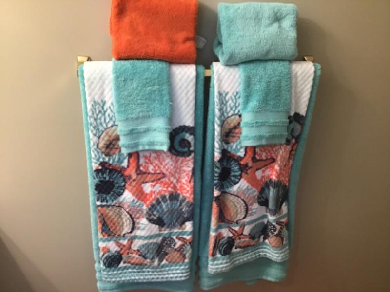 SET OF NAUTICAL BATH TOWELS AND BATH RUGS- ORANGE AND BLUES