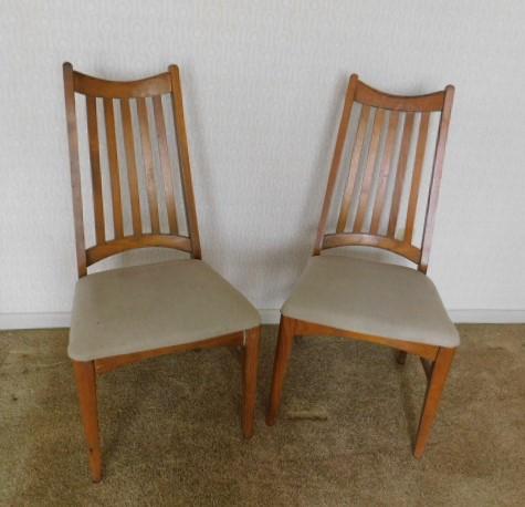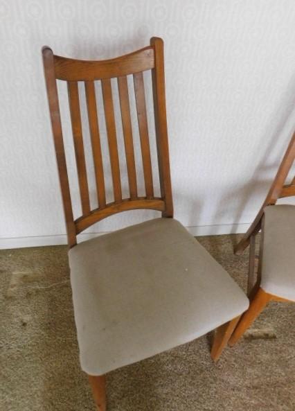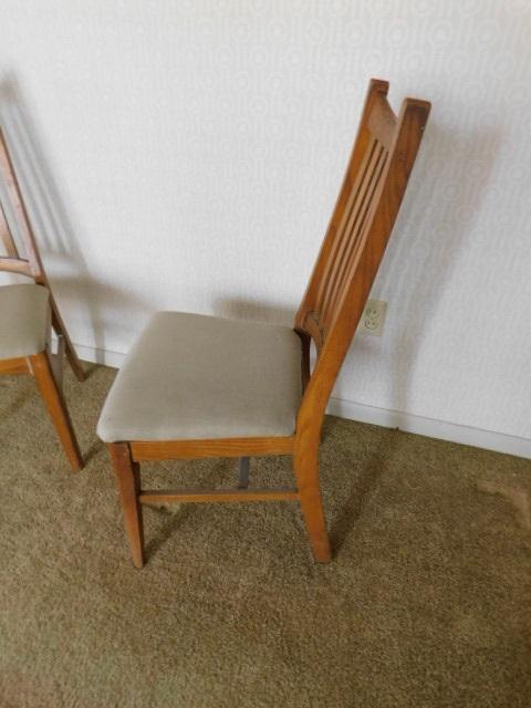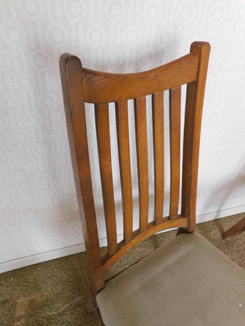 Set of Oak Wood Slat Back Chairs with Upholstered Seats in good condition may have some wear or scratches.