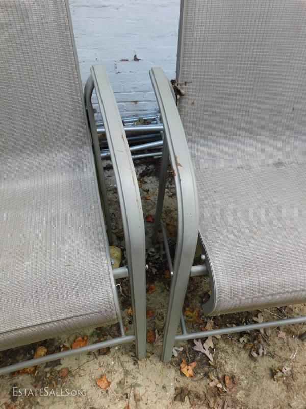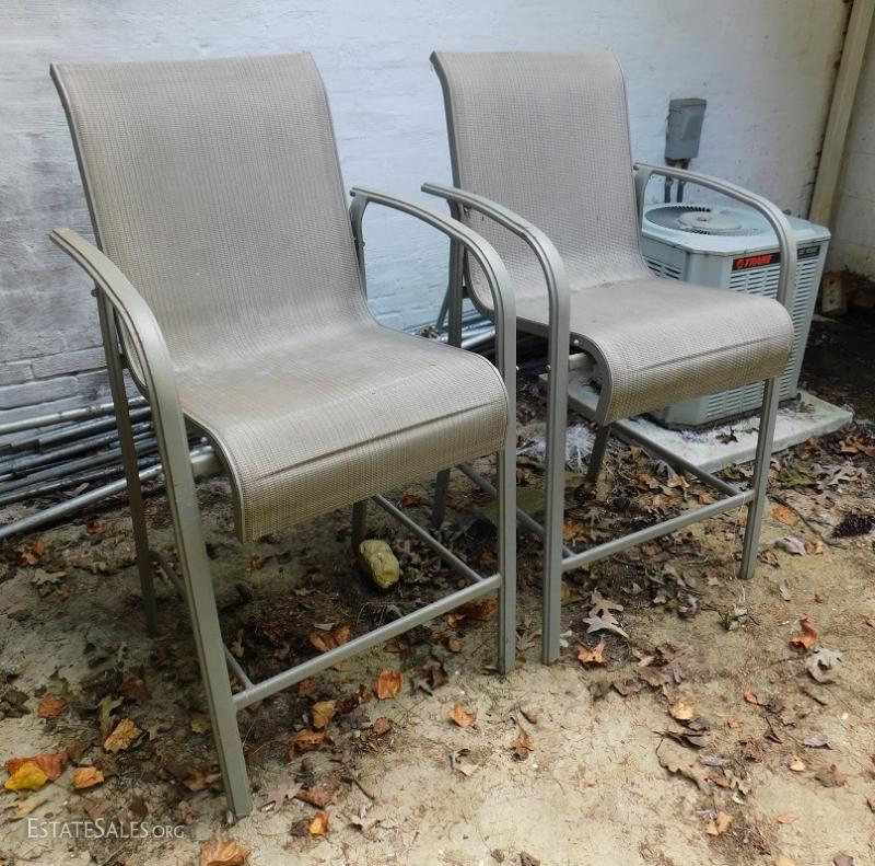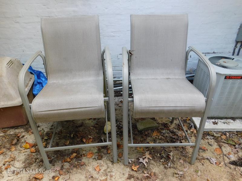 Bar height metal outdoor patio chairs. Some rusting on exposed metal arms and legs. Still very sturdy. Needs cleaning.