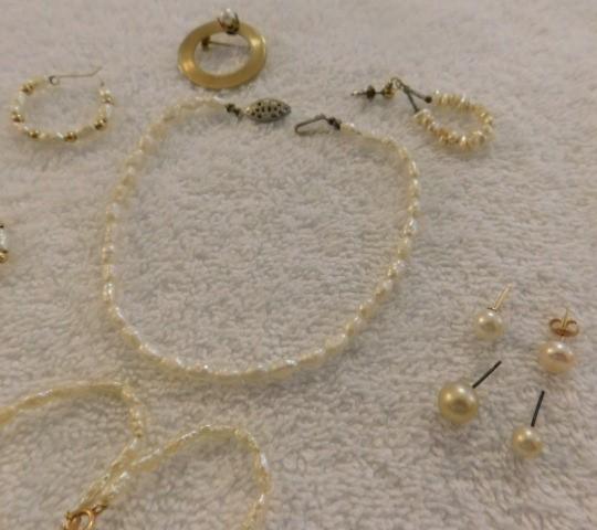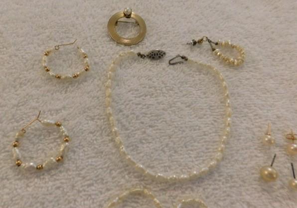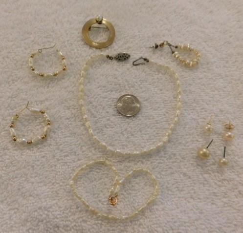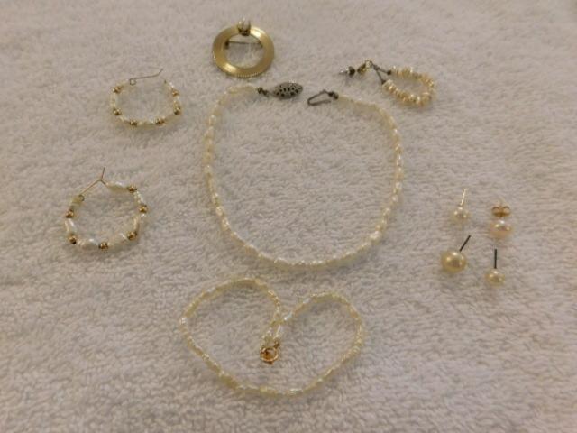 Set of Pearl Beaded Necklace, Earrings, Bracelet, Pin with Gold Accents