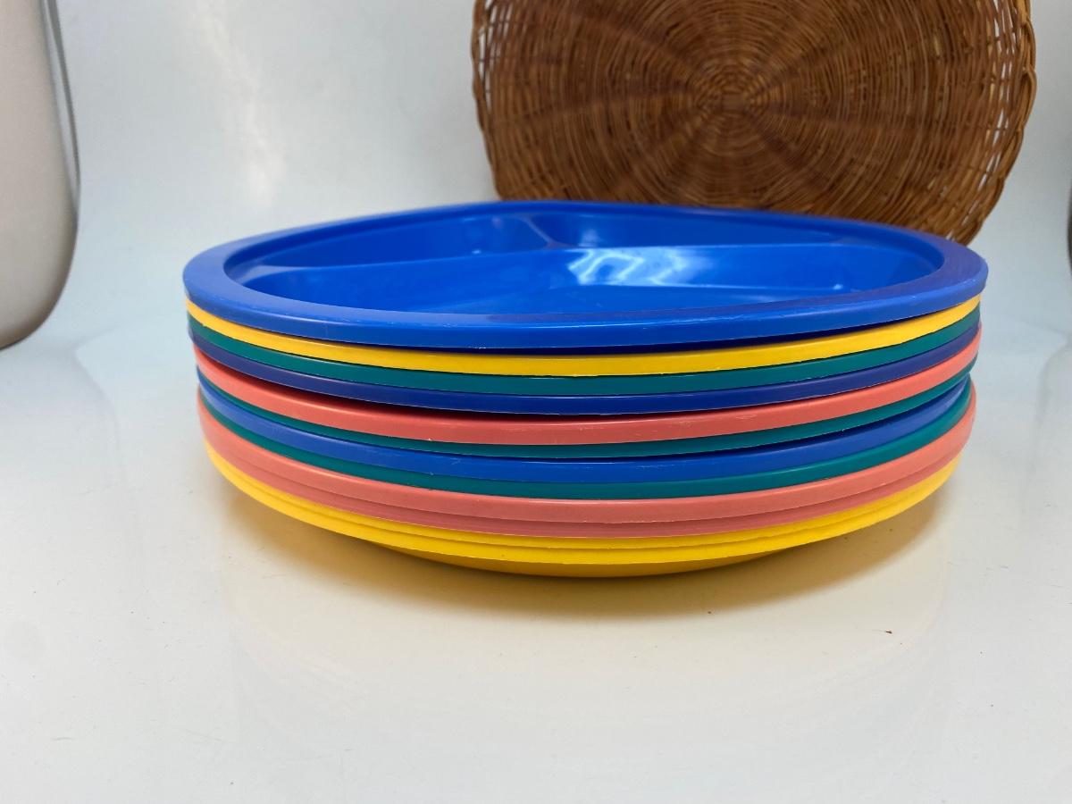 Set of Plastic Divided Picnic BBQ Childrens Kids Plates & Woven Wicker Rattan Paper Plate Holders. In good previously used condition.