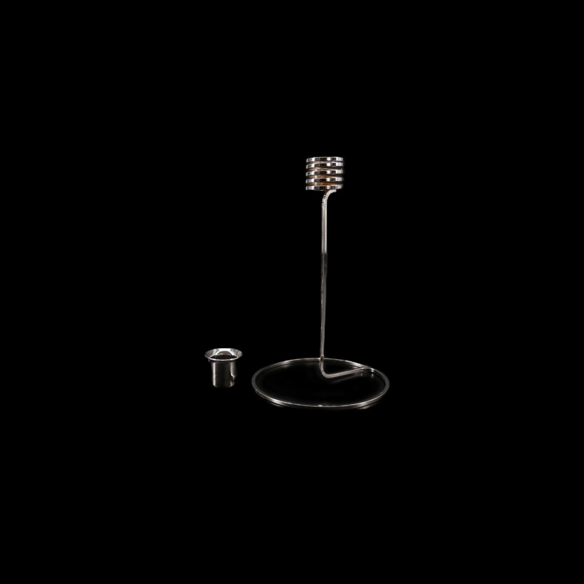 Set of five vintage Royal Copenhagen Denmark platinum plated candlesticks. Mid-century, futuristic style with coil. Excellent condition! Signs of wear and age, but no damage or issues found. Candles not included. Largest measures L 4.25" base x H 7.25". Lot weighs 14 oz. (D77)