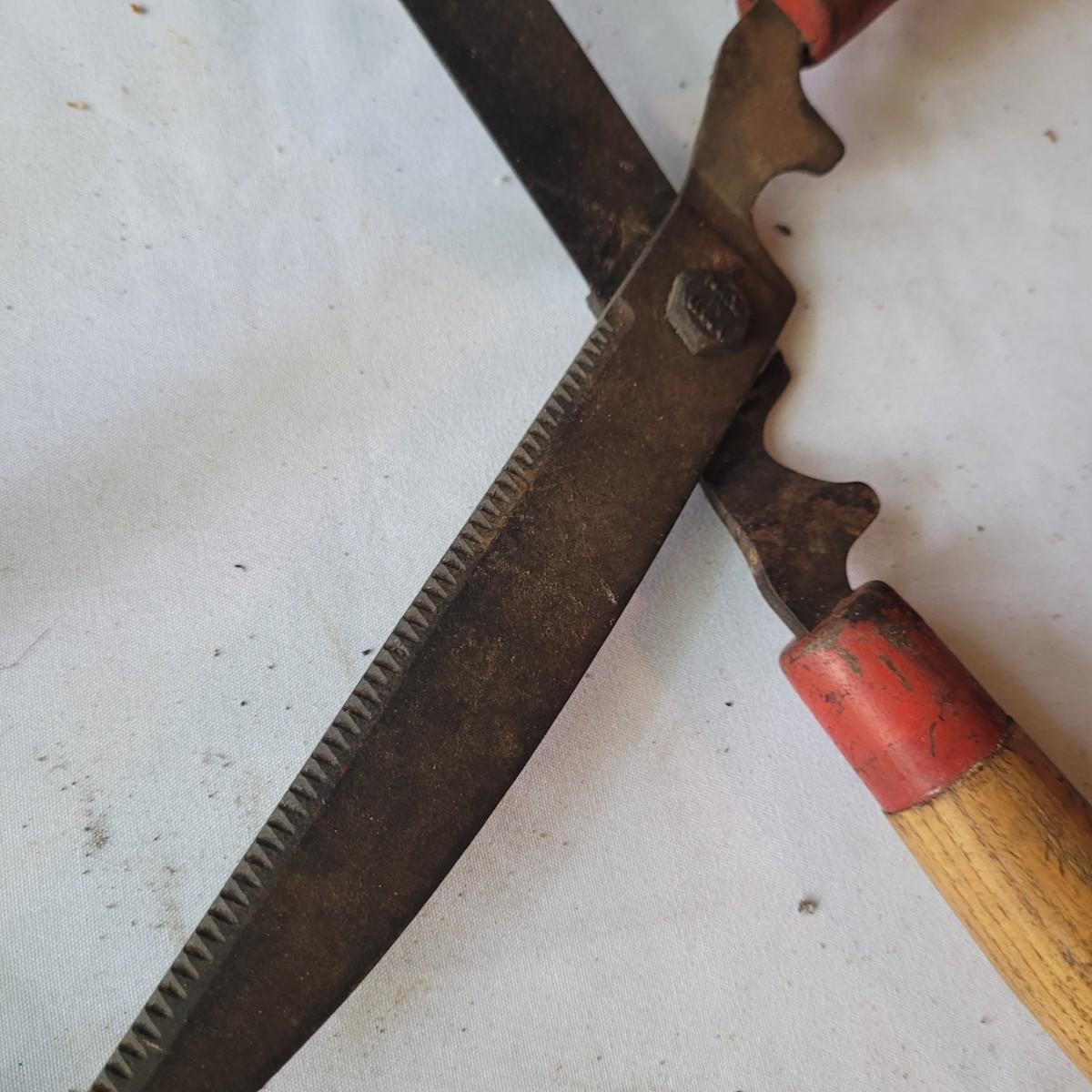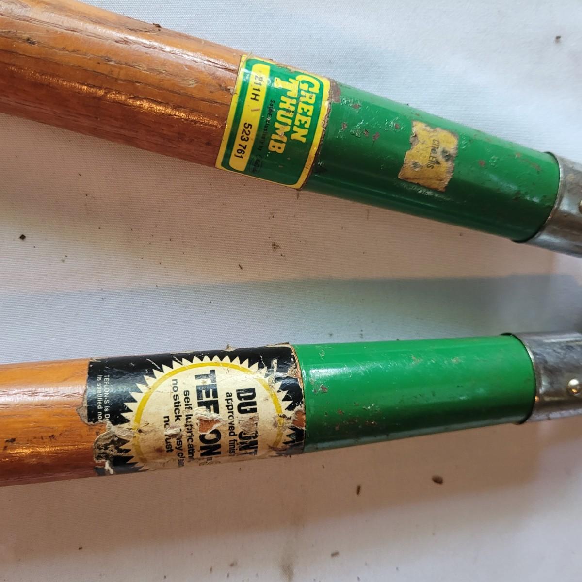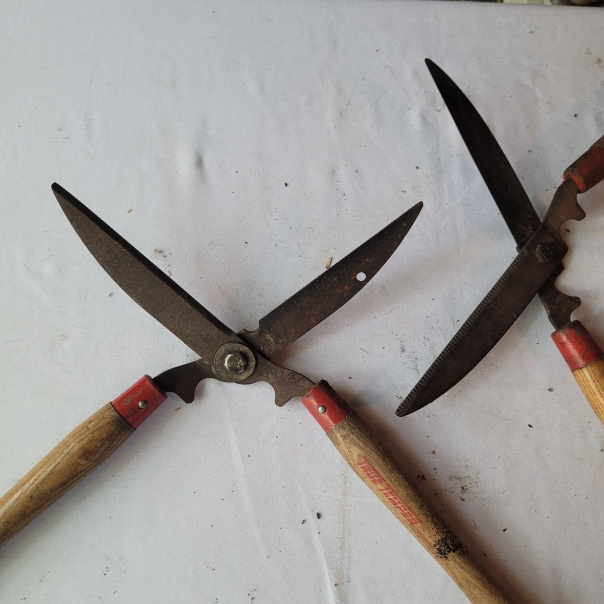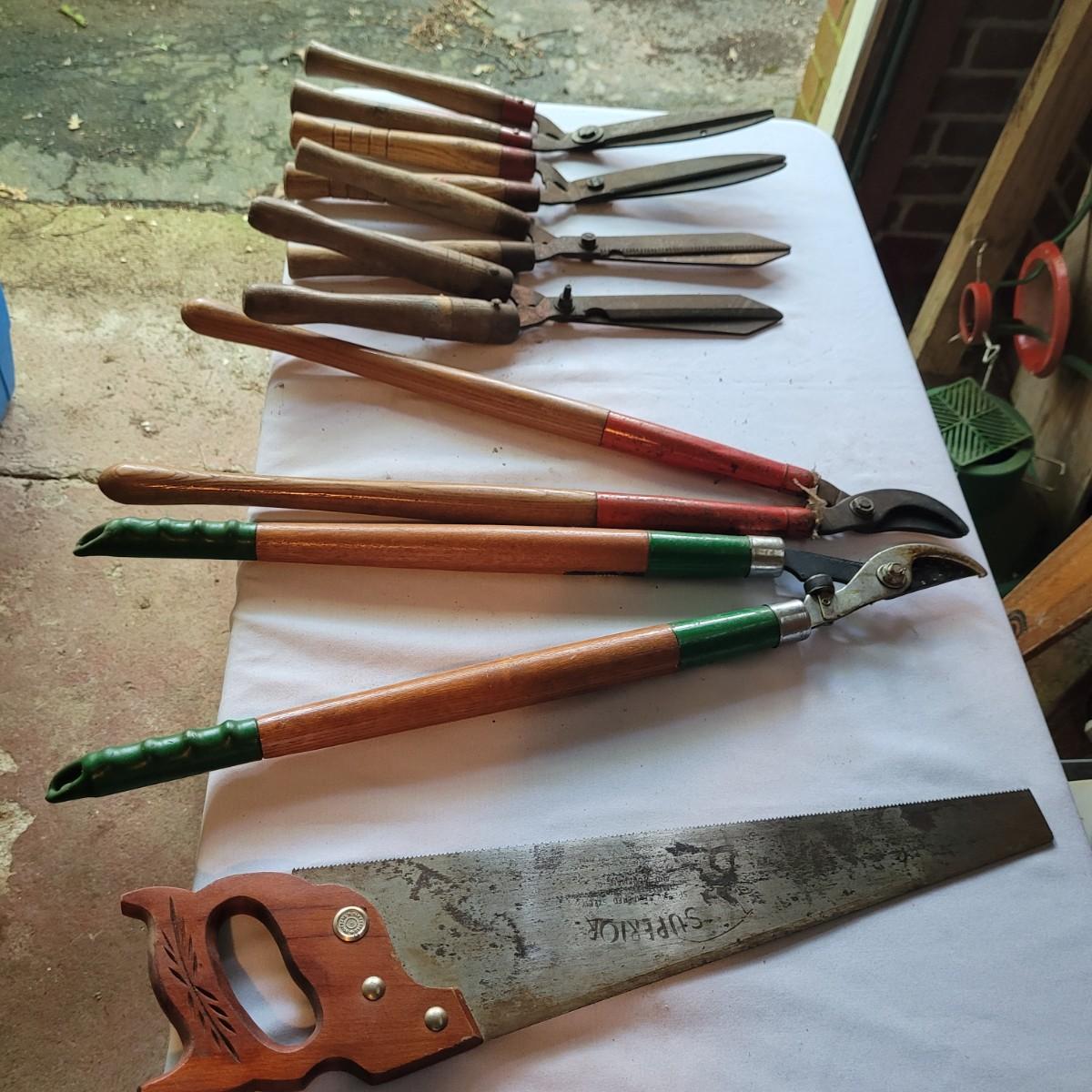 Set of pruning tools, including four hedge shears, two loppers and one saw. Shears are well used and rusted, can possibly be cleaned up and sharpened. Lopper with "Green Thumb" label has Dupont Teflon coating on blade. Saw well used but teeth are still sharp. Saw measures approximately 23.5"L, blade 20.5"L. Local pickup only.
