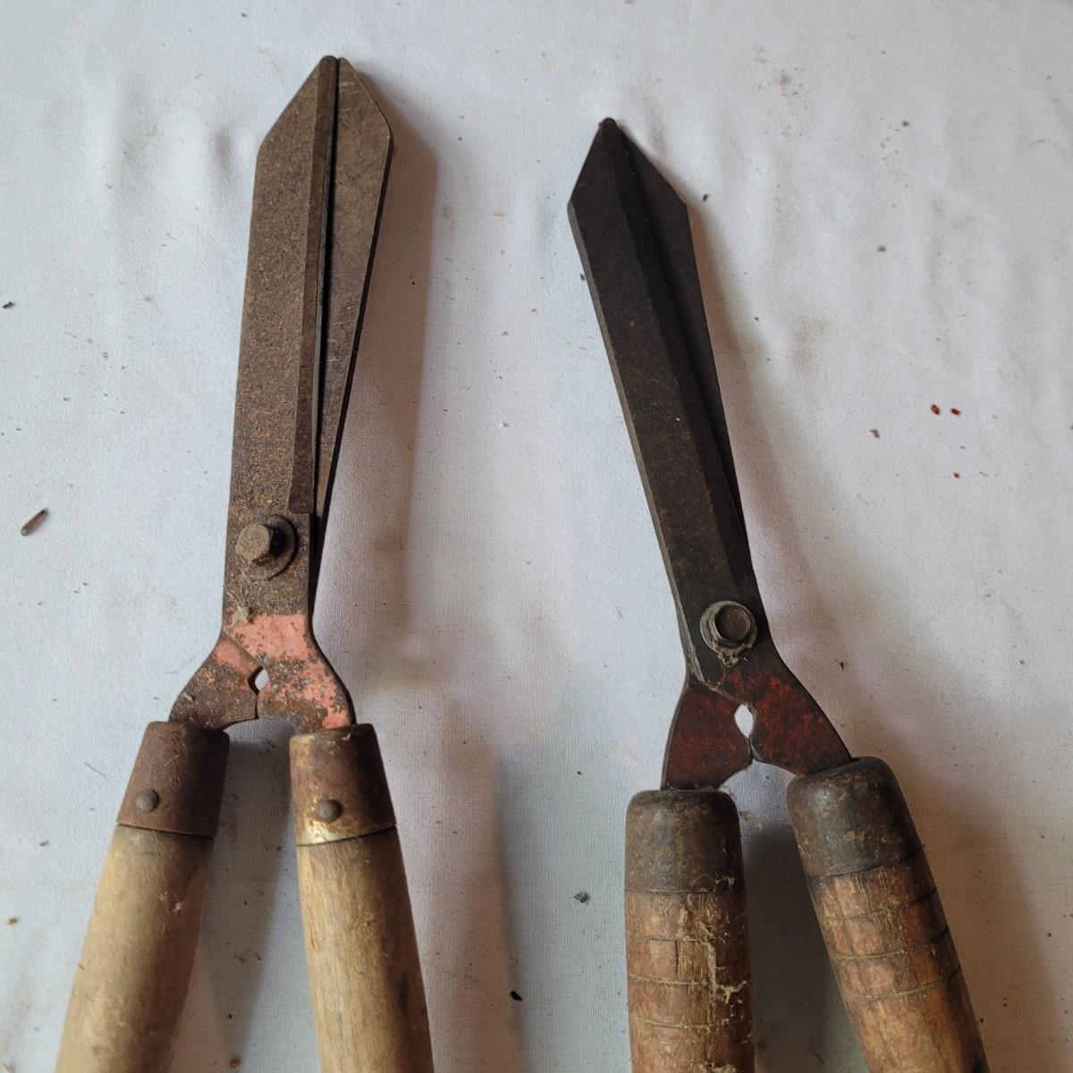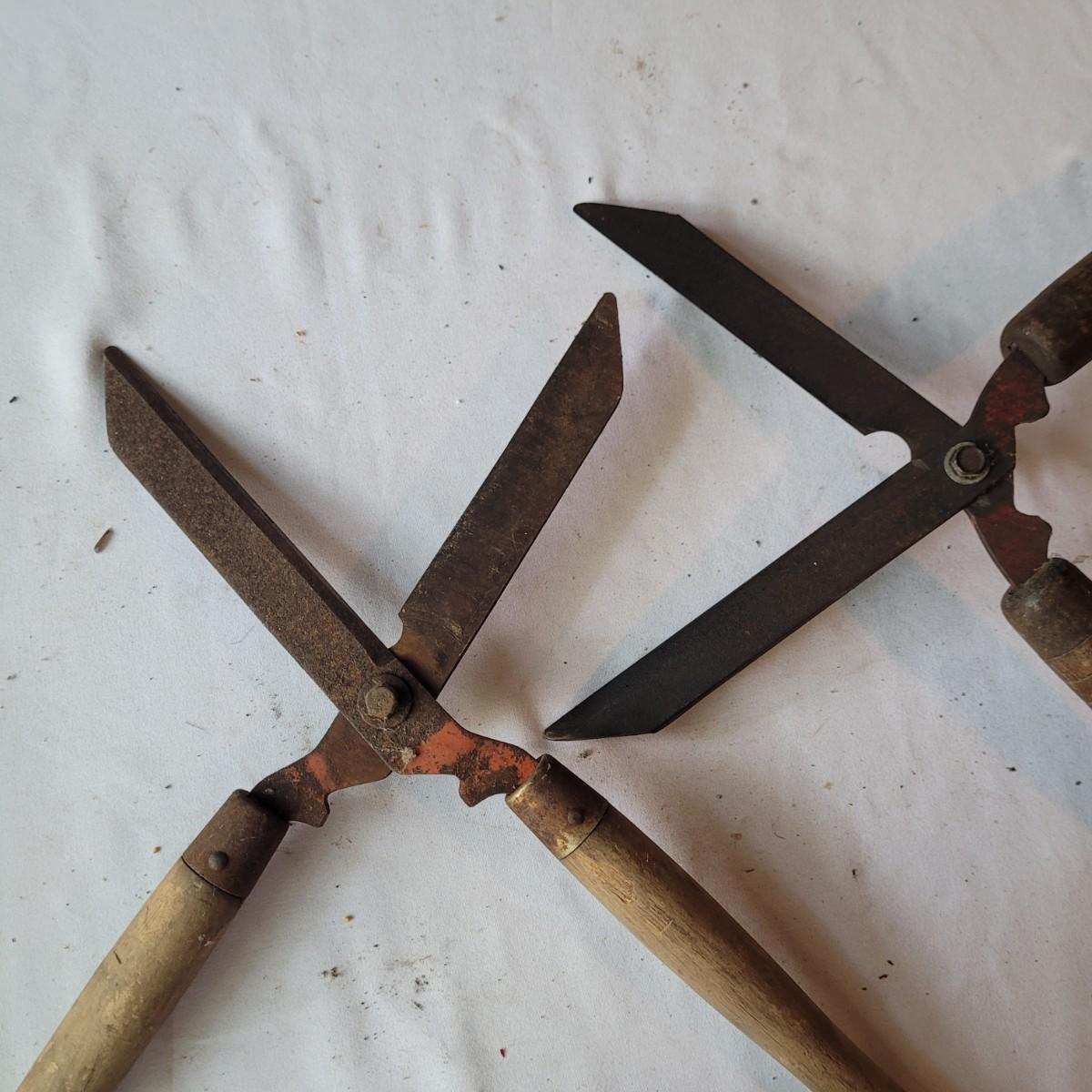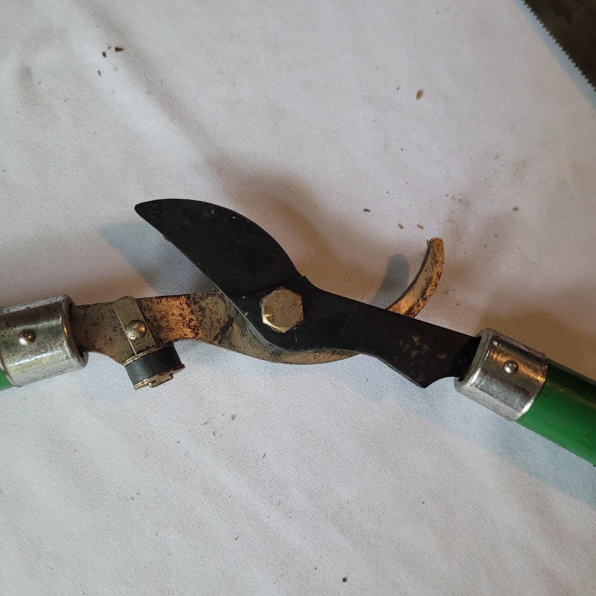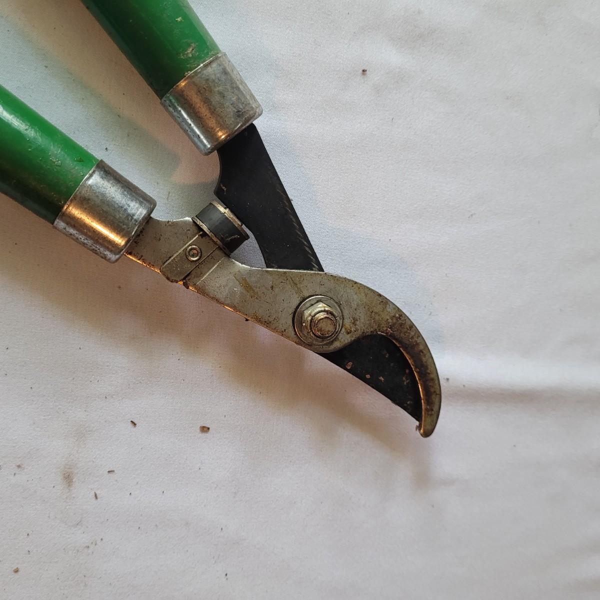 Set of pruning tools, including four hedge shears, two loppers and one saw. Shears are well used and rusted, can possibly be cleaned up and sharpened. Lopper with "Green Thumb" label has Dupont Teflon coating on blade. Saw well used but teeth are still sharp. Saw measures approximately 23.5"L, blade 20.5"L. Local pickup only.