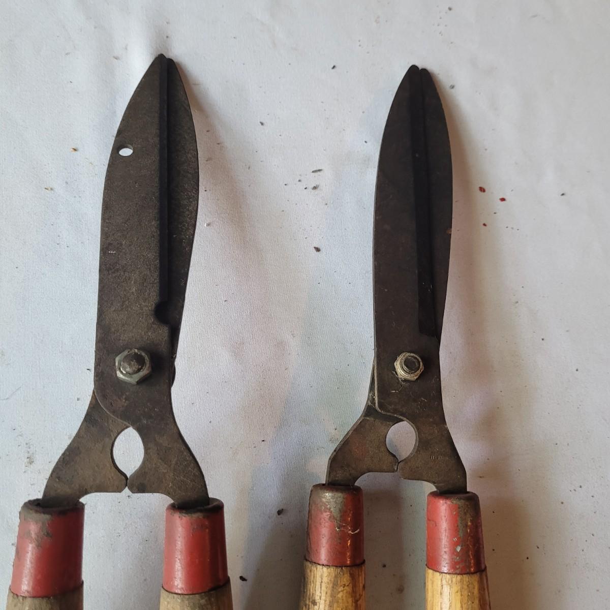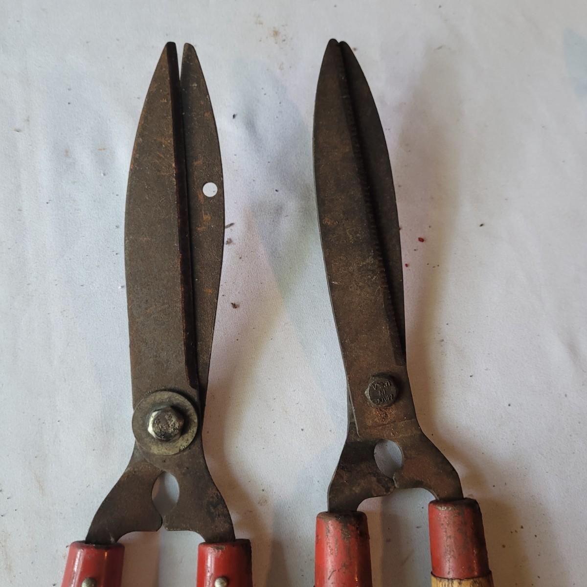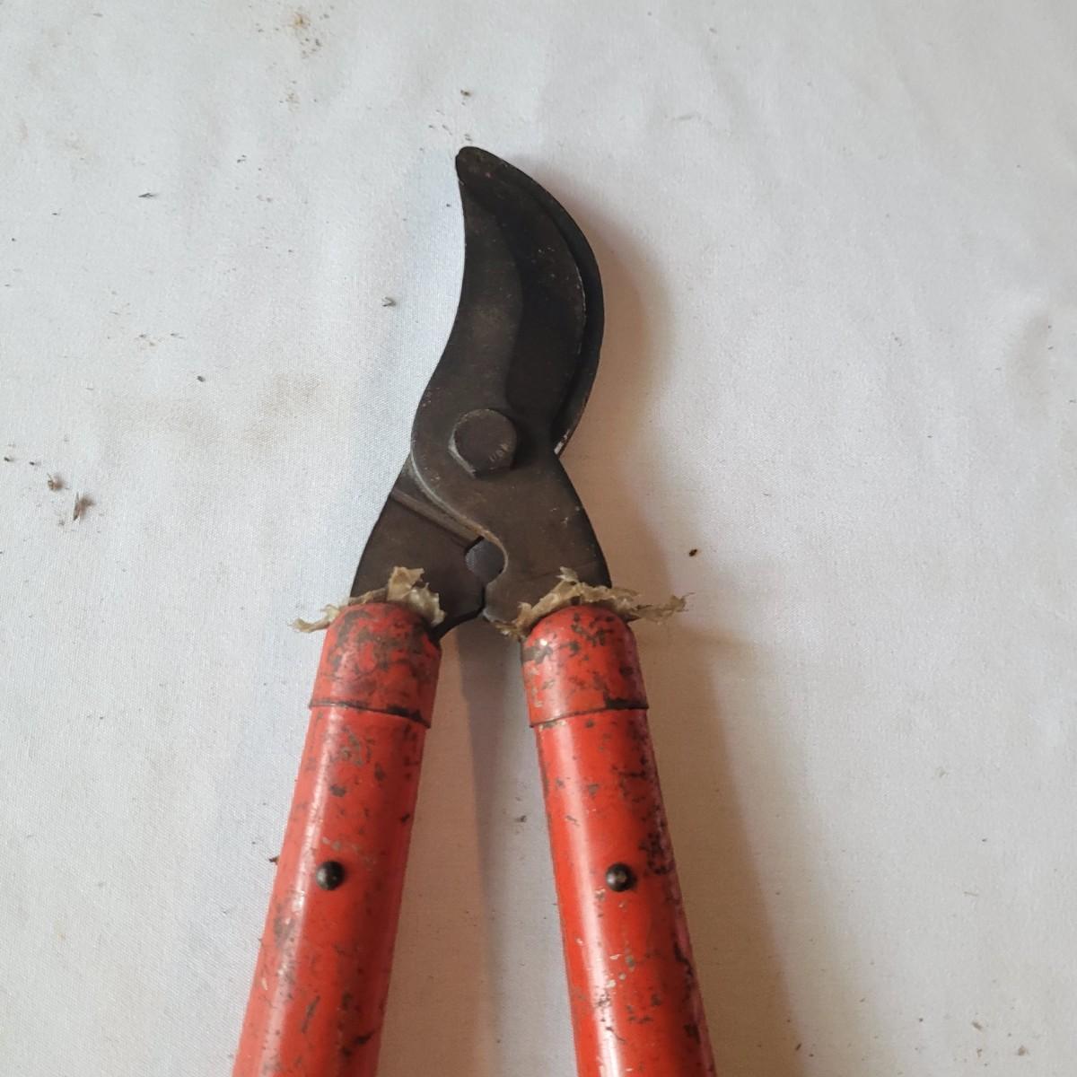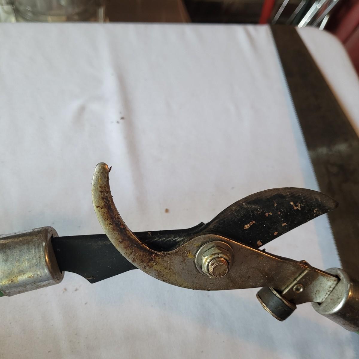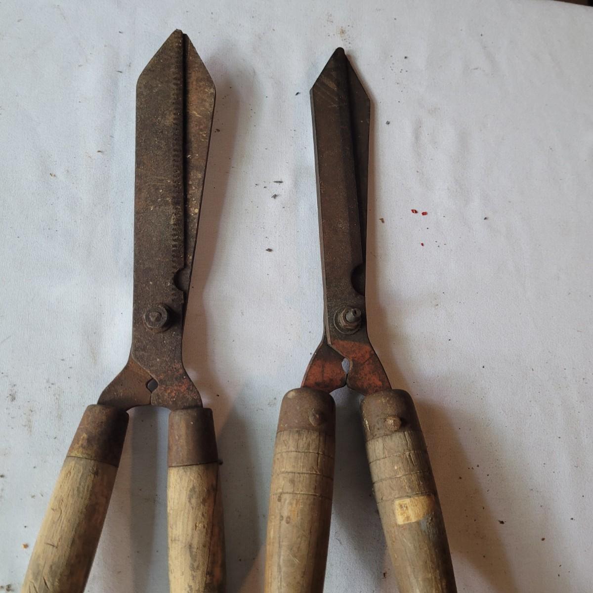 Set of pruning tools, including four hedge shears, two loppers and one saw. Shears are well used and rusted, can possibly be cleaned up and sharpened. Lopper with "Green Thumb" label has Dupont Teflon coating on blade. Saw well used but teeth are still sharp. Saw measures approximately 23.5"L, blade 20.5"L. Local pickup only.