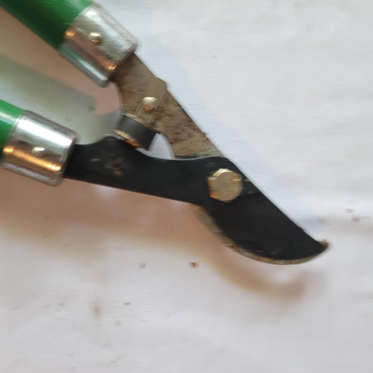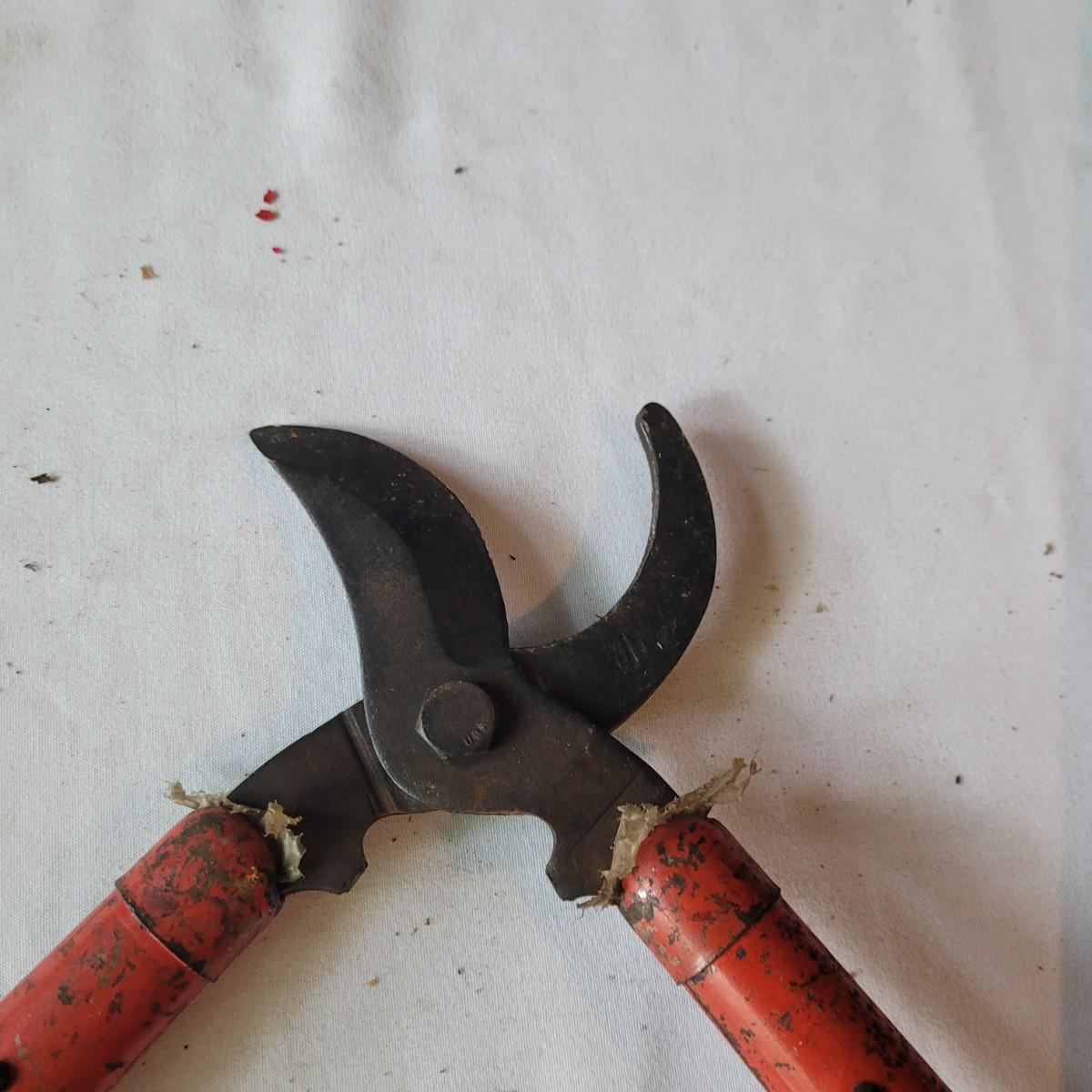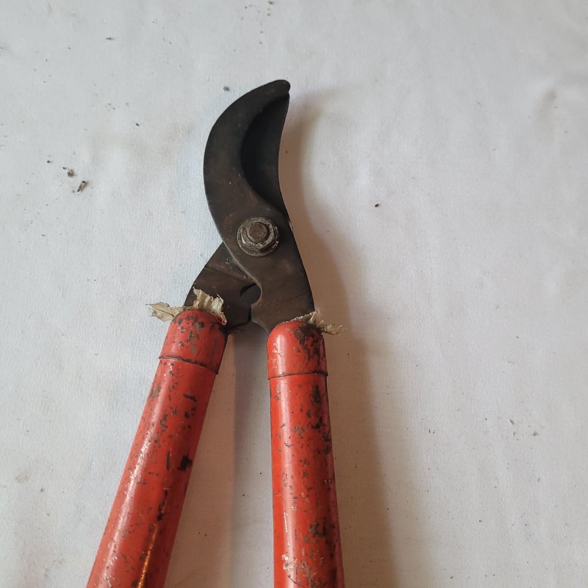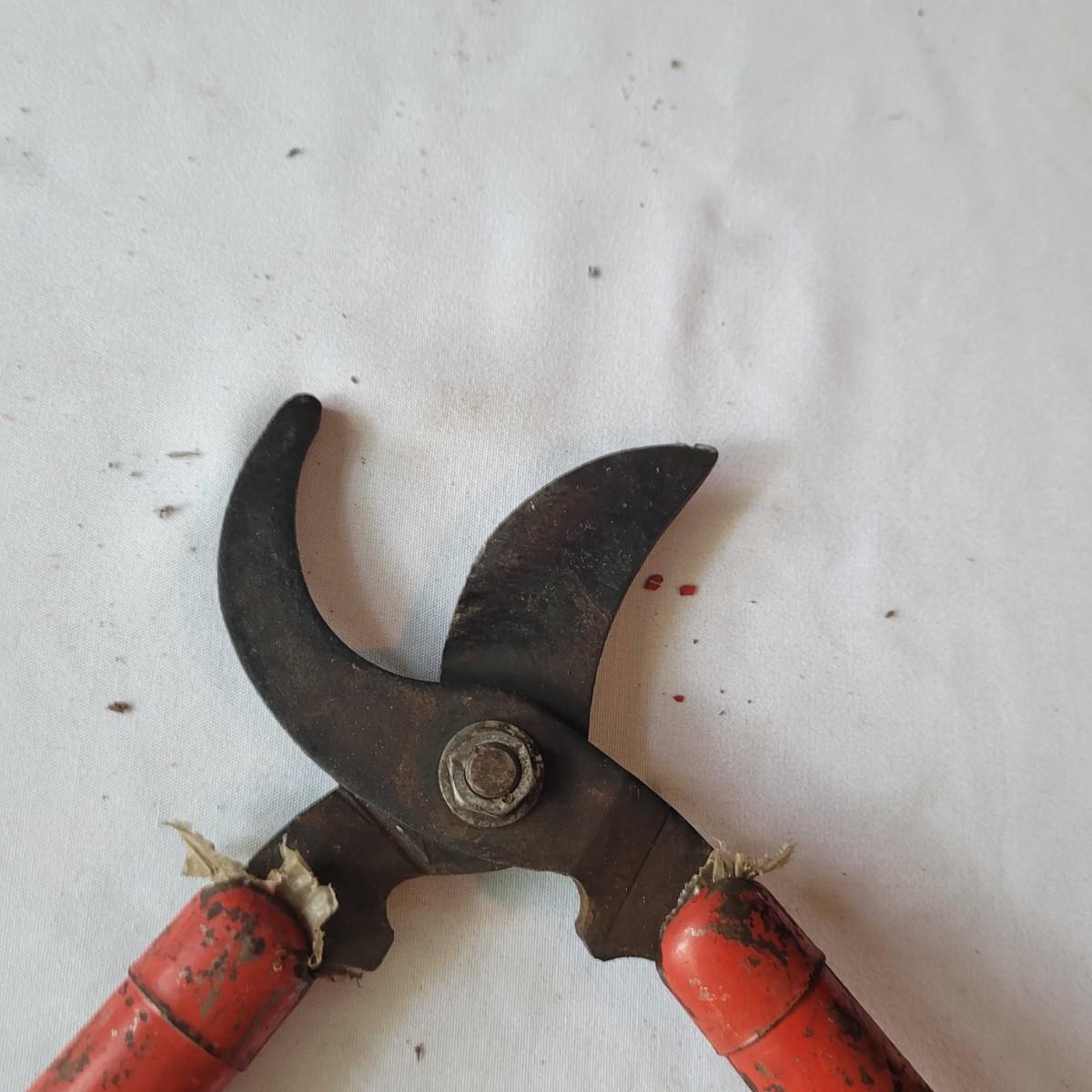 Set of pruning tools, including four hedge shears, two loppers and one saw. Shears are well used and rusted, can possibly be cleaned up and sharpened. Lopper with "Green Thumb" label has Dupont Teflon coating on blade. Saw well used but teeth are still sharp. Saw measures approximately 23.5"L, blade 20.5"L. Local pickup only.