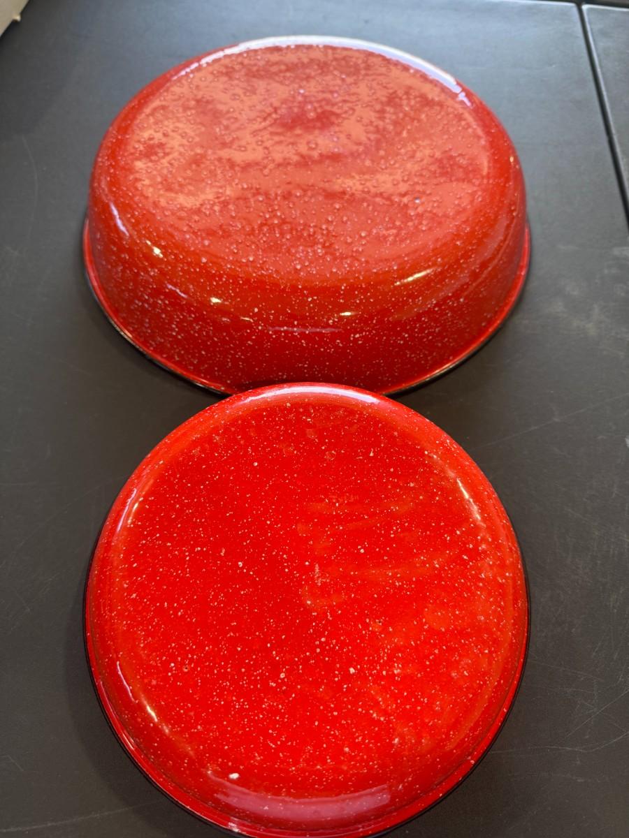 Set of red speckled enamelware bowls