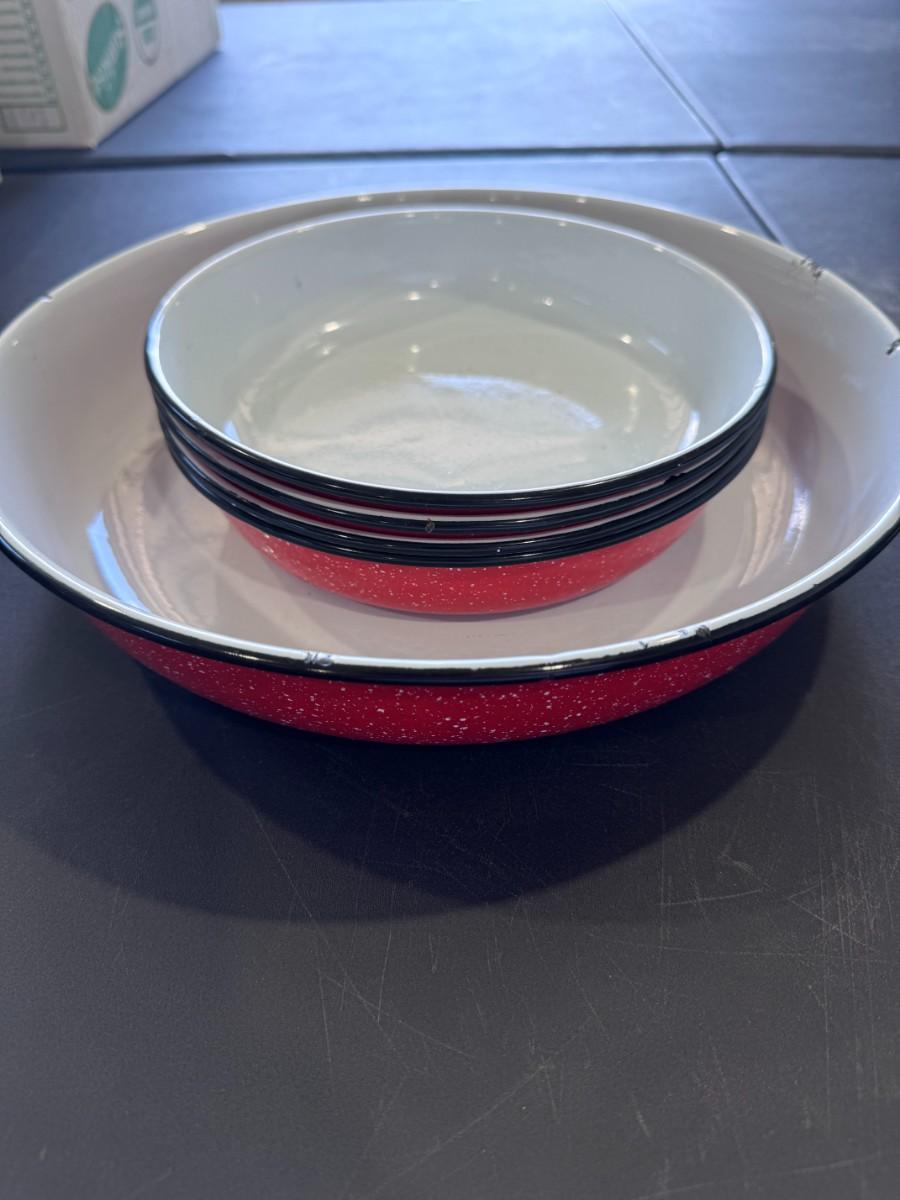 Design: These specific bowls feature a classic red speckled or splatter design with a contrasting black rim and a white interior, creating a rustic and vintage aesthetic.