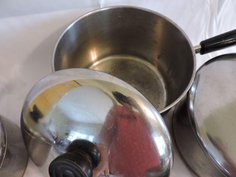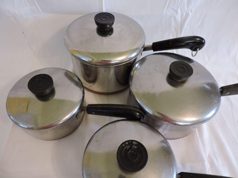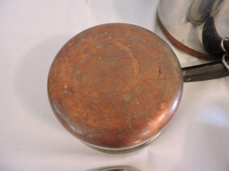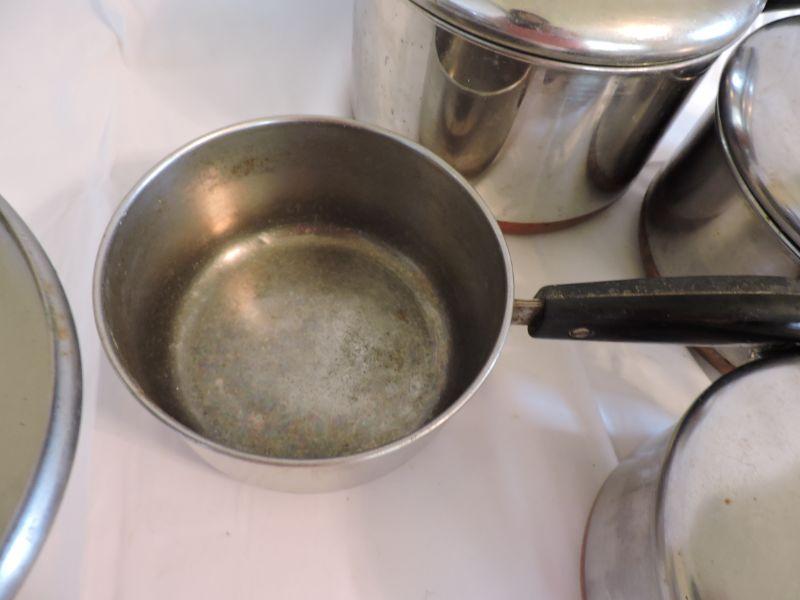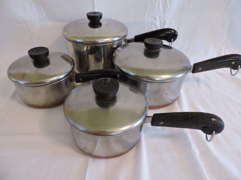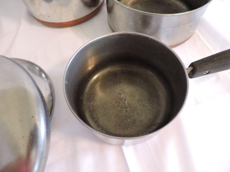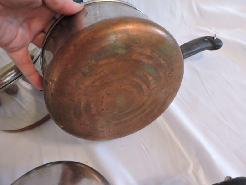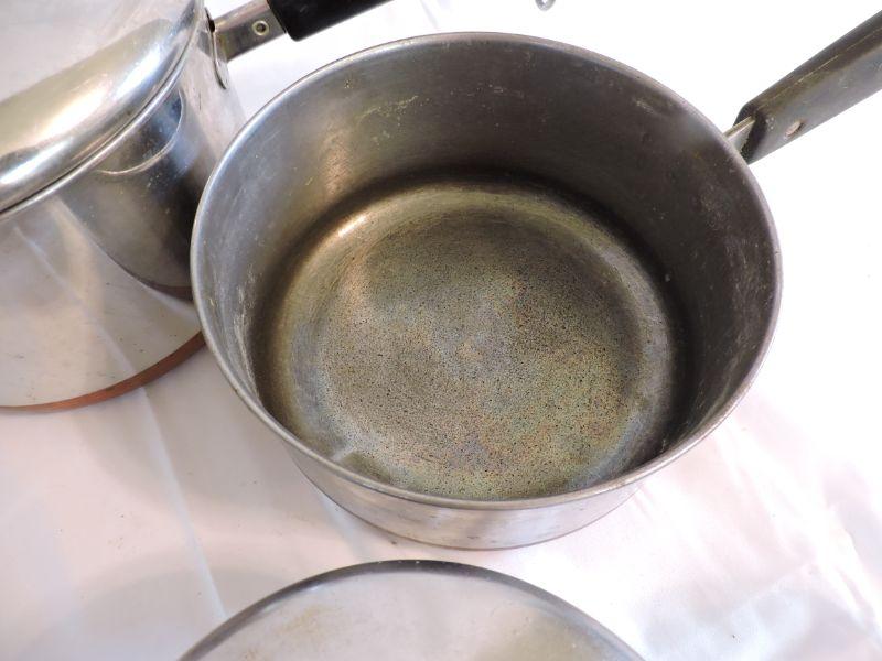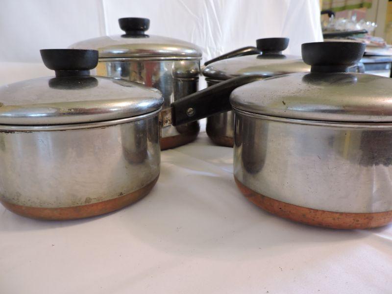 Revere sauce pans with lids and copper bottoms. **Please read Terms and Conditions before placing a bid. Pick up is Saturday, November 30 from 9am to 3pm in Bridgeton, NJ. All sales are final. All sales are as is, where is. Please review all photos. Any props included in photos are not included in listing. All measurements are approximate.