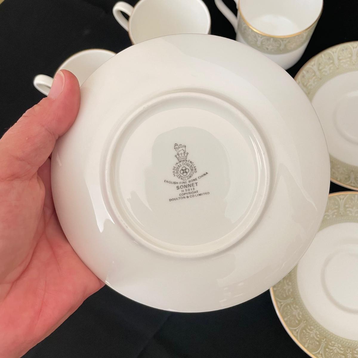 Six lovely teacups with saucers by Royal Doulton. All appear in wonderful shape, their gold rims appear mostly intact. Saucers have a 5.5” diameter and teacups are just over 2.5” tall. See images. Shipping available.
