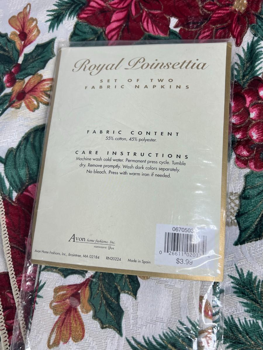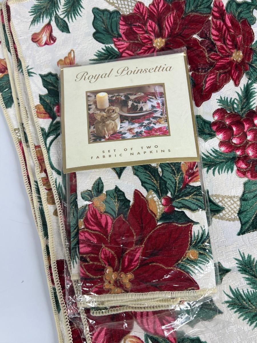Set of Royal Poinsettia Fabric Napkins & Place Mats, there is no signficnat rips or tears to any of the fabric and is in good useable condition. Check pictures for more details and for sizing.
